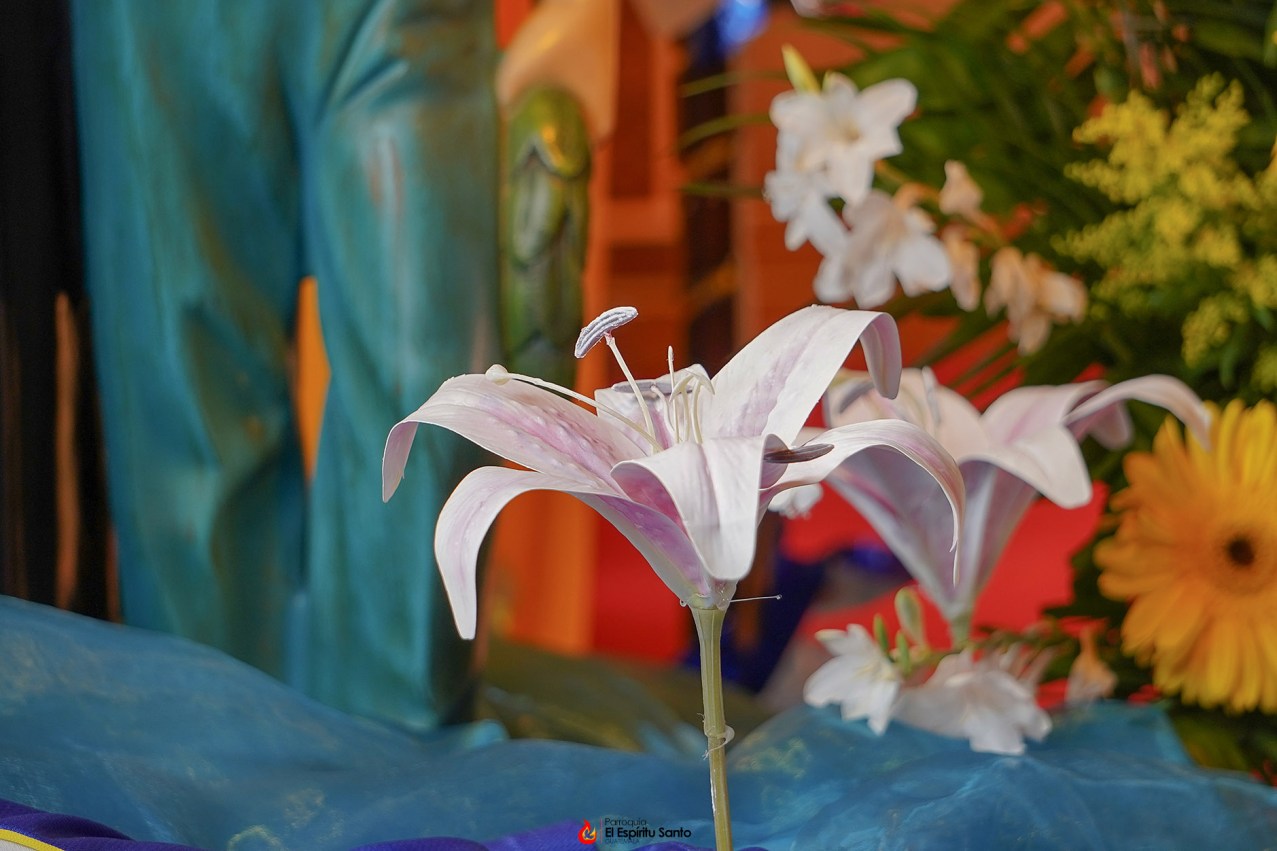 El anda se complementa con dos veladoras, una en cada esquina frontal, y arreglos florales.