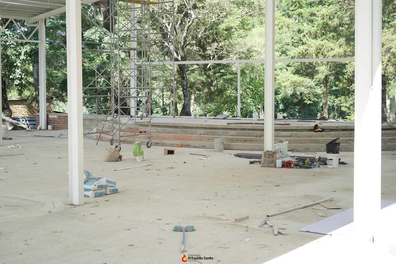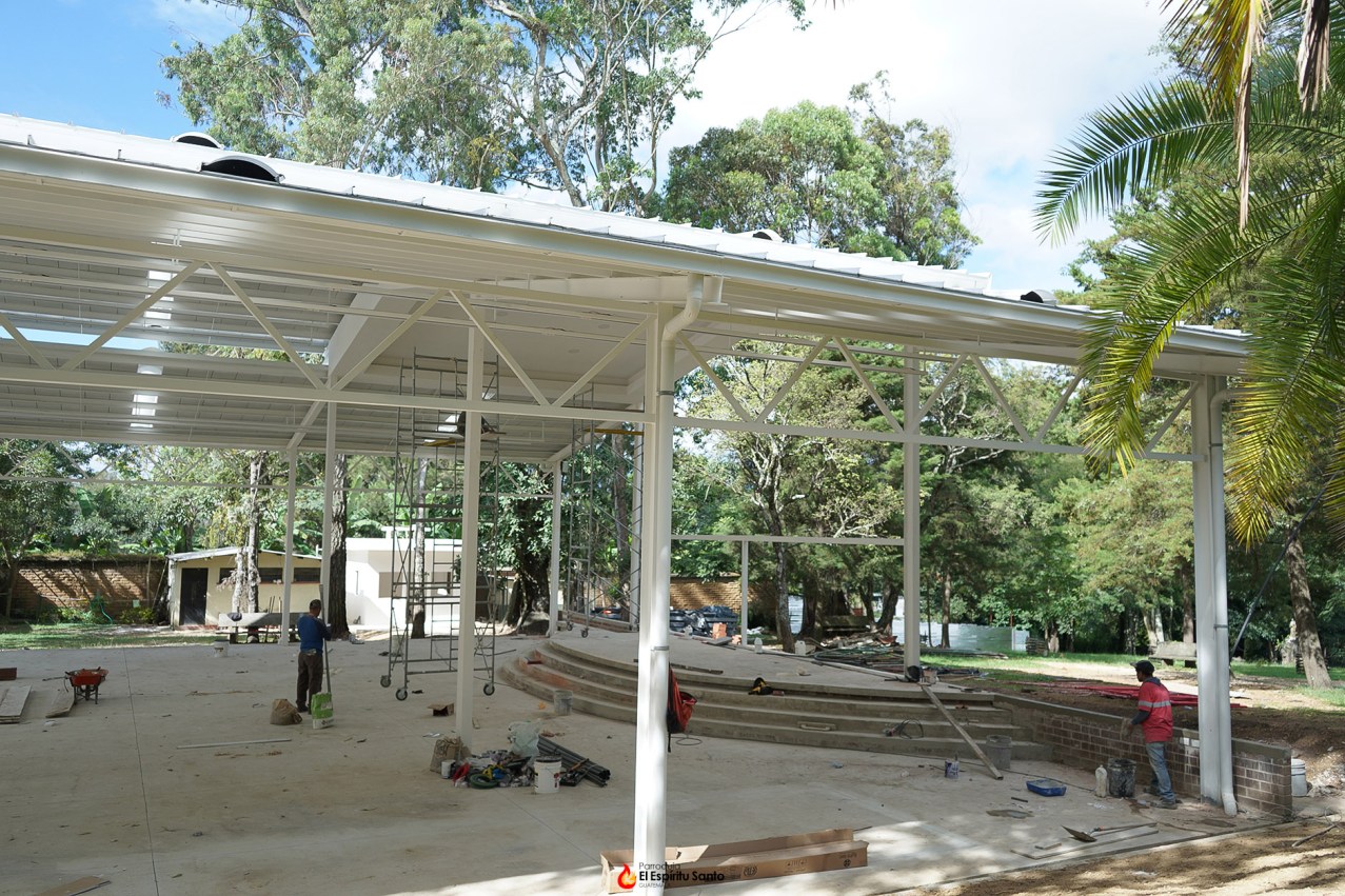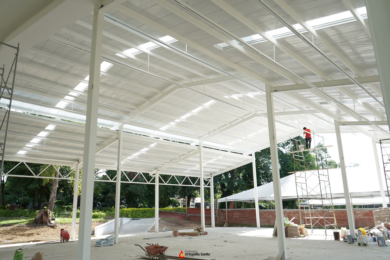 Hemos entrado en la fase final de la remodelación de nuestro Salón Campestre. Durante los últimos meses se ha realizado una remodelación completa del área techada del salón, siendo colocada una nueva estructura metálica de mayor tamaño para brindar más espacio a la feligresía que participa fervientemente en las misas dominicales.