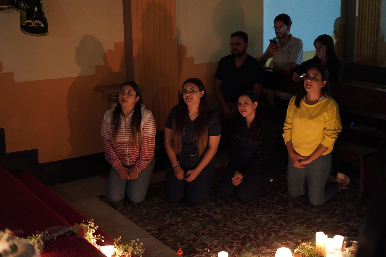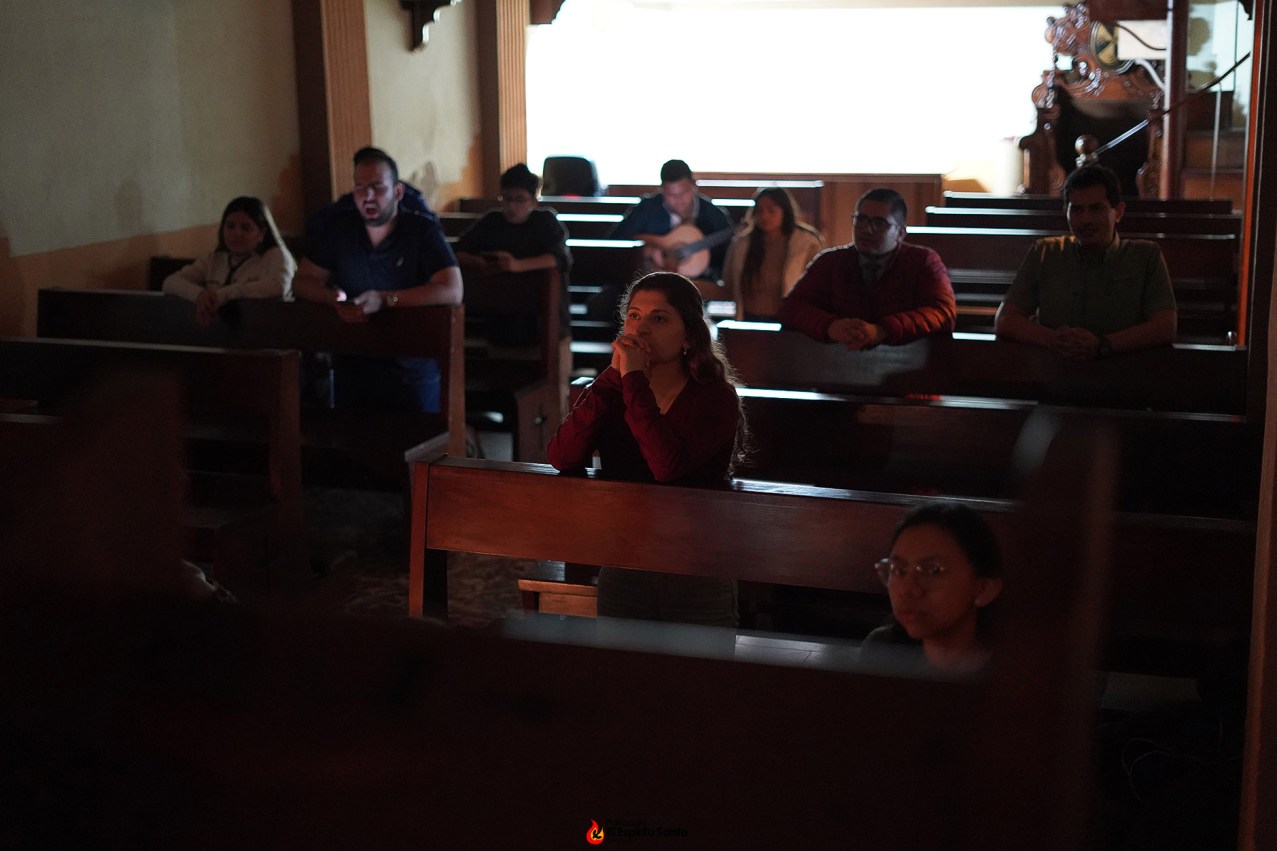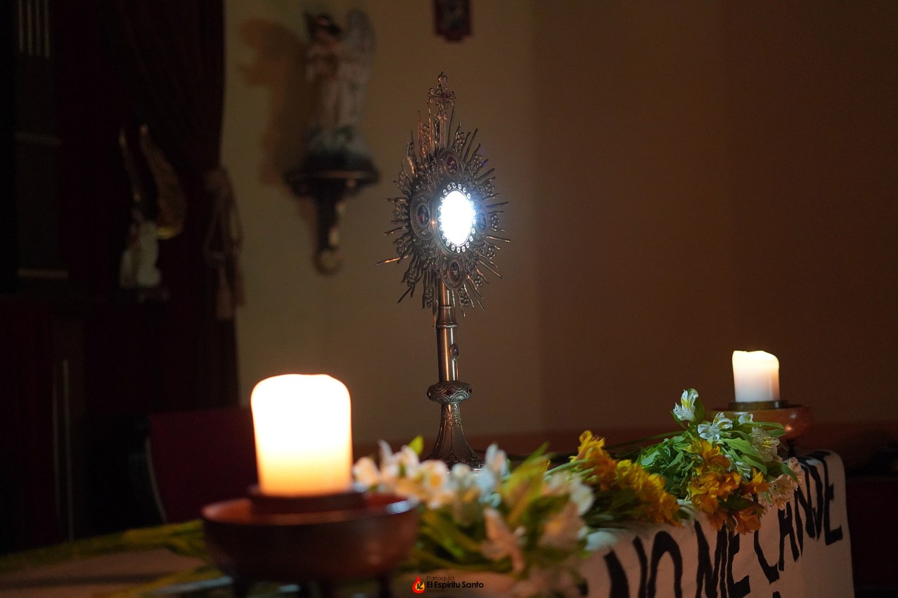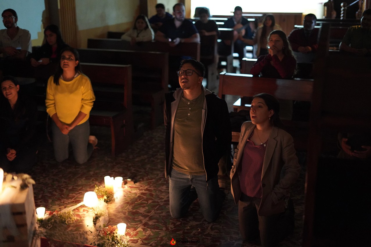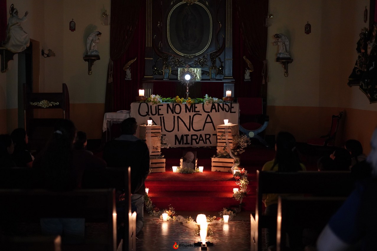 En el altar de nuestra capilla de Guadalupe, Jesús Sacramentado fue expuesto ante los jóvenes que se dieron cita para compartir con Él un momento de íntima oración. Para la ocasión, los integrantes de Hakuna decoraron el altar con flores, velas y una bonita manta con el texto: «Que no me canse nunca de mirarte