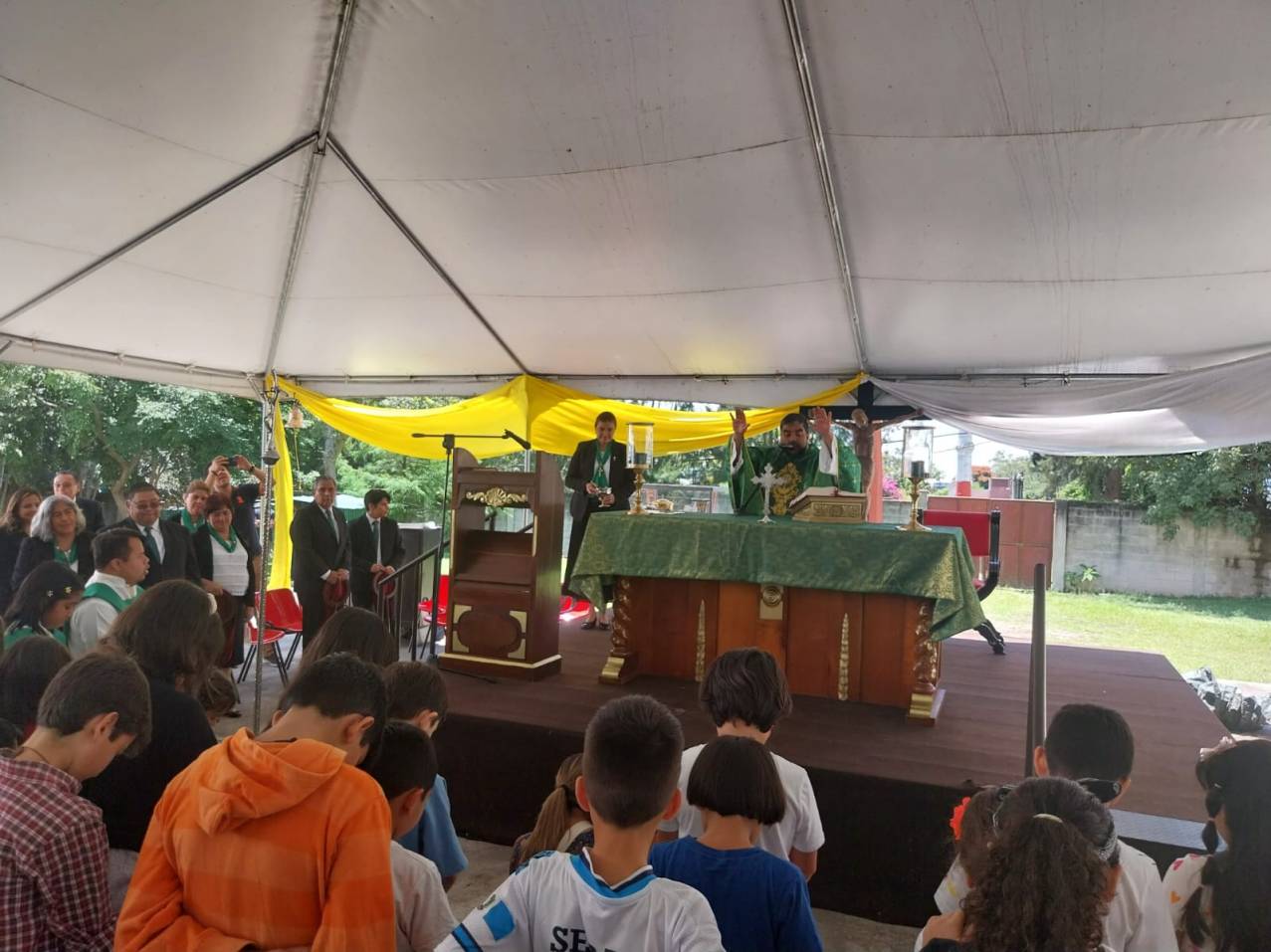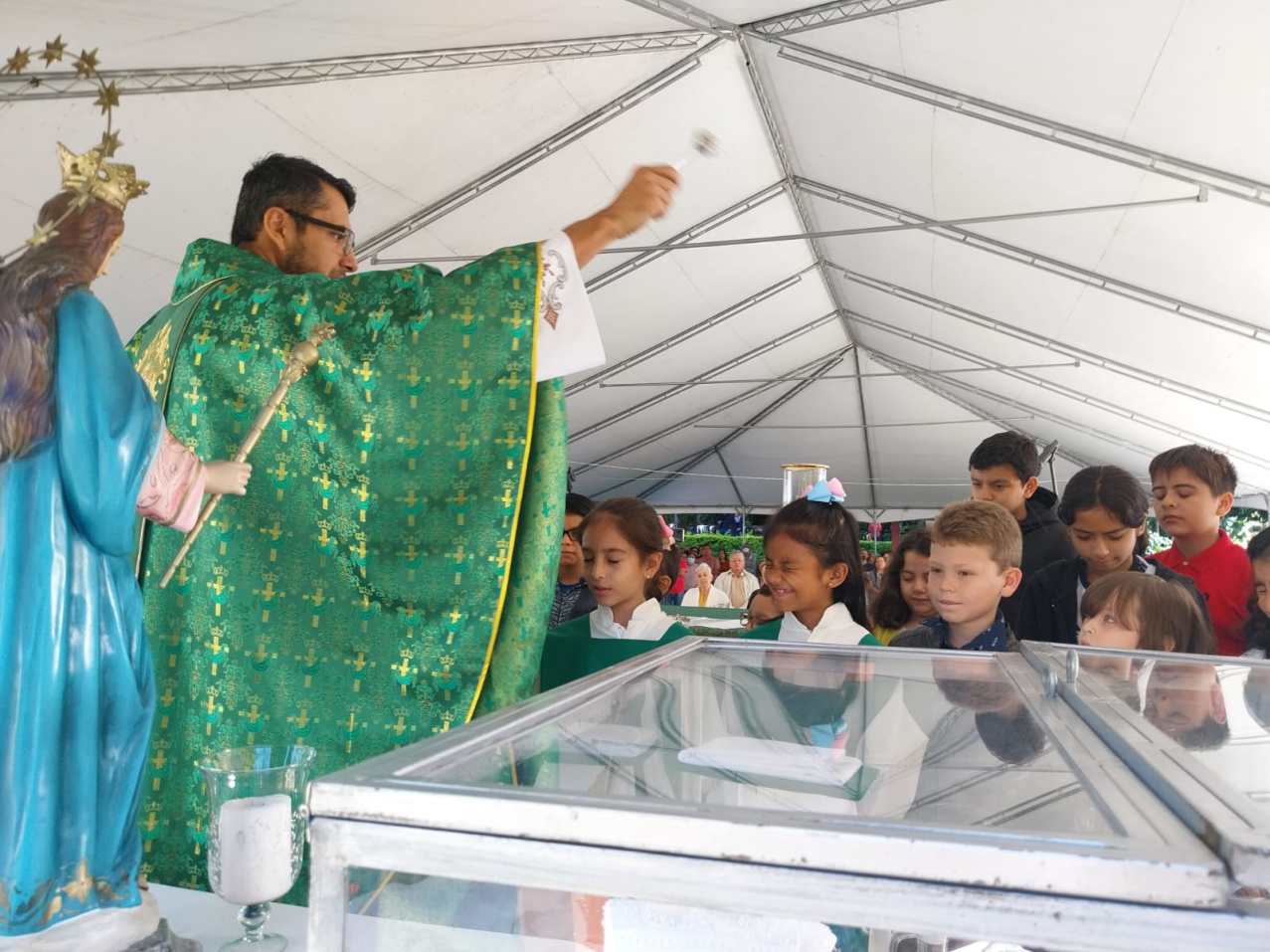 Al finalizar la Santa Misa dominical de 7:30 a.m. este domingo, 01 de octubre, el Padre Marcelo Navarrete, SDB, invitó a todos los pequeños a que se acercaran al altar, delante de la imagen de María Auxiliadora para consagrarlos a ella en este día del niño.
