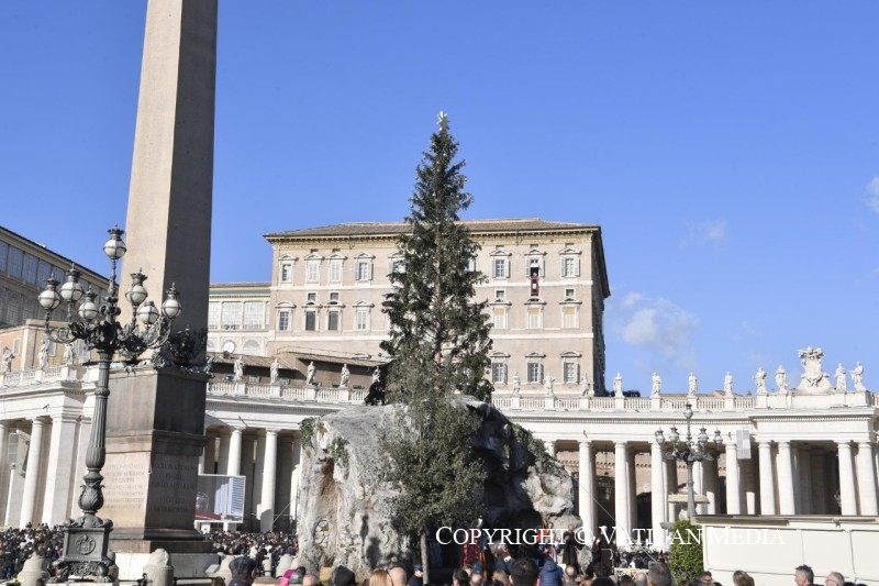 Y continuamos rezando por las poblaciones que sufren a causa de la guerra. Vamos hacia la Navidad: ¿seremos capaces, con la ayuda de Dios, de dar pasos concretos de paz? No es fácil, lo sabemos. Ciertos conflictos tienen raíces históricas profundas. Pero tenemos también el testimonio de hombres y mujeres que han trabajado con sabiduría y paciencia por la convivencia pacífica. ¡Sigamos su ejemplo! Hagamos todo lo posible por afrontar y eliminar las causas de los conflictos. Y mientras tanto – a propósito de los derechos humanos – que se proteja a los civiles, los hospitales y los lugares de culto, que se libere a los rehenes y se garantice la ayuda humanitaria. No nos olvidemos de la martirizada Ucrania, Palestina, Israel.