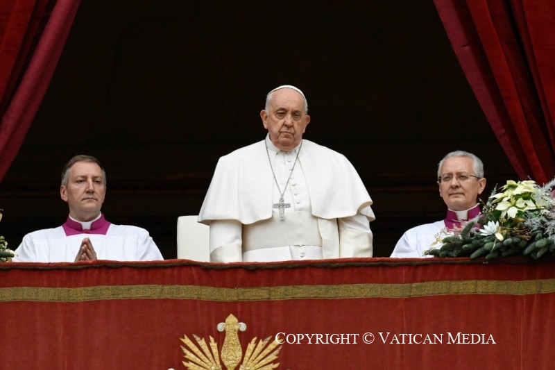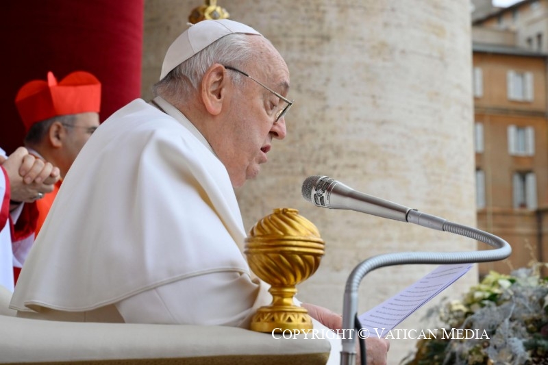 Hermanos y hermanas, en medio de las tinieblas de la tierra, hoy en Belén se ha encendido una llama inextinguible; en medio de la oscuridad del mundo, hoy prevalece la luz de Dios, que «ilumina a todo hombre» (Jn 1,9). ¡Hermanos y hermanas, alegrémonos por esta gracia! Alégrate tú, que has perdido la confianza y las certezas, porque no estás solo, no estás sola: ¡Cristo ha nacido por ti! Alégrate tú, que has abandonado la esperanza, porque Dios te tiende su mano; no te señala con el dedo, sino que te ofrece su manito de Niño para liberarte de tus miedos, para aliviarte de tus fatigas y mostrarte que a sus ojos eres valioso como ningún otro. Alégrate tú, que en el corazón no encuentras la paz, porque se ha cumplido la antigua profecía de Isaías: «Un niño nos ha nacido, un hijo nos ha sido dado […] y se le da por nombre: […] Príncipe de la paz» (9,5). La Escritura revela que su paz, su reino no tendrán fin (cf. 9,6).