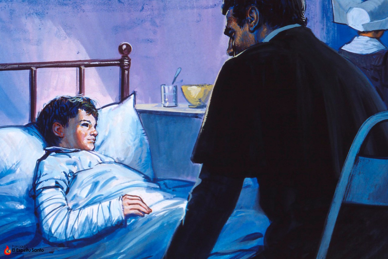 Fue entonces Don Bosco a preparar a su joven amigo para la muerte, pero he aquí que al llegar a la puerta de la habitación, apareció ante sus ojos una maravillosa visión: vio una hermosísima paloma que esparcía a su alrededor una vivísima luz que iluminaba toda la habitación. Llevaba en el pico un ramo de olivo y giraba revoloteando alrededor del jovencito una y otra vez. De pronto se detuvo el vuelo sobre la cabeza del enfermo y tocó sus labios con el ramo de olivo, que dejó luego caer sobre su cabeza. Con destellos de luz aún más viva, desapareció.