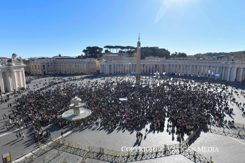 En estos días recemos especialmente por la unidad de los cristianos, y no nos cansemos de invocar al Señor por la paz en Ucrania, en Israel y en Palestina, y en tantas otras partes del mundo: son siempre los más débiles los que sufren la falta de ella. Pienso en los pequeños, en tantísimos niños heridos y asesinados, en los privados de afecto, privados de sueños y de futuro. ¡Sintamos la responsabilidad de rezar y construir la paz para ellos!