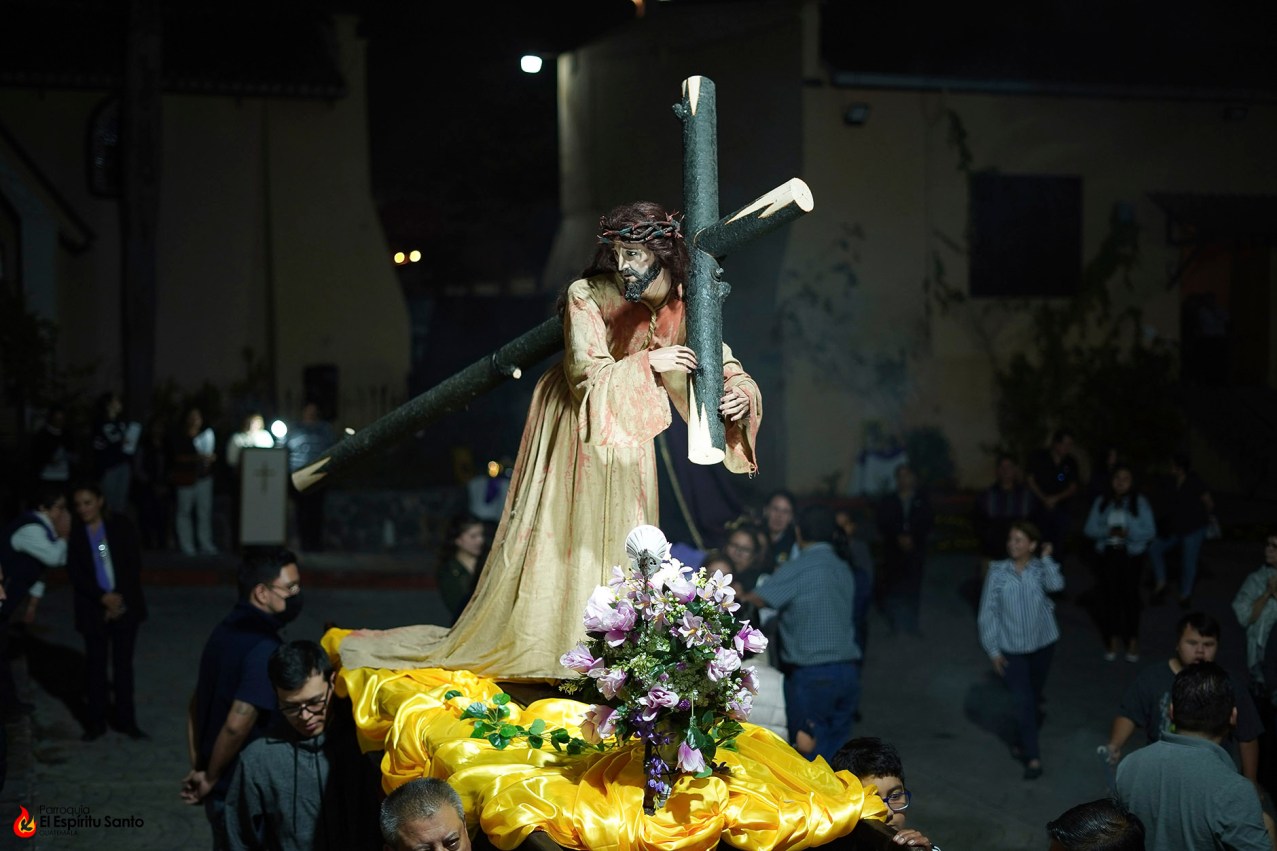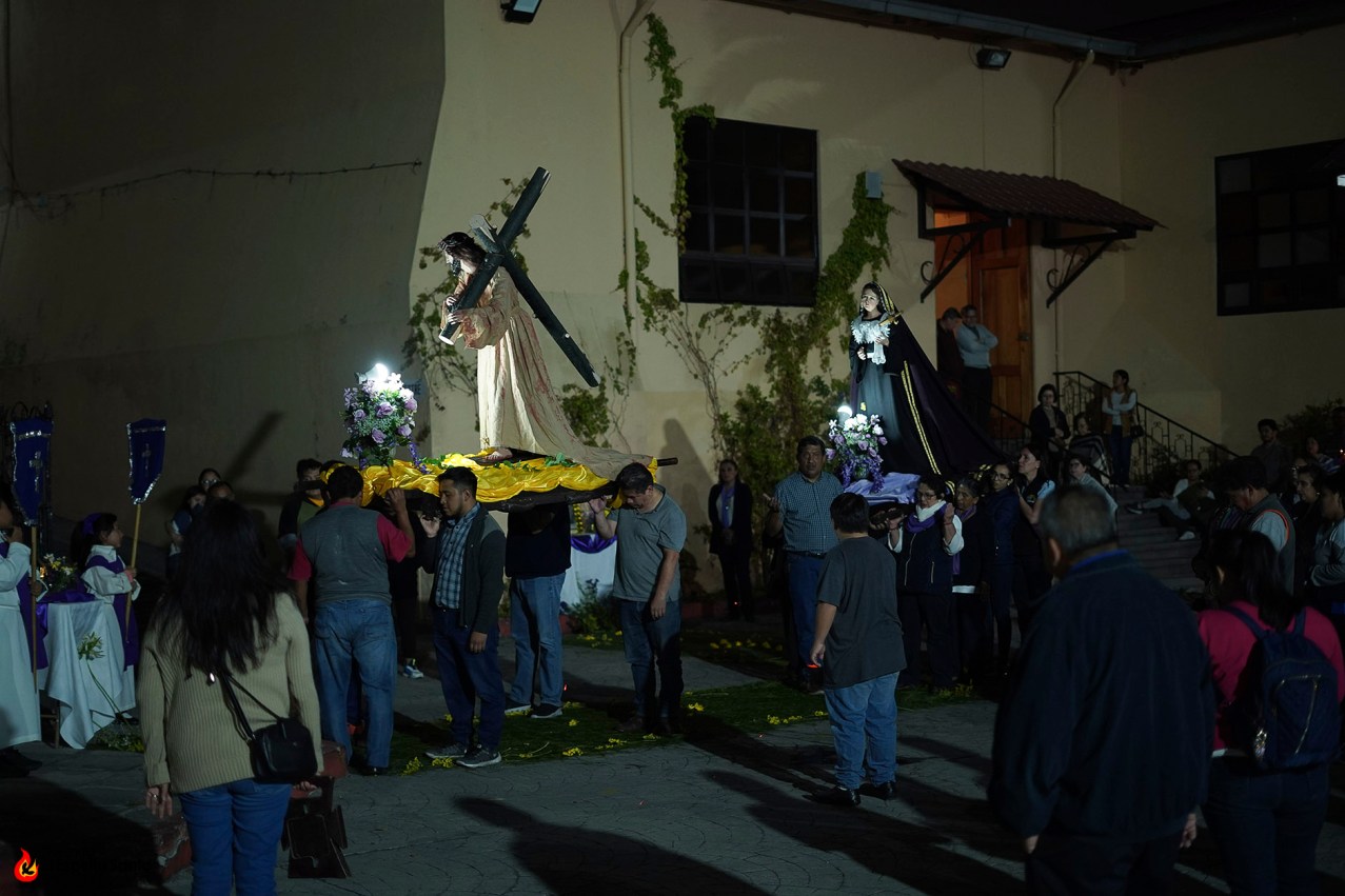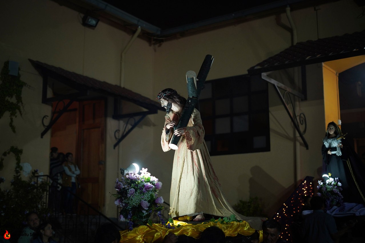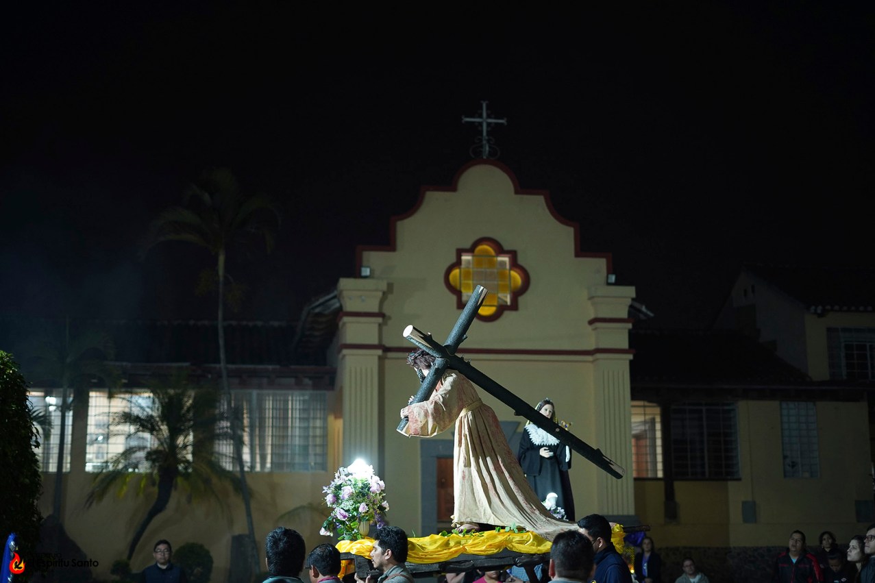 Al finalizar la Misa de 7:00 p.m. dio inicio la procesión con las veneradas imágenes por el parqueo interno, visitando cada uno de los catorce altares que los grupos parroquiales han realizado y en el que cada uno representa una estación del Vía Crucis.
