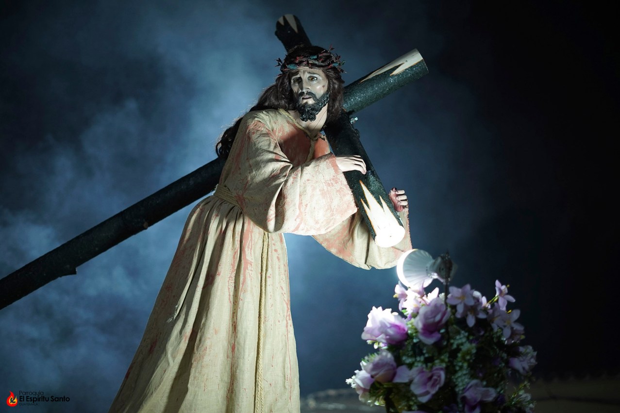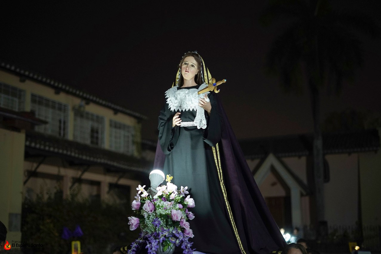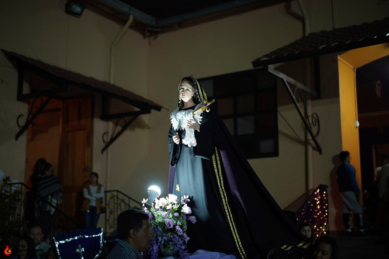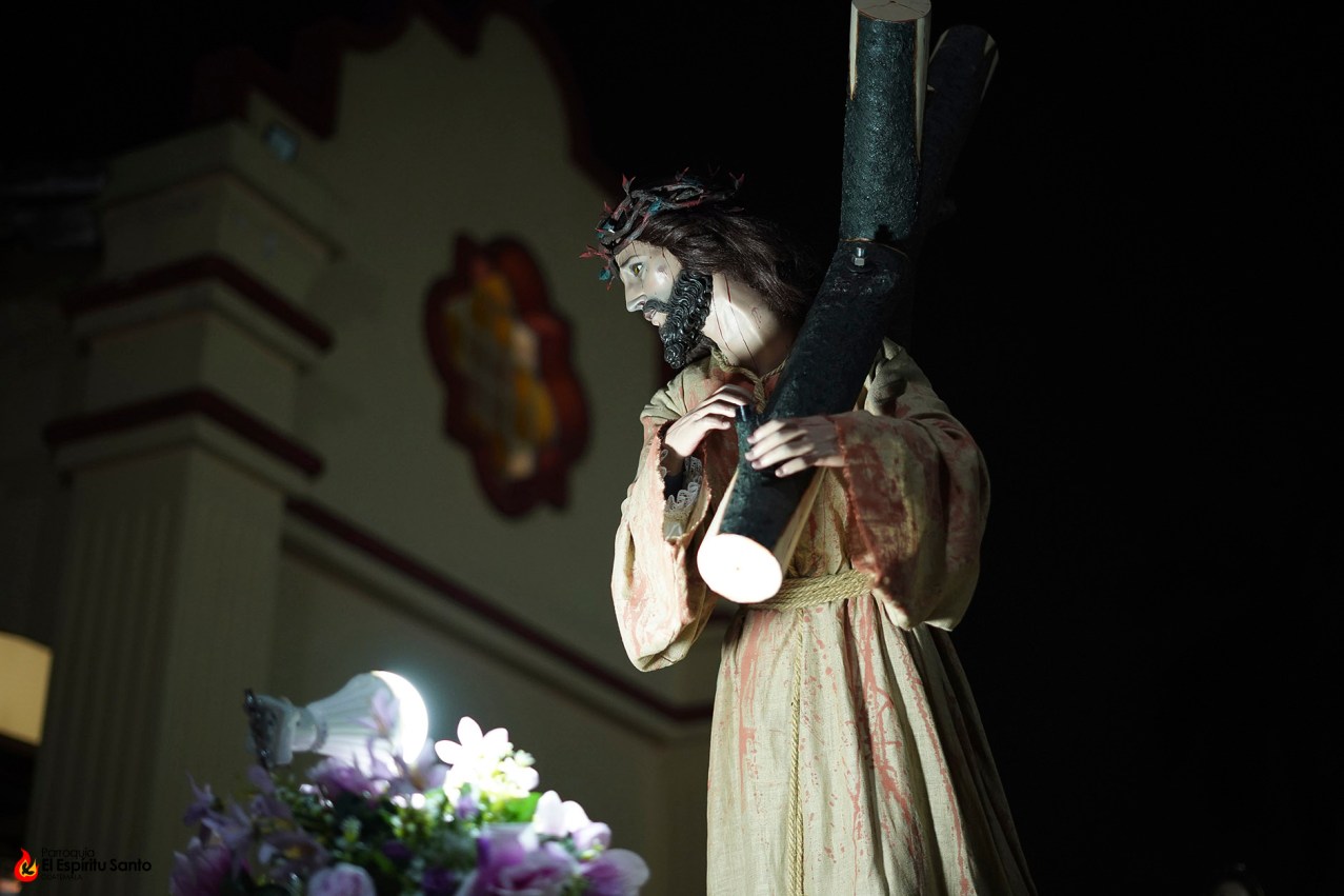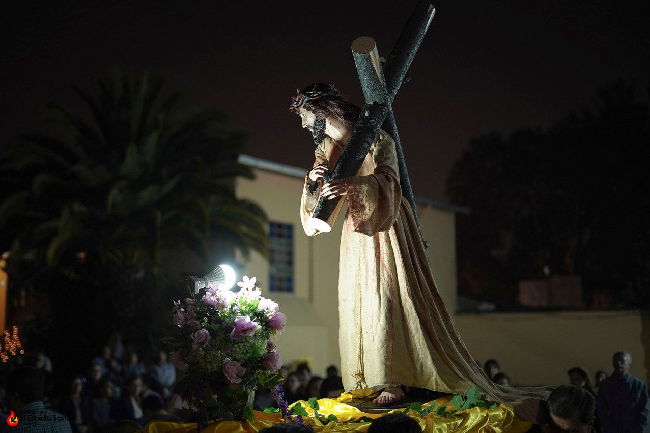 Al finalizar la Misa de 7:00 p.m. dio inicio la procesión con las veneradas imágenes por el parqueo interno, visitando cada uno de los catorce altares que los grupos parroquiales han realizado y en el que cada uno representa una estación del Vía Crucis.