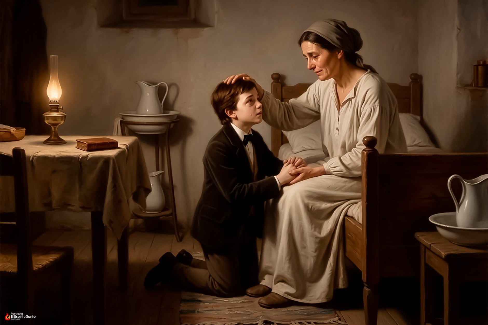 La madre, que de él había recibido sólo consuelos, se sintió enternecida y, conteniendo a duras penas las lágrimas, le consoló diciéndole: «Vete tranquilo, querido Domingo, pues todo está perdonado; pide a Dios que te conserve siempre bueno y ruega también por mí y por tu padre».