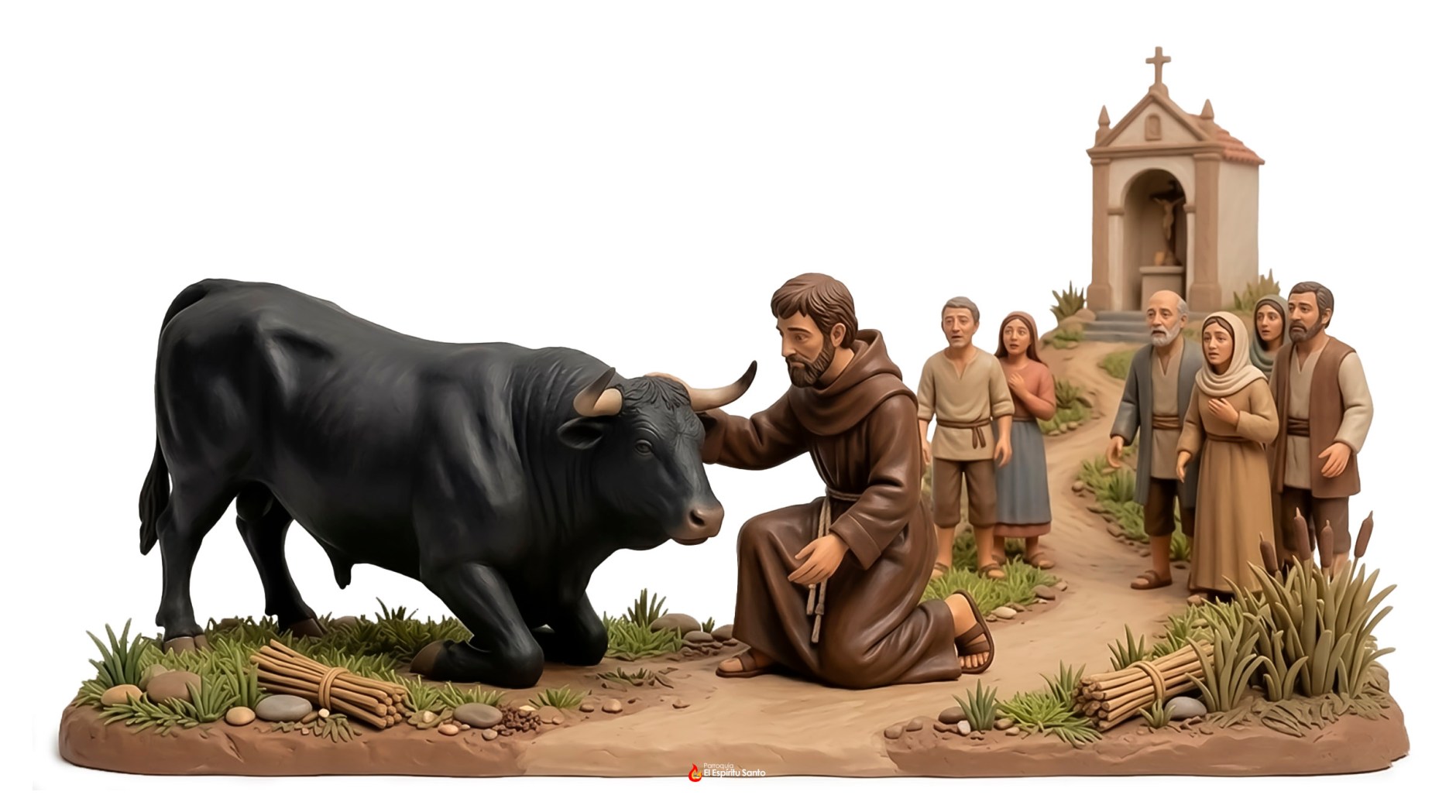 De manera sorprendente, el toro se detuvo. Permaneció inmóvil, como si hubiera comprendido la orden. Entonces, el Hermano Pedro se acercó lentamente hasta tocarlo con la mano y, con un suave empujón, lo fue guiando de regreso hacia su potrero.