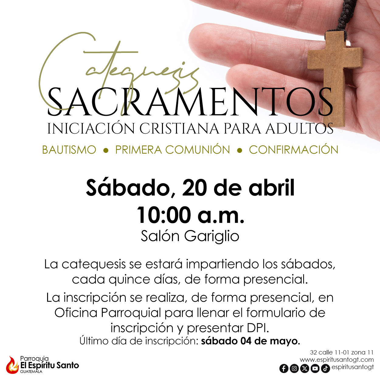 Las reuniones se estarán realizando los sábados, cada quince días, a partir de las 10:00 a.m. en el Salón Gariglio. La inscripción se realiza en Oficina Parroquial, presentando su DPI.