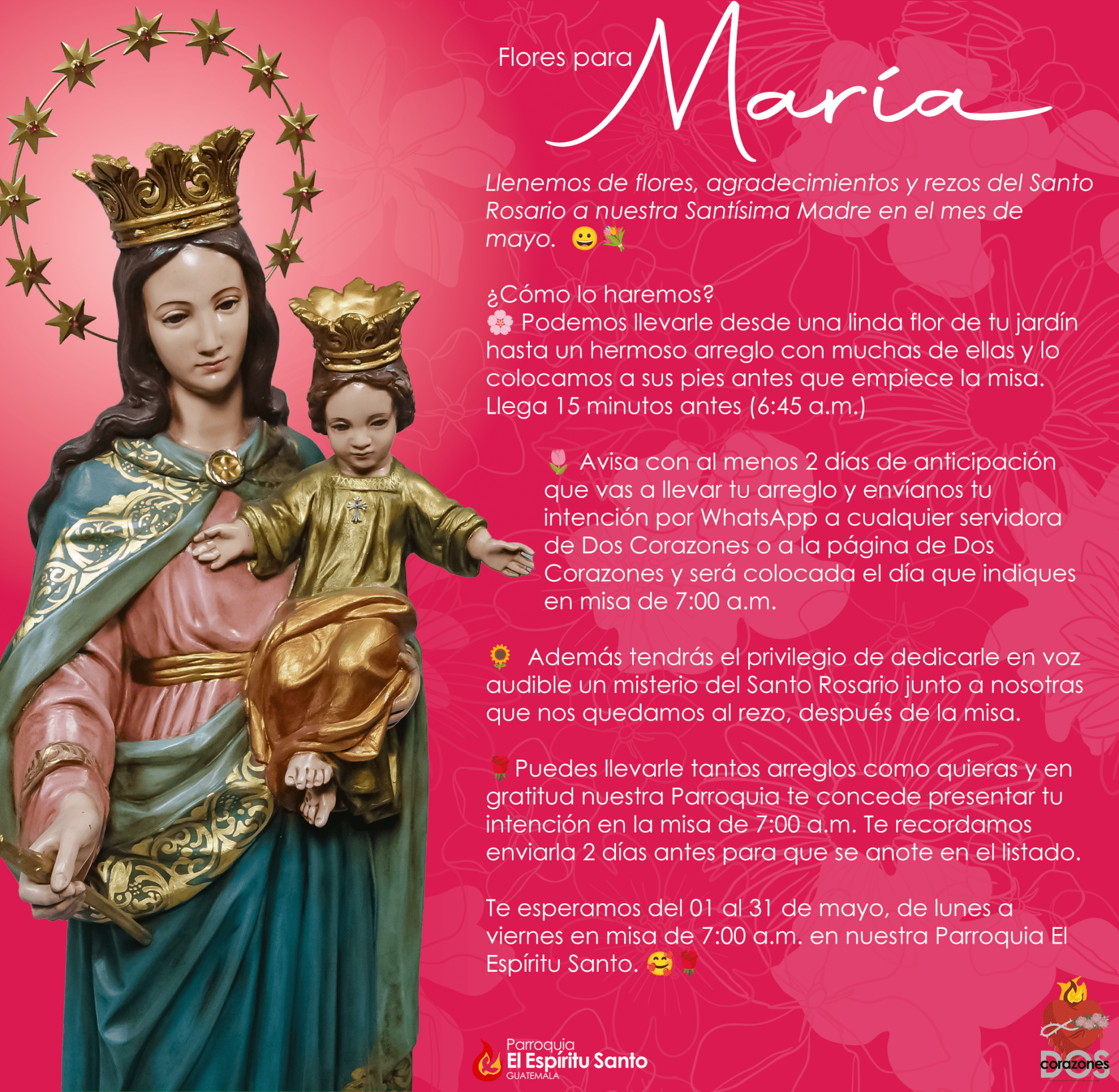 Te esperamos del 01 al 31 de mayo, de lunes a viernes en misa de 7:00 a.m. en nuestra Parroquia El Espíritu Santo. 🥰🌹