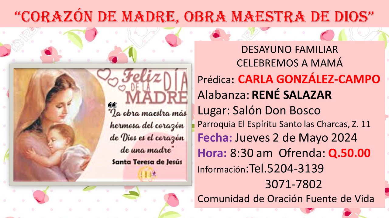 La Comunidad de oración Fuente de Vida invita a todos a su próximo desayuno familiar para celebrar el día de la madre este próximo jueves, 02 de mayo a partir de las 8:30 a.m. en el Salón Don Bosco.