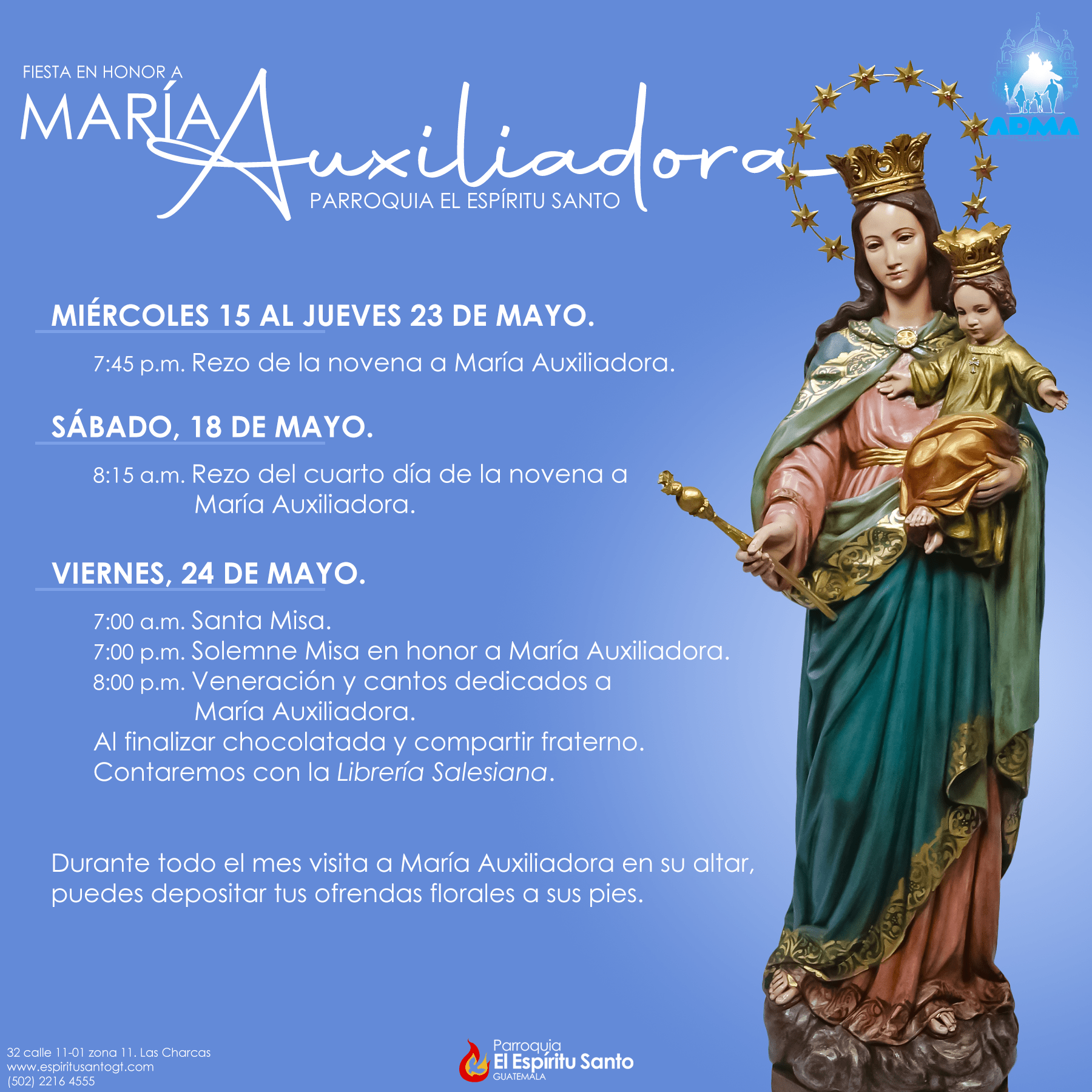 Es así como un esfuerzo en conjunto de nuestro párroco, padre Carlos Macz, SDB, la Asociación de María Auxiliadora (ADMA) y la Hermandad de Jesús Nazareno de las Charcas y Virgen de Dolores, han logrado embellecer nuestra parroquia para la fiesta en honor a “la Virgen de Don Bosco”.