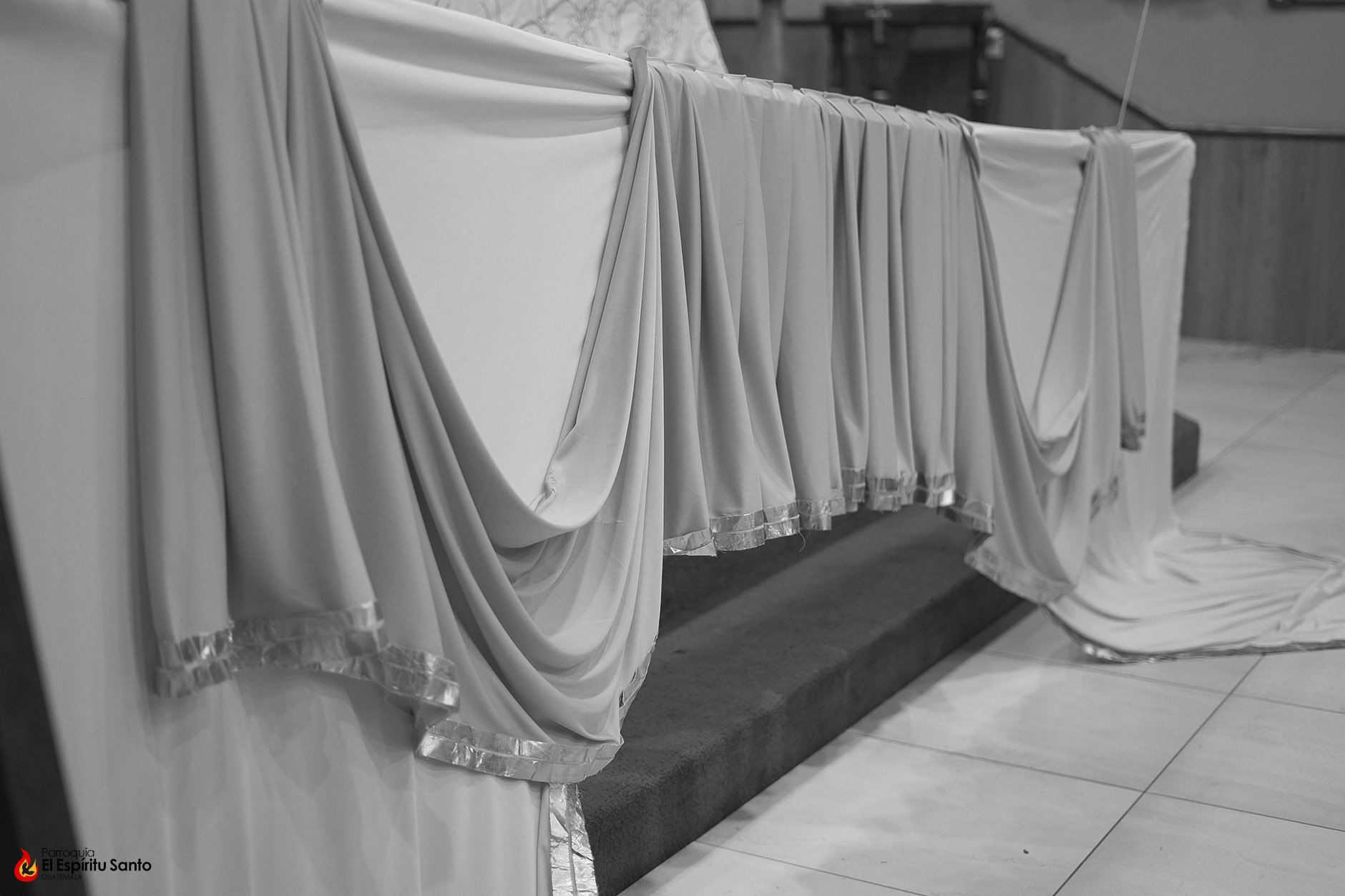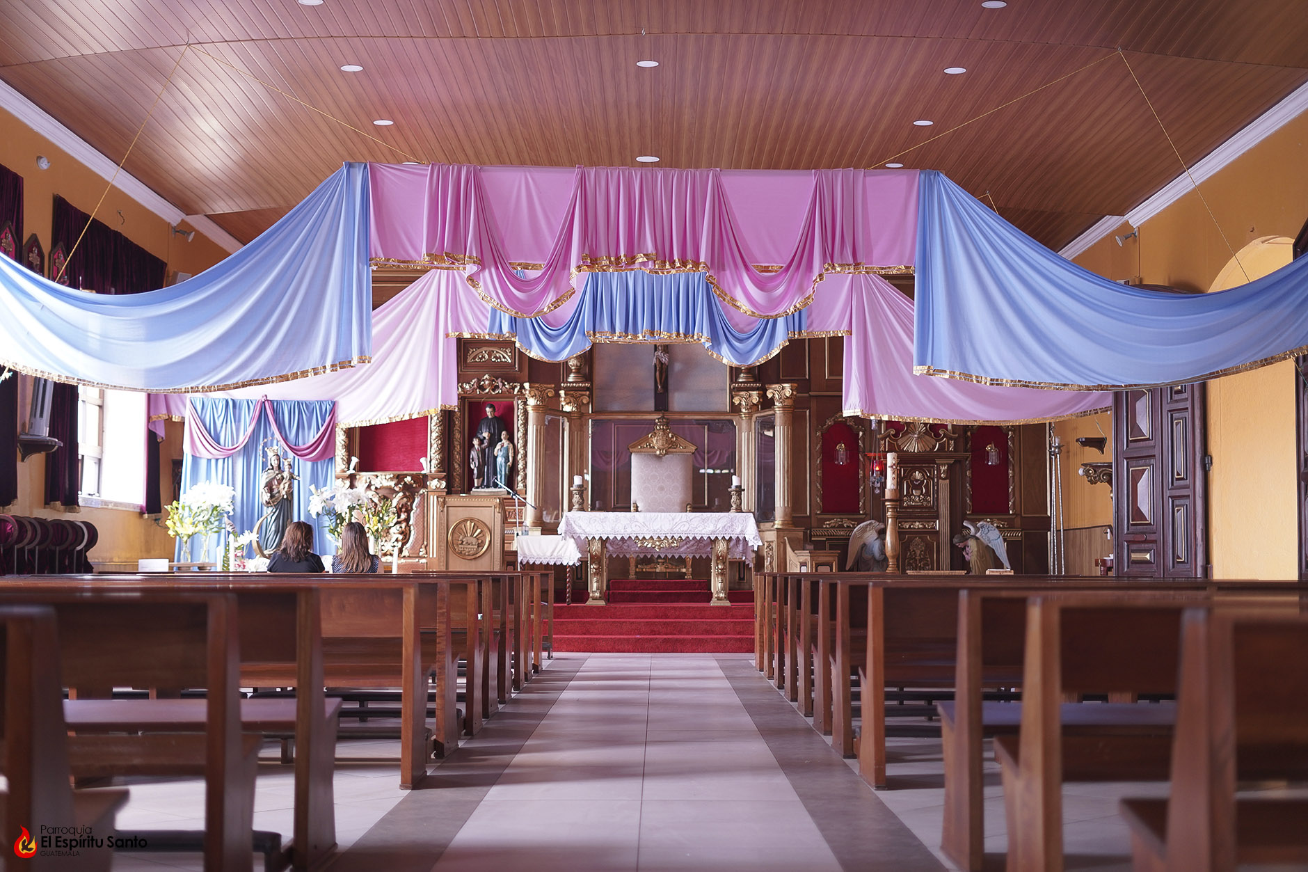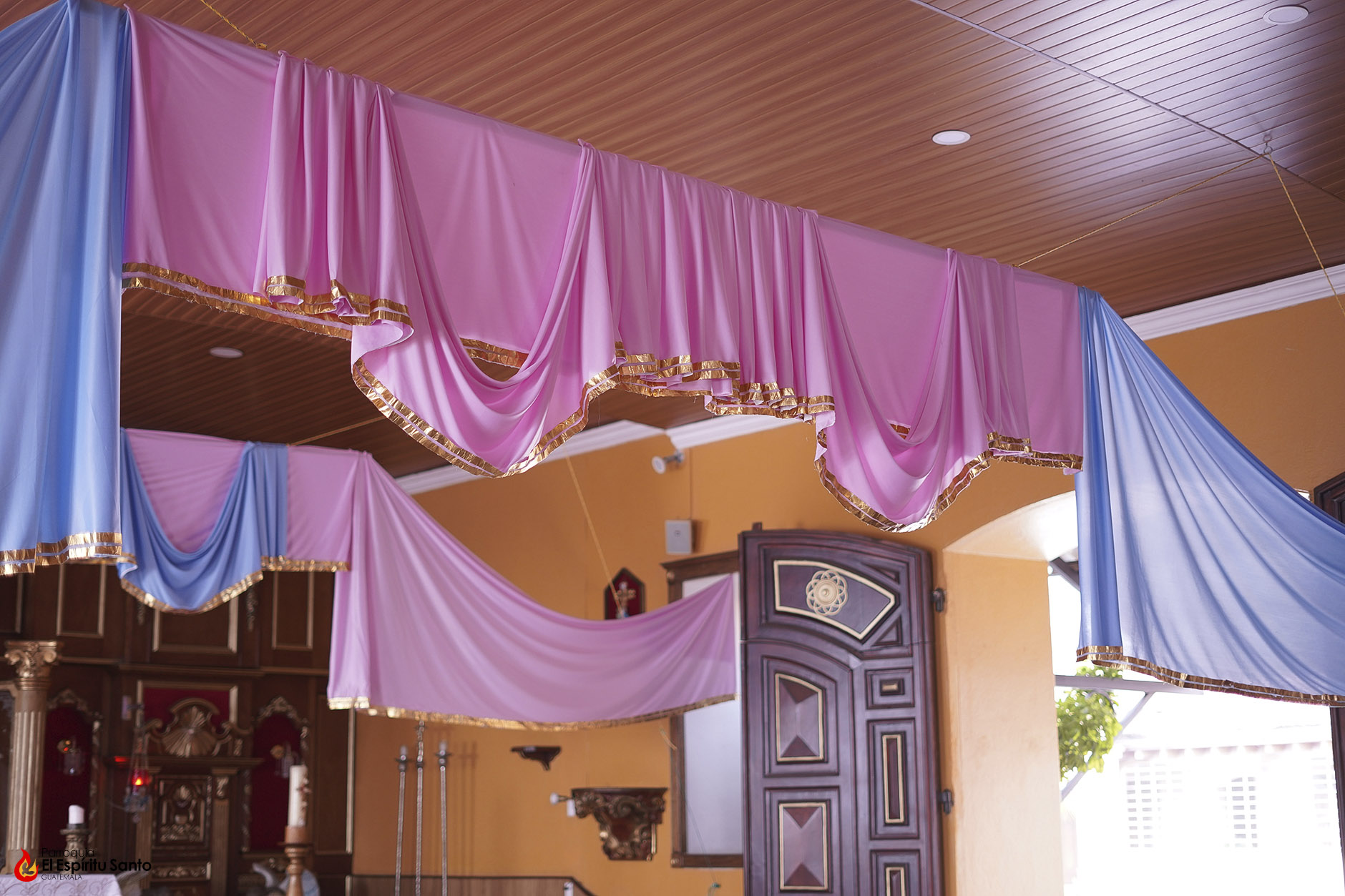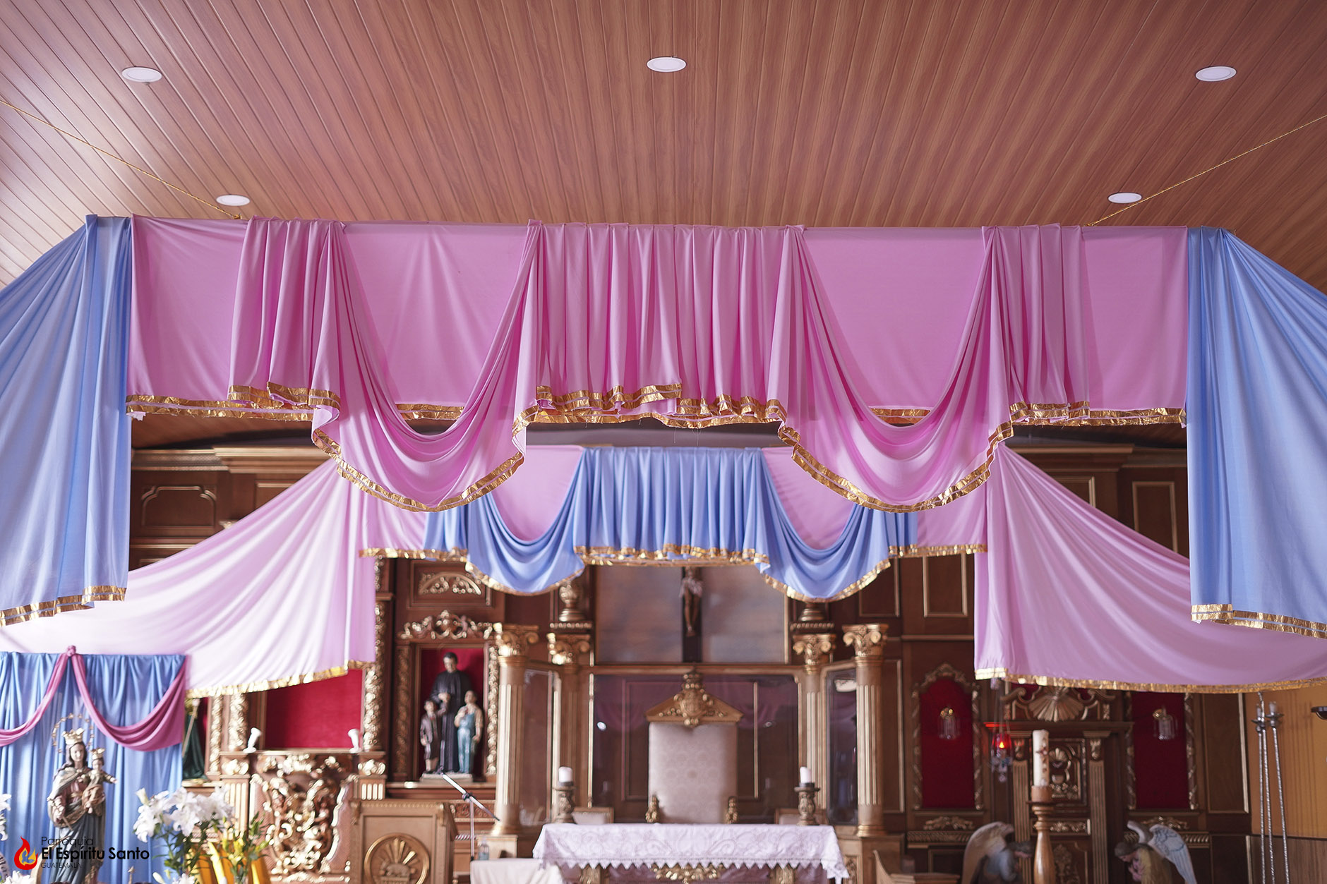 Nuestro templo parroquial luce bellas cortinas en tonos celeste y rosado, inspirado en los colores que viste María Auxiliadora, en la pintura que se encuentra en el altar mayor de la Basílica dedicada a ella, en Turín, Italia, con detalles dorados en las orillas, complementando perfectamente el altar que ha sido elaborado para la veneración de nuestra imagen.