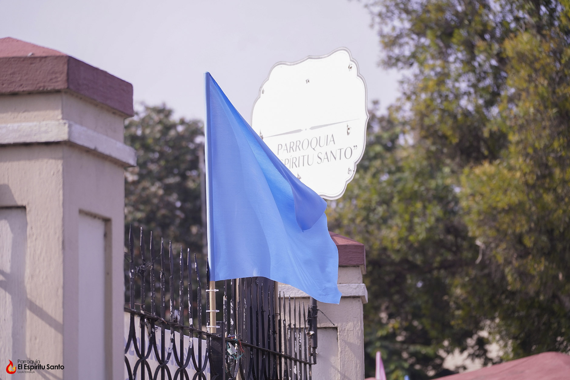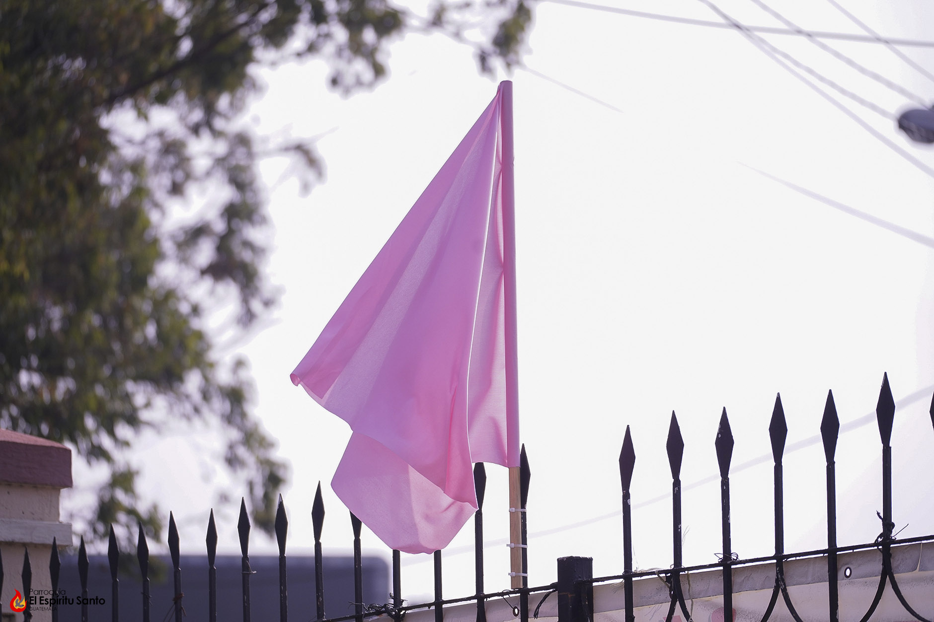 En la parte exterior un juego de banderas, en los mismos tonos celeste y rosado, avisan a los transeúntes que nos encontramos festejando el mes dedicado a María Auxiliadora, a quien nos encomendamos diariamente.