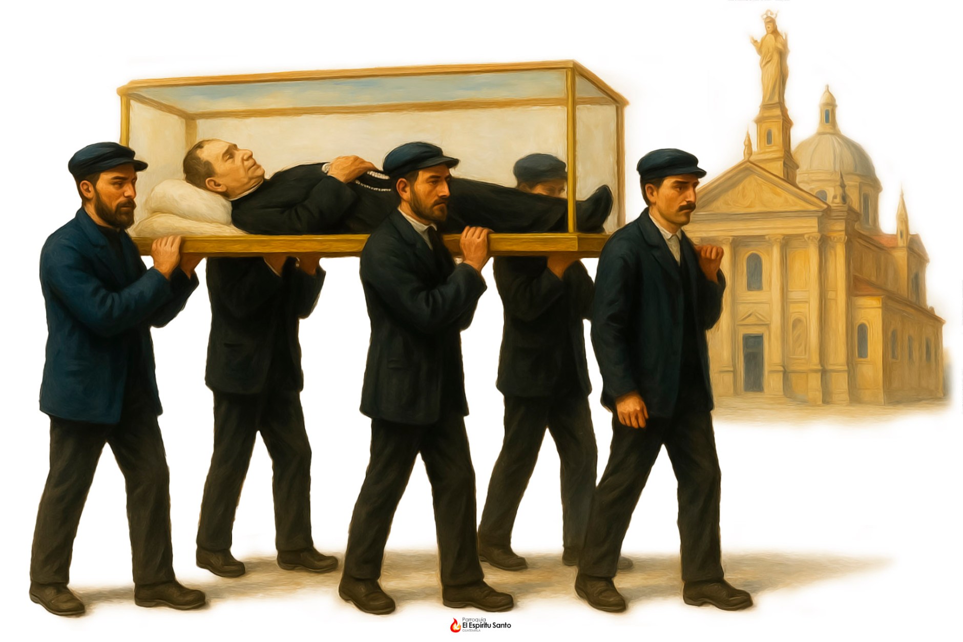 Y he aquí que apareció la urna en medio de la puerta principal. Cesó en un instante la salva de aplausos del exterior y no se oía nada más que el alegre repicar de las campanas. Saludada por el clangor de las trompetas, el alborozo del órgano, el estruendo de los aplausos y los vivas, la urna se movía meciéndose como una nave en medio de un mar de cabezas. La llevaban a hombros robustos exalumnos. Todos se inclinaban a su paso y fijaban después los ojos en la cara del Beato, cuyo perfil aparecía limpio a través de los cristales. Seguía adelante por el centro de la nave, llegó a la balaustrada, subió al presbiterio y fue colocada sobre el trono allí preparado. La iglesia estaba inundada de luz. Una fantasmagoría de llamas arrojaba reflejos encendidos sobre los paramentos de damasco y terciopelo. Dos poderosos reflectores, encubiertos por la balaustrada, lanzaban haces de luz sobre el rostro del Beato que parecía constelado por gemas luminosas. Mientras tanto la orquesta y un coro polifónico entonaban el himno litúrgico de los Confesores, Iste Confessor, compuesto por don Juan Pagella. El Cardenal arzobispo se acercó al altar, donde se hizo la exposición del Santísimo. Se cantó el Tantum ergo y, mientras él impartía la bendición eucarística, el cardenal Vidal y Barraquer y el cardenal Hlond, desde el altar levantado en la Plaza, el uno, y desde el levantado en el Rond, el otro, cumplían el mismo rito sobre la incontable multitud que, hasta donde alcanzaba la vista, estaba postrada en tierra por todas partes.