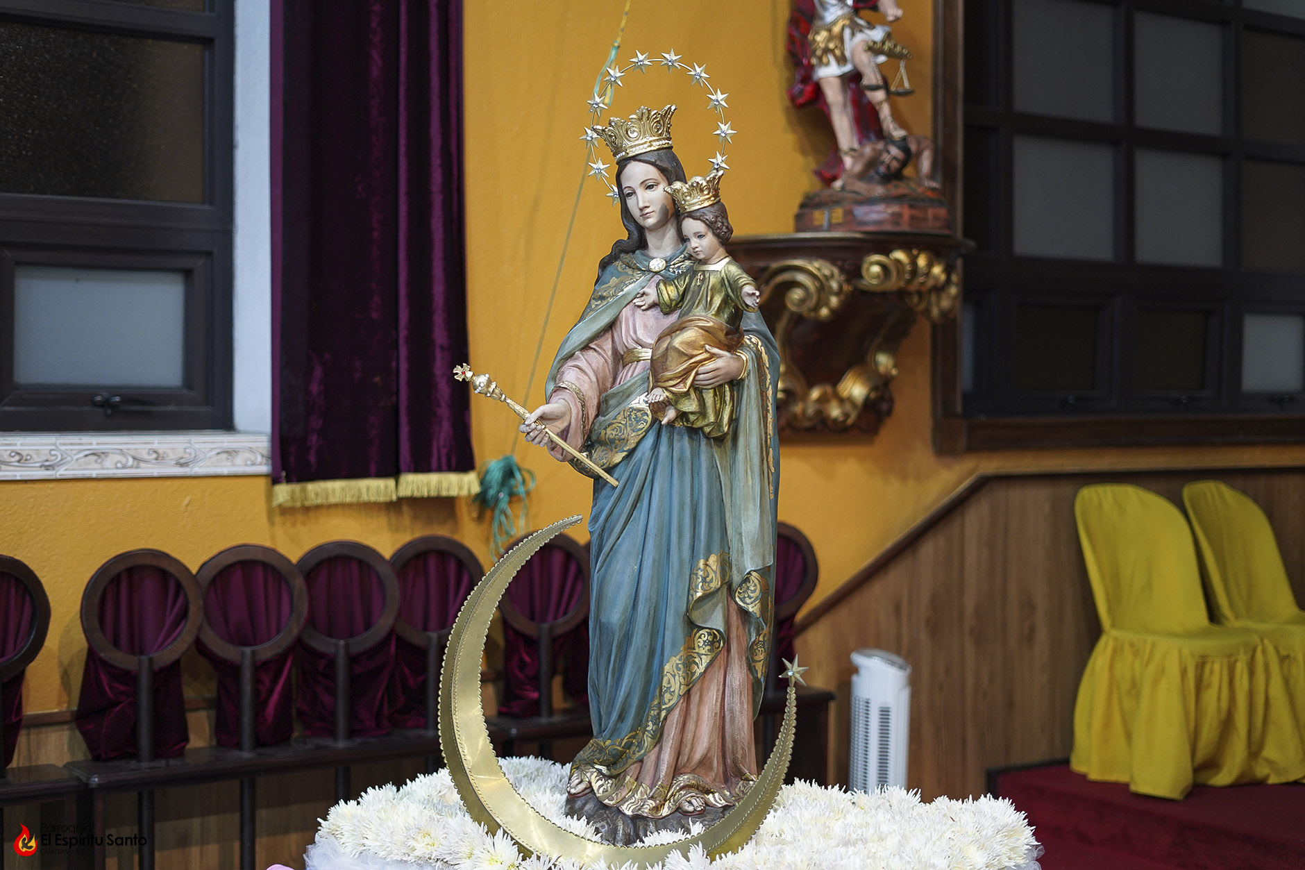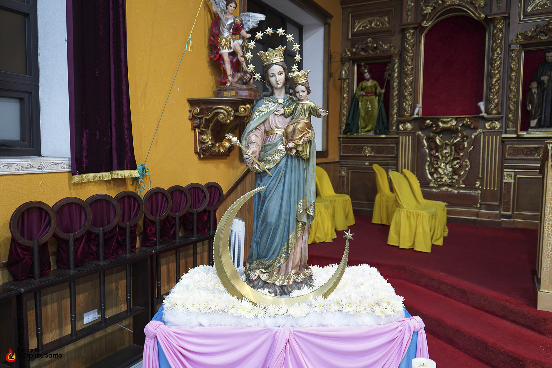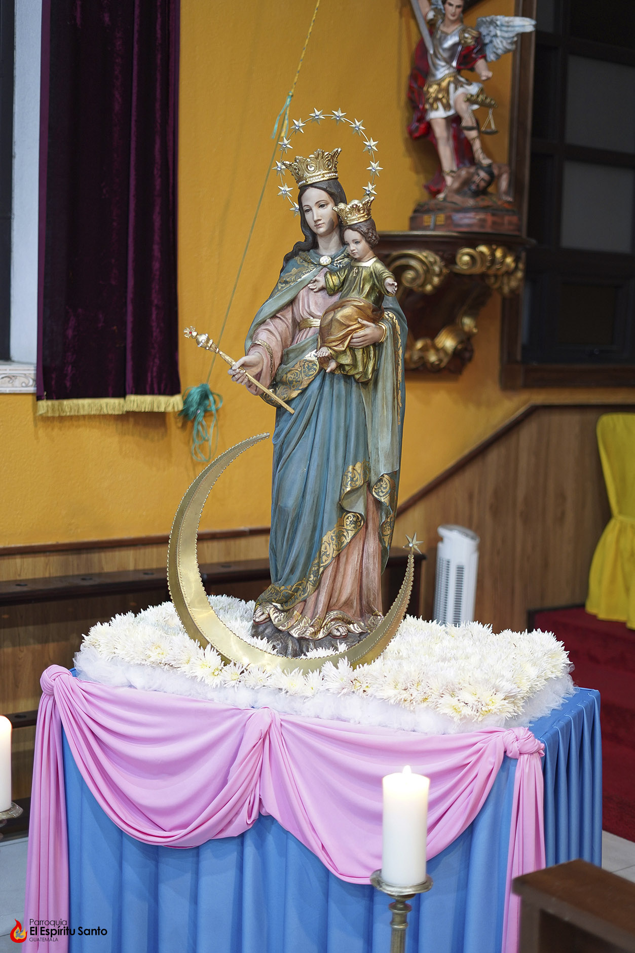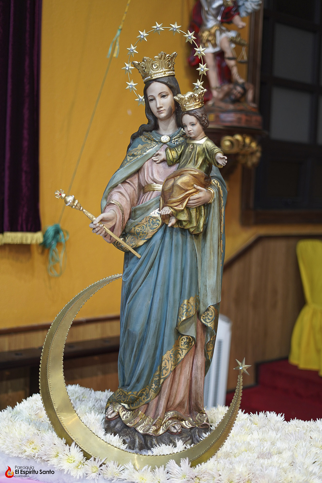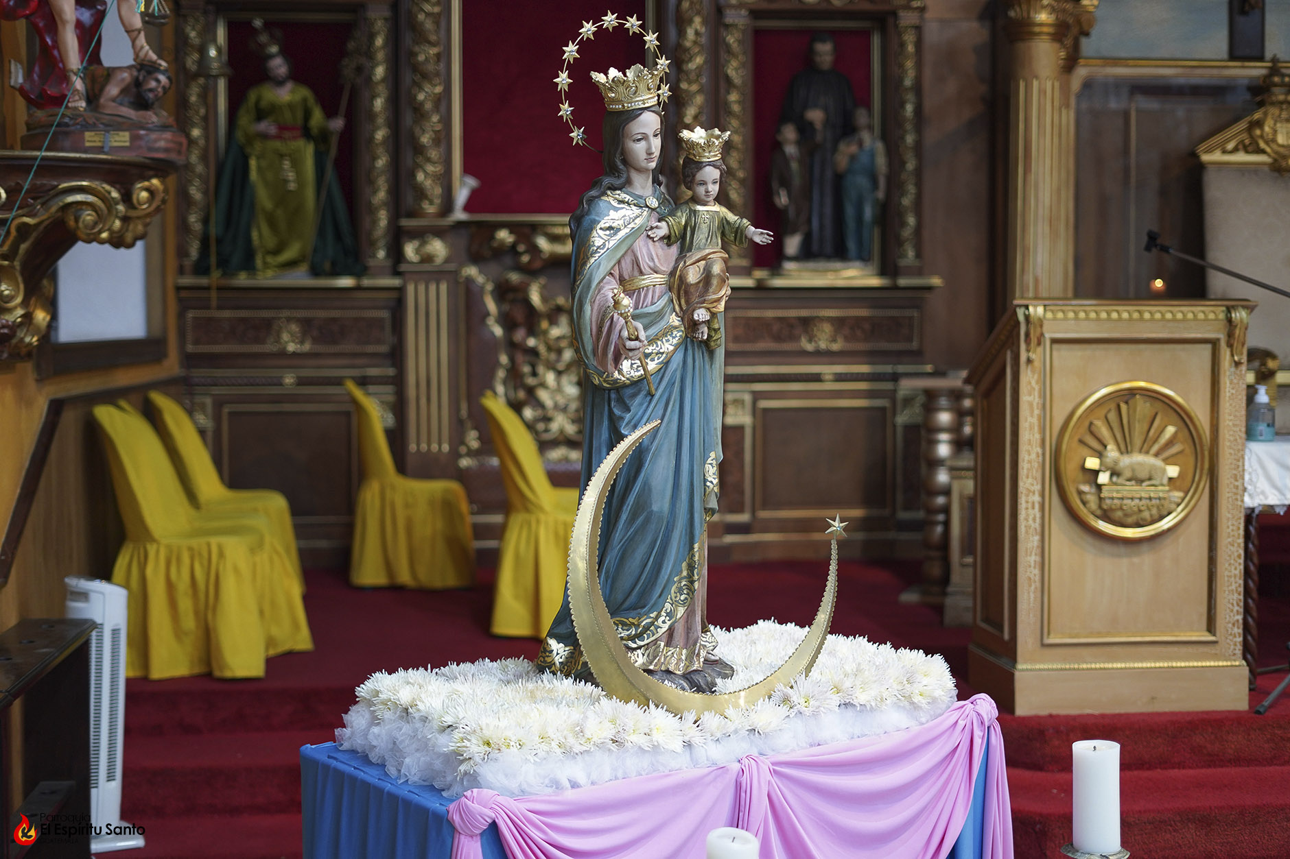 En la Familia Salesiana se tiene la tradición de celebrar a María Auxiliadora, Patrona principal de la Congregación, cada 24 de mes, como un eco de su solemne fiesta del 24 de mayo y, para esta ocasión, nuestra parroquia ha colocado a la Virgen entre un campo de flores blancas, representando todas las oraciones, agradecimientos y peticiones que sus devotos le dedican diariamente.