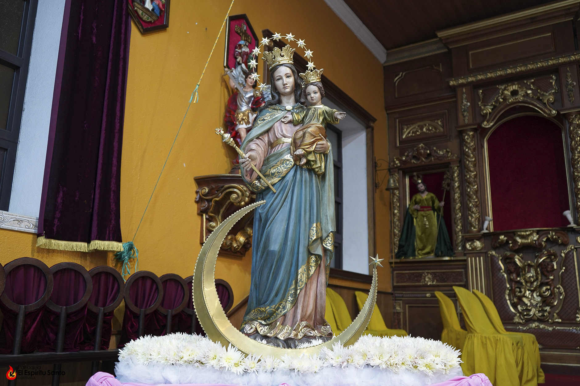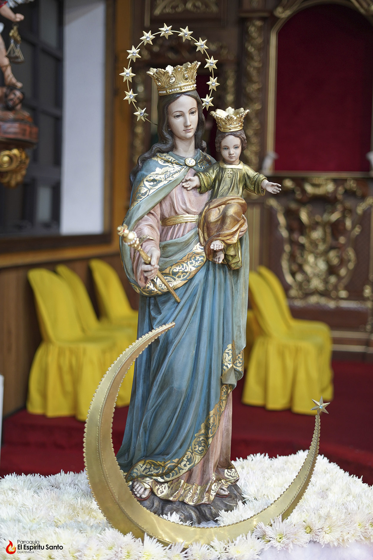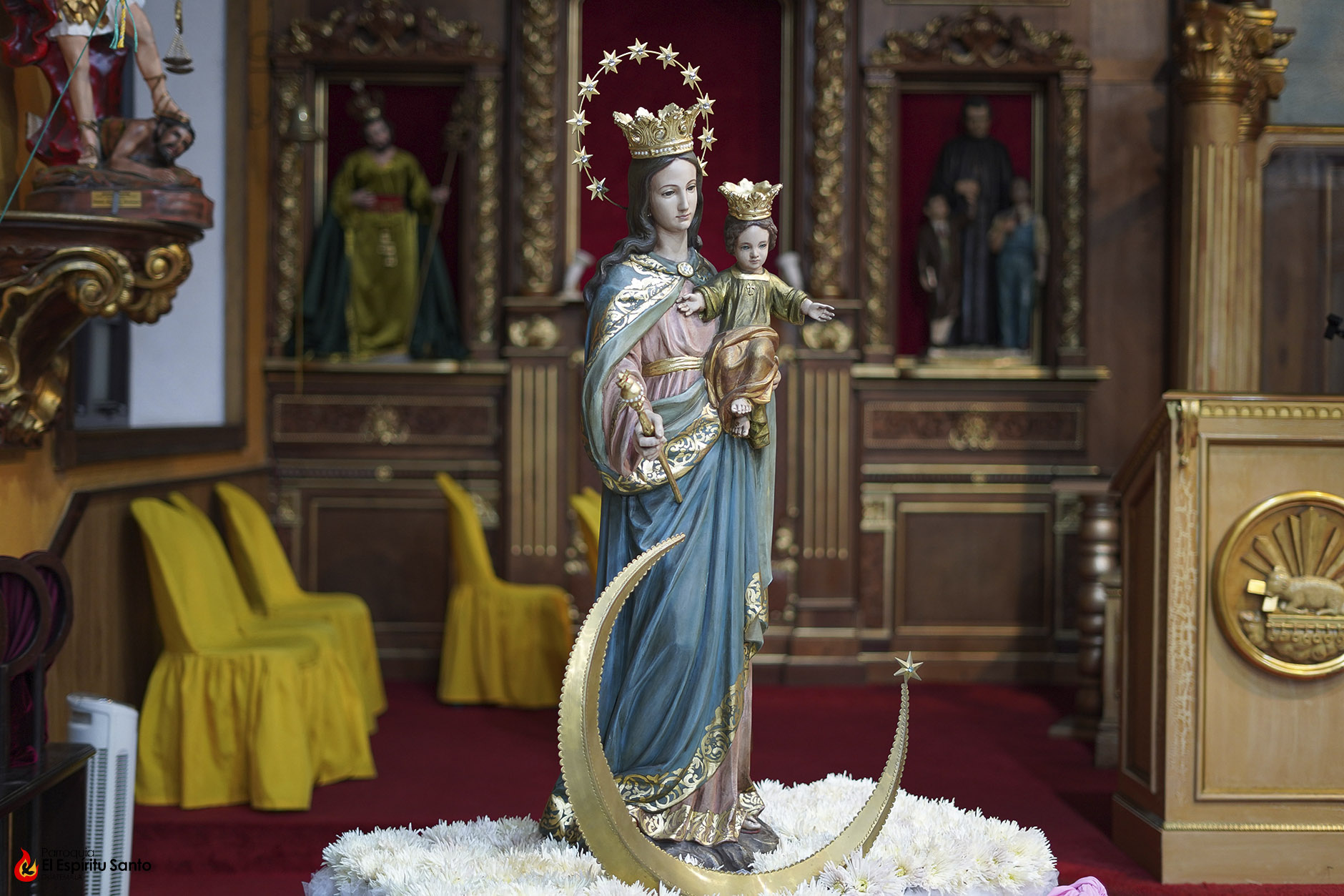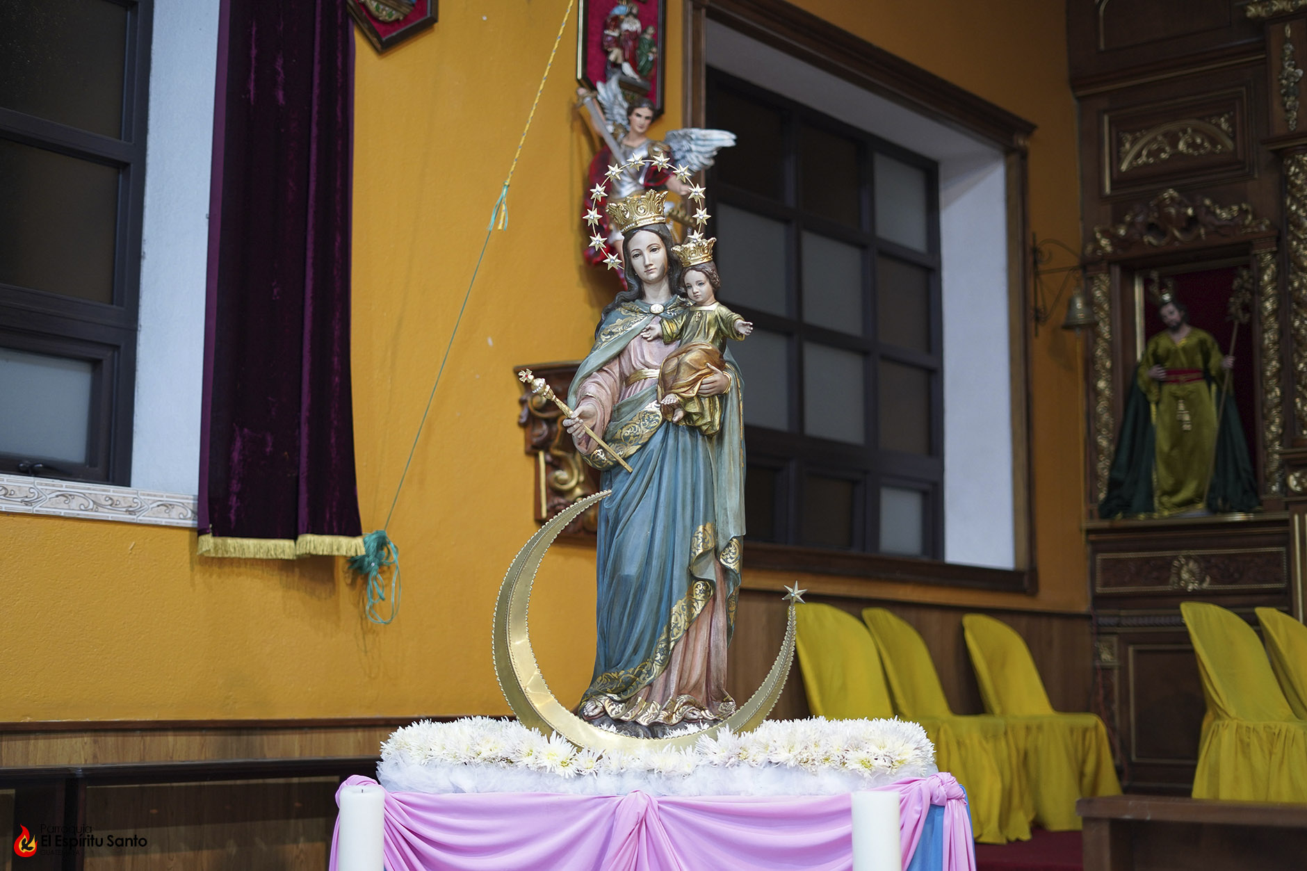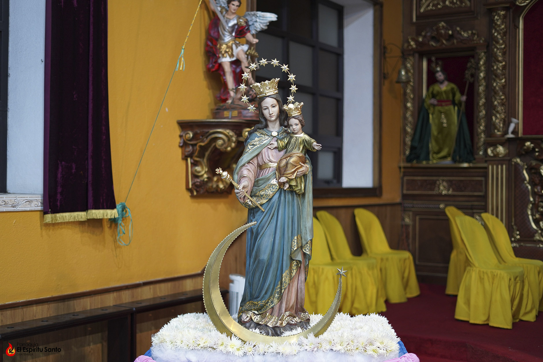 En la Familia Salesiana se tiene la tradición de celebrar a María Auxiliadora, Patrona principal de la Congregación, cada 24 de mes, como un eco de su solemne fiesta del 24 de mayo y, para esta ocasión, nuestra parroquia ha colocado a la Virgen entre un campo de flores blancas, representando todas las oraciones, agradecimientos y peticiones que sus devotos le dedican diariamente.