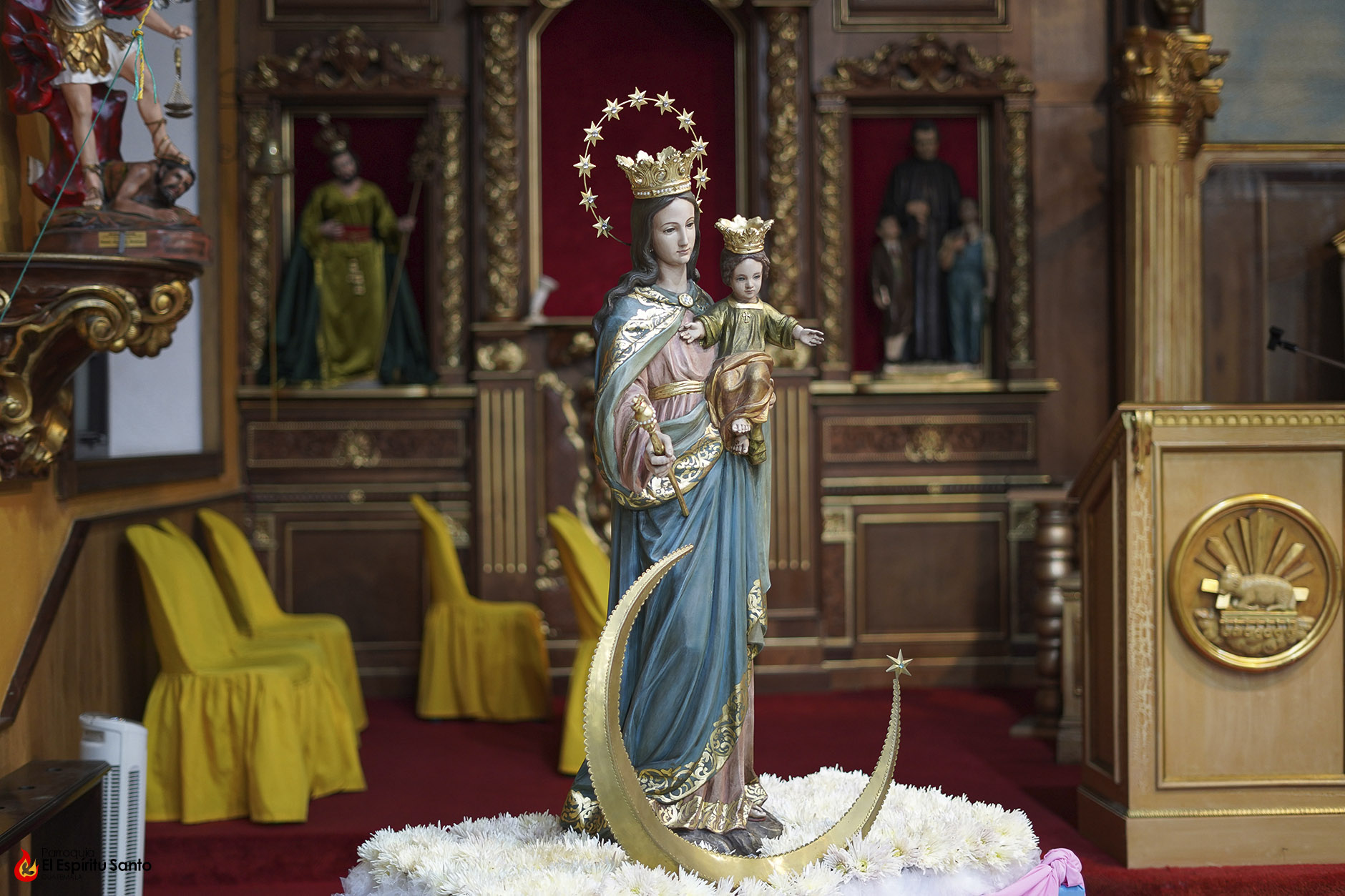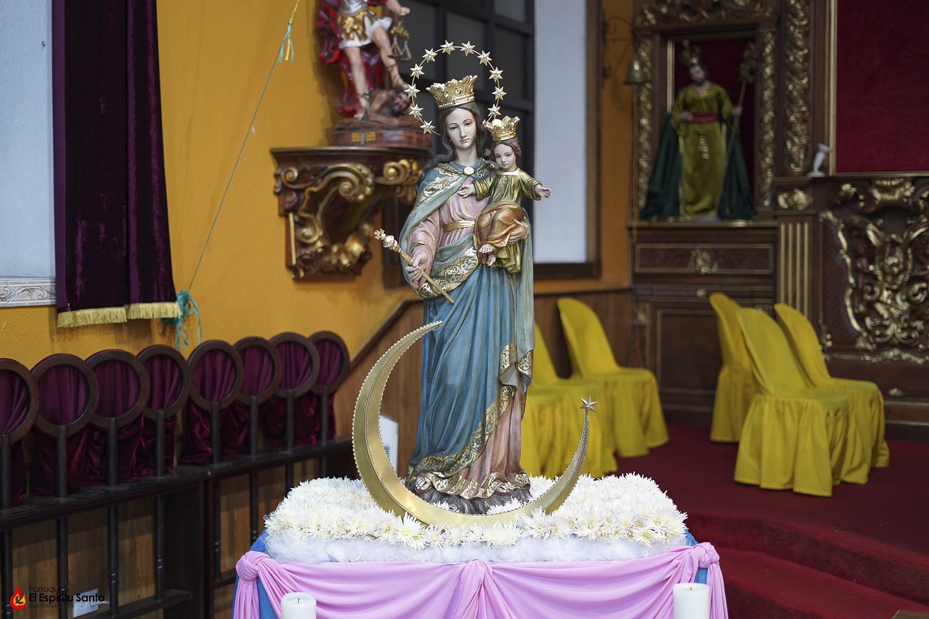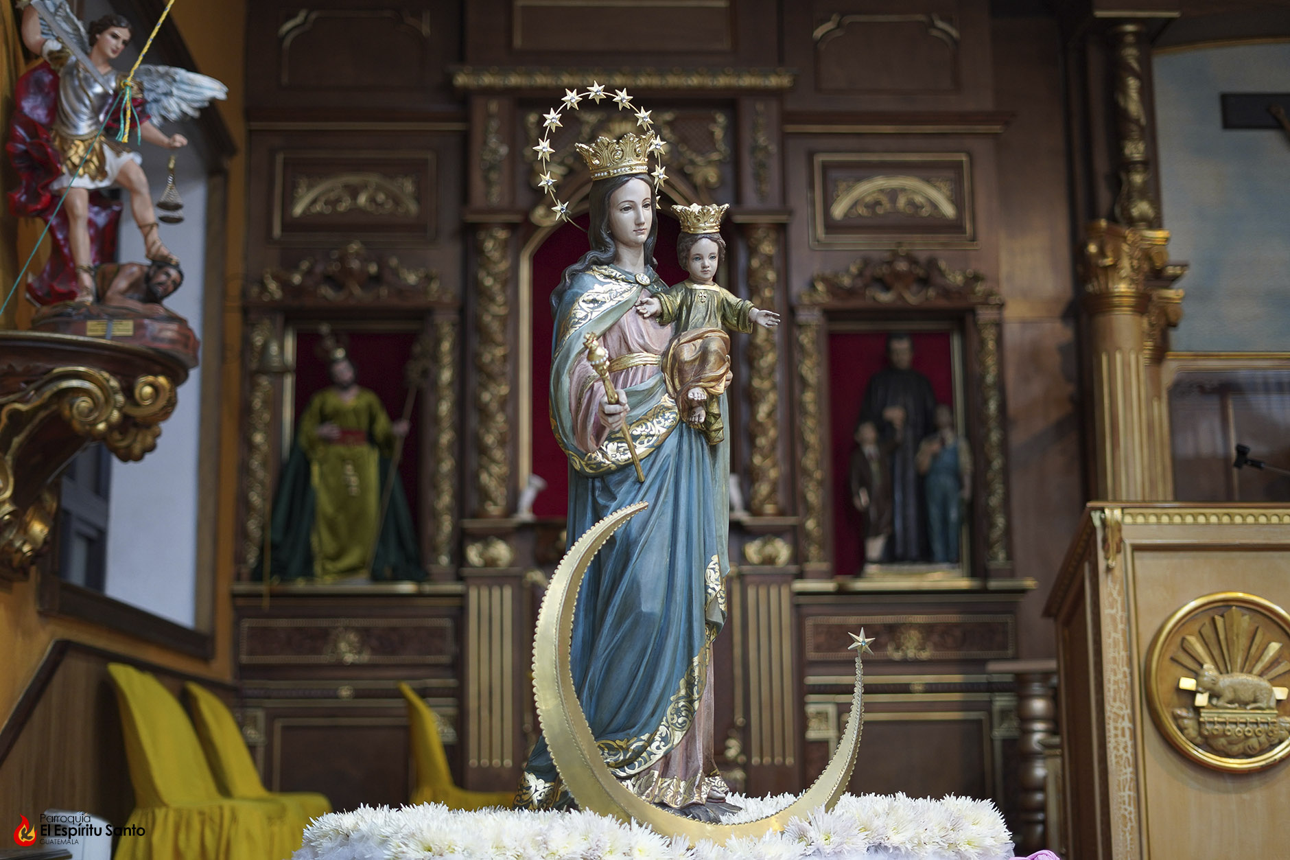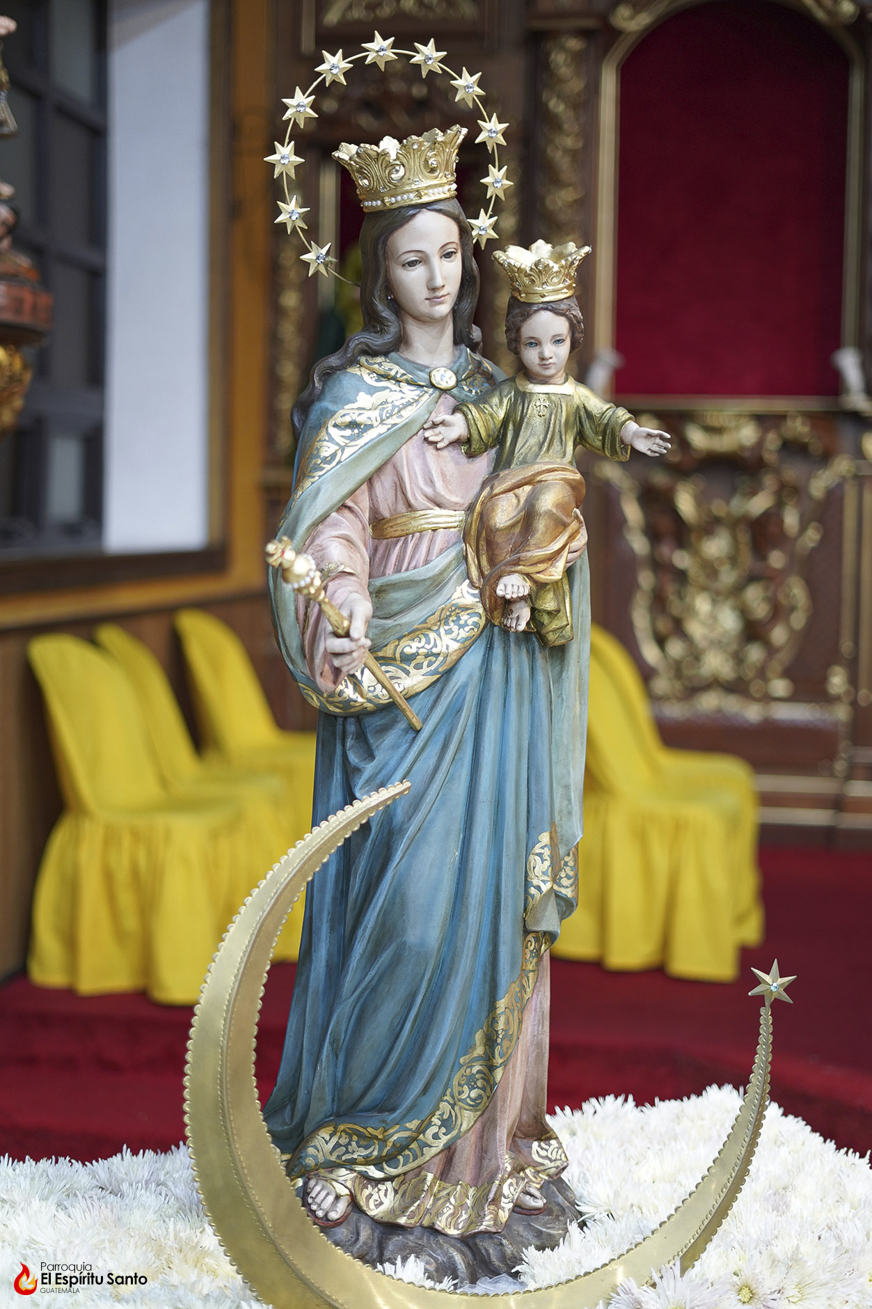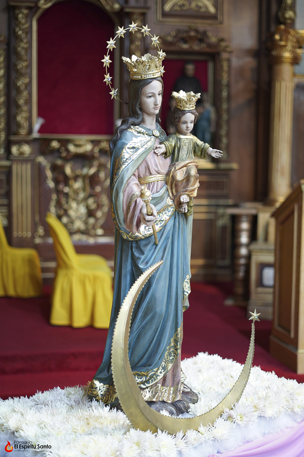 En la Familia Salesiana se tiene la tradición de celebrar a María Auxiliadora, Patrona principal de la Congregación, cada 24 de mes, como un eco de su solemne fiesta del 24 de mayo y, para esta ocasión, nuestra parroquia ha colocado a la Virgen entre un campo de flores blancas, representando todas las oraciones, agradecimientos y peticiones que sus devotos le dedican diariamente.