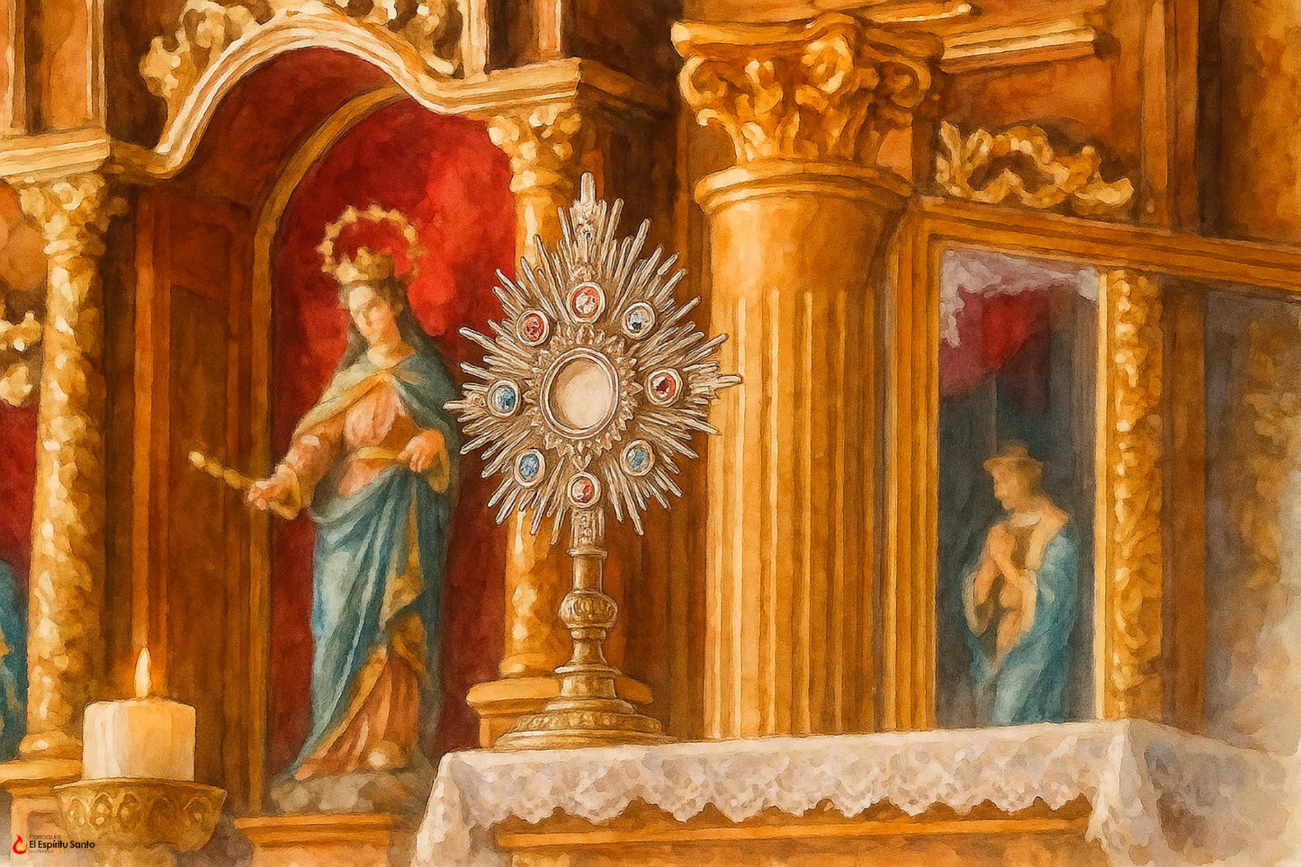 Te pido humildemente alumbres mi alma con una fe muy viva, para que, conociendo tus finezas en el Santísimo Sacramento, sepa tributarte continuas acciones de gracias y la más profunda adoración. Amén.
