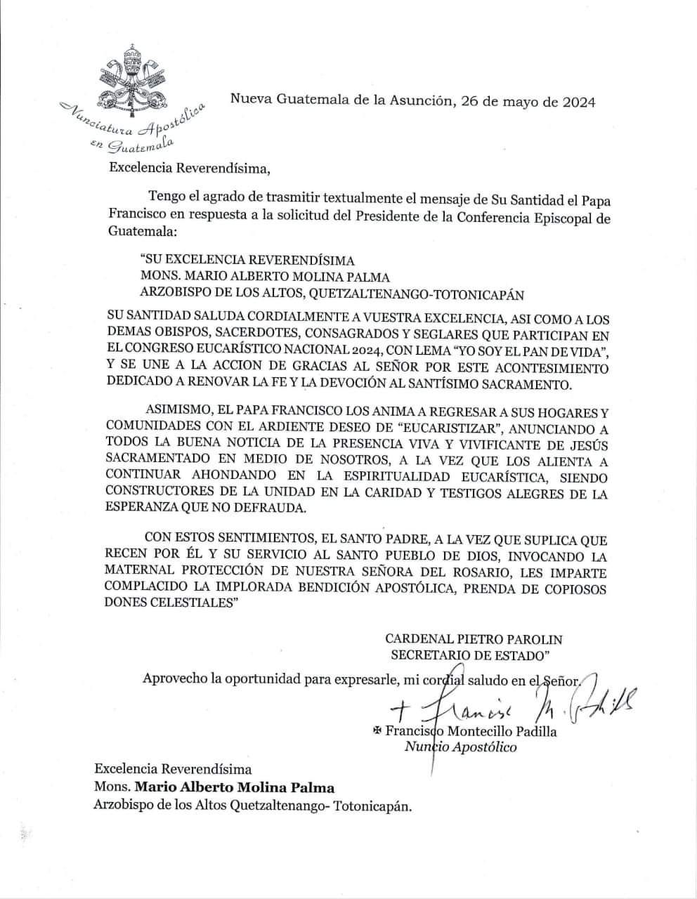 Su Santidad saluda cordialmente a vuelta excelencia, así como a los demás obispos, sacerdotes, consagrados y seglares que participan en el Congreso Eucarístico Nacional 2024, con el lema “Yo soy el Pan de Vida”, y se une a la acción de gracias al Señor por este acontecimiento dedicado a renovar la fe y la devoción al Santísimo Sacramento.
