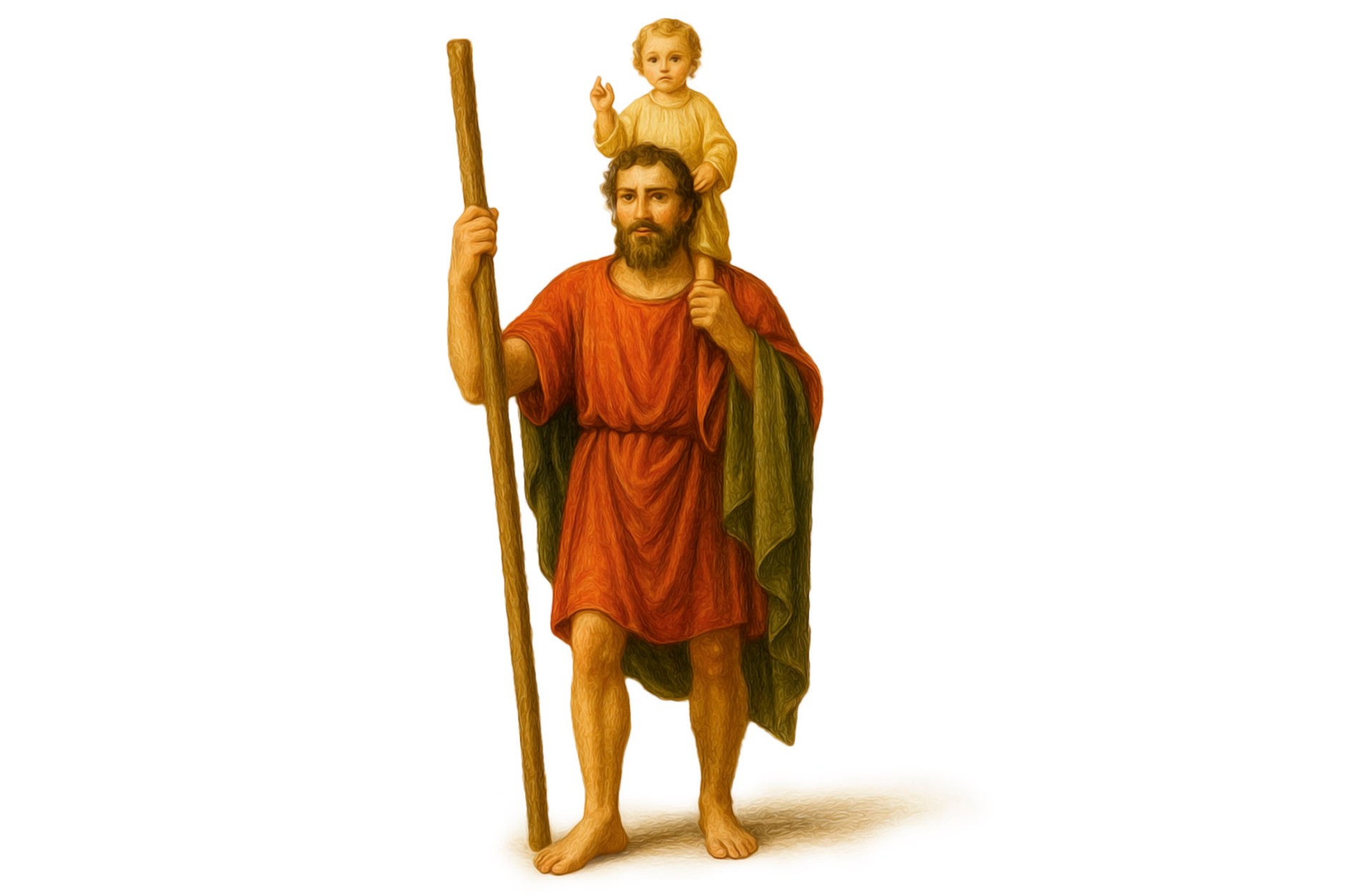 Hay una leyenda muy bonita que te voy a contar. San Cristóbal fue un hombre de gran estatura y con una fuerza enorme. Siendo cristiano quiso dedicarse a hacer el bien a todo el que pudiera. Por eso se puso en la orilla de un río y pasaba sobre sus hombros a todo el que necesitaba cruzarlo, sin pedir nada a cambio.