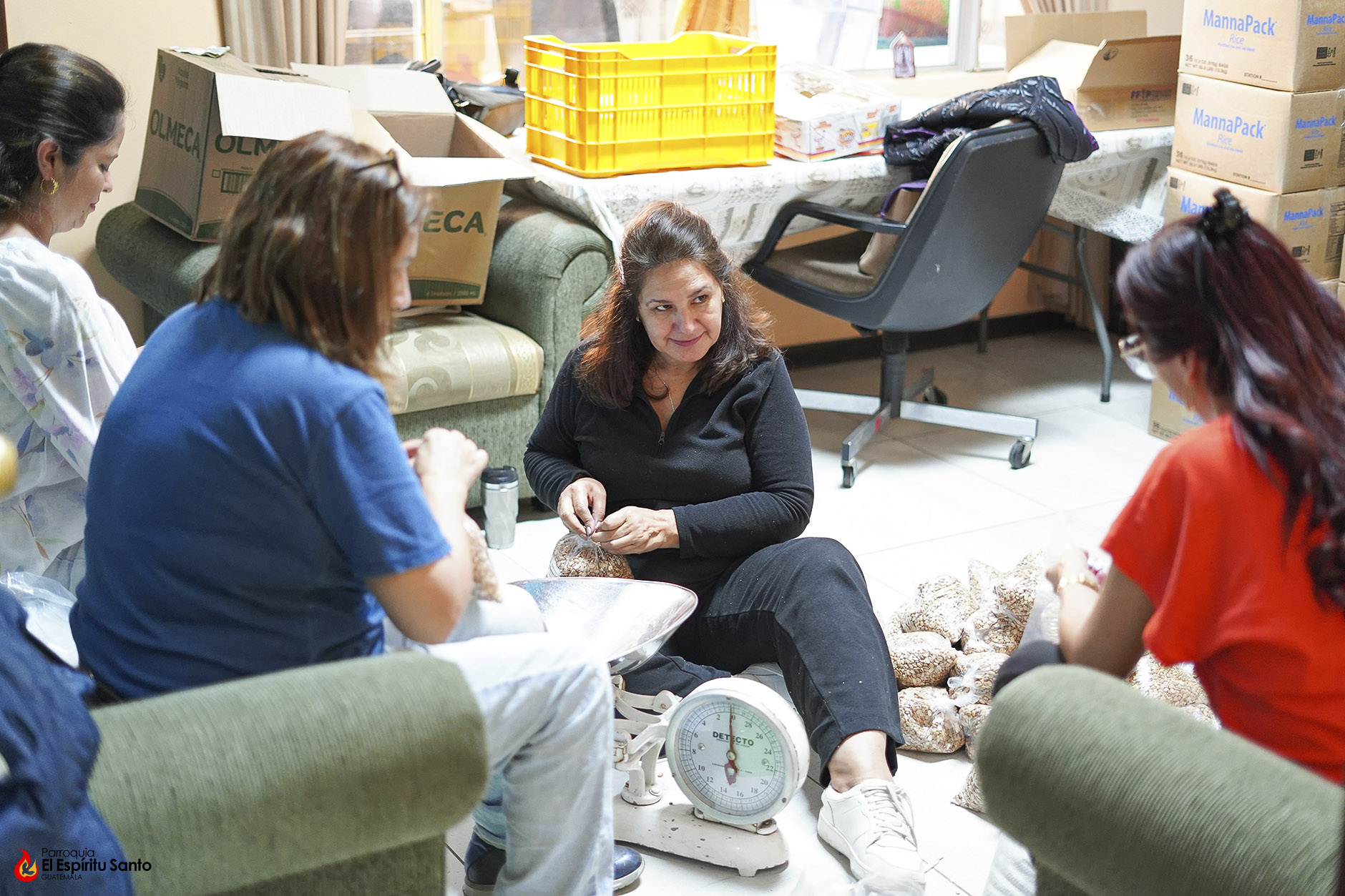 El trabajo que realizaron consistió en pesar los diferentes granos para distribuirlos en empaques de dos libras cada uno para luego armas las bolsas que se entregarán. Estas bolsas, además de granos básicos como frijol y arroz, cuentan también con: pastas, azúcar, aceite, algunos productos enlatados, Incaparina, margarina, entre otros.