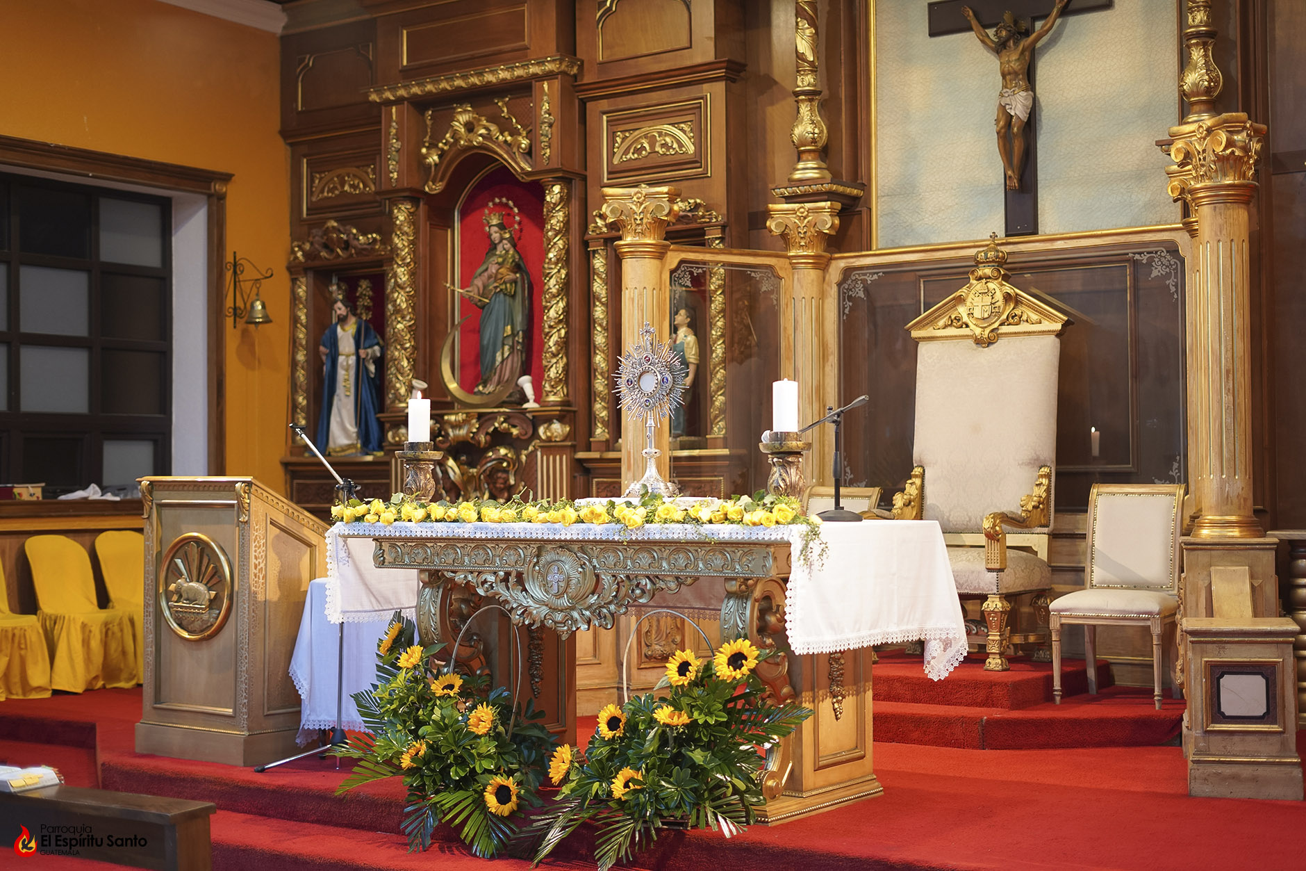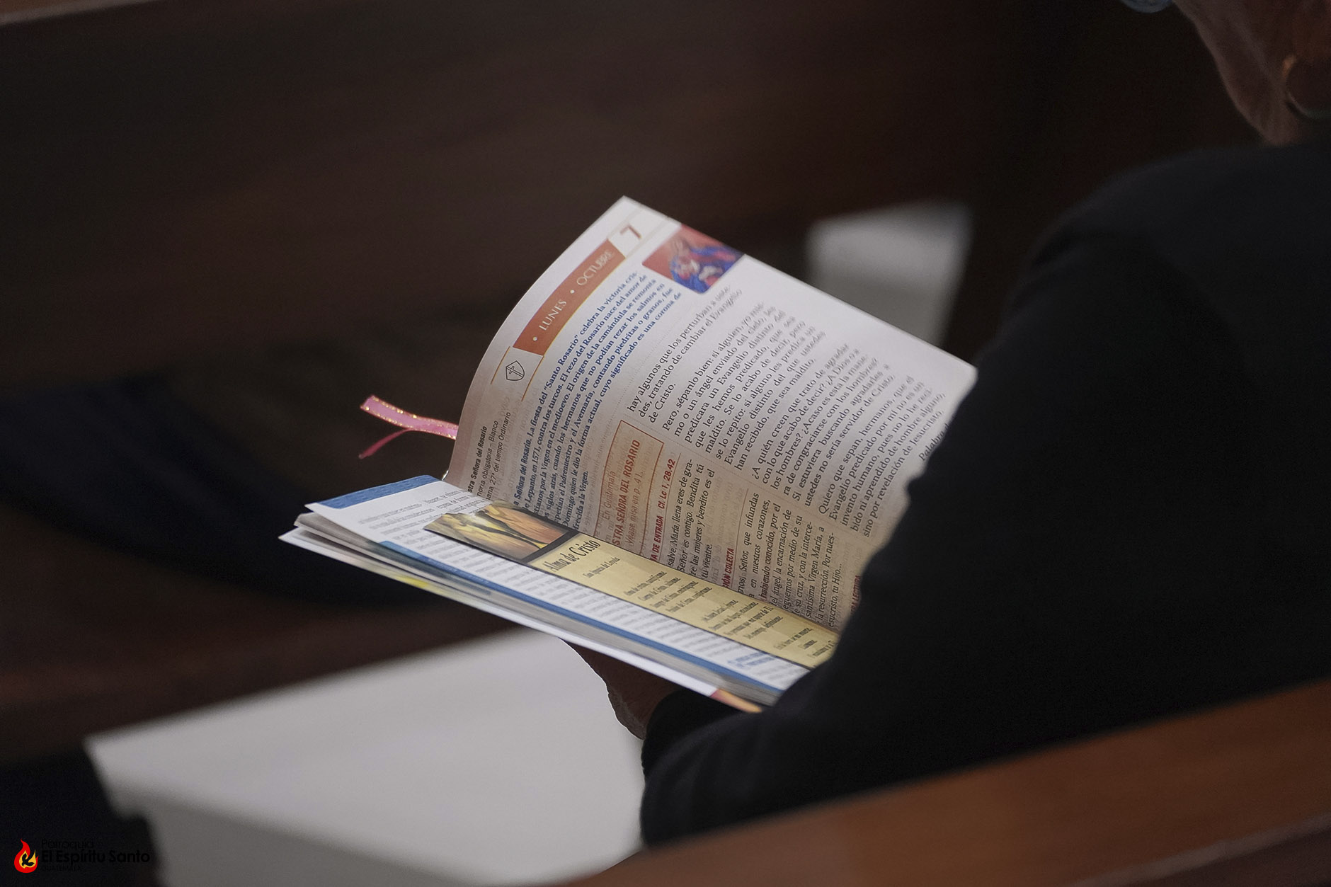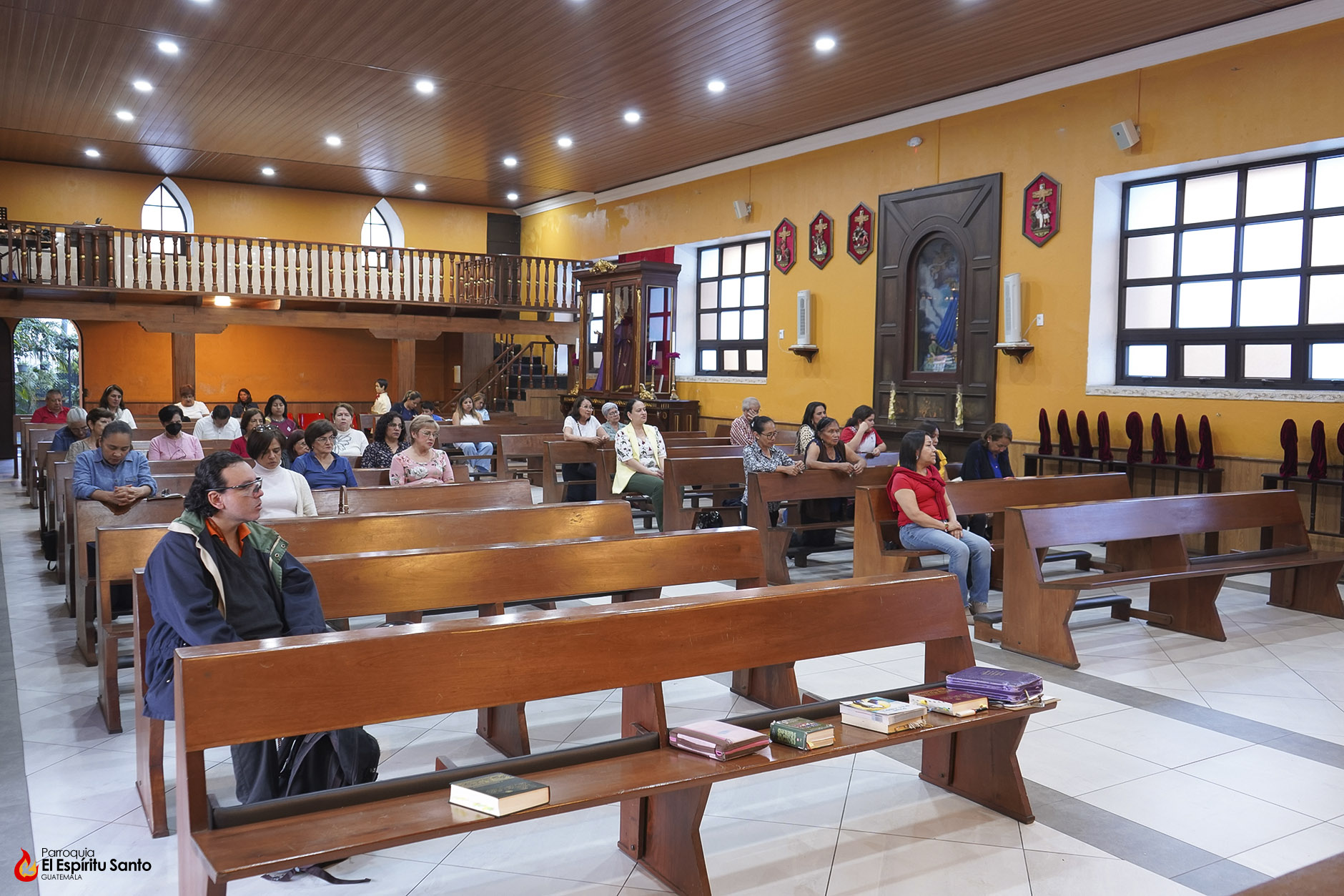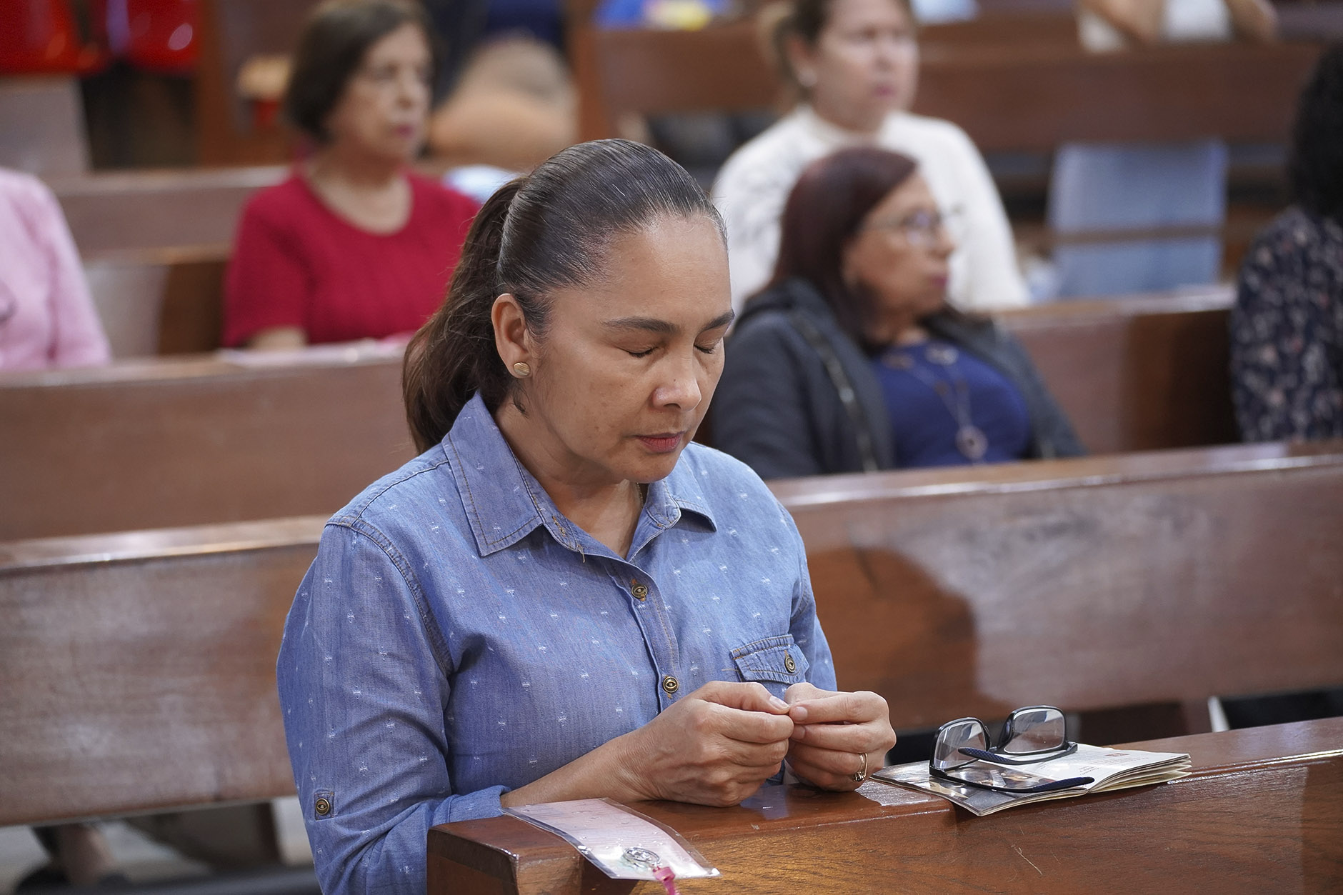 La jornada arrancó con el rezo del Santo Rosario ante el altar de la Virgen para luego dar paso a una hora de Adoración Eucarística. Los presentes obsequiaron una rosa amarilla a Jesús Sacramentado, la cual colocaron sobre el altar.