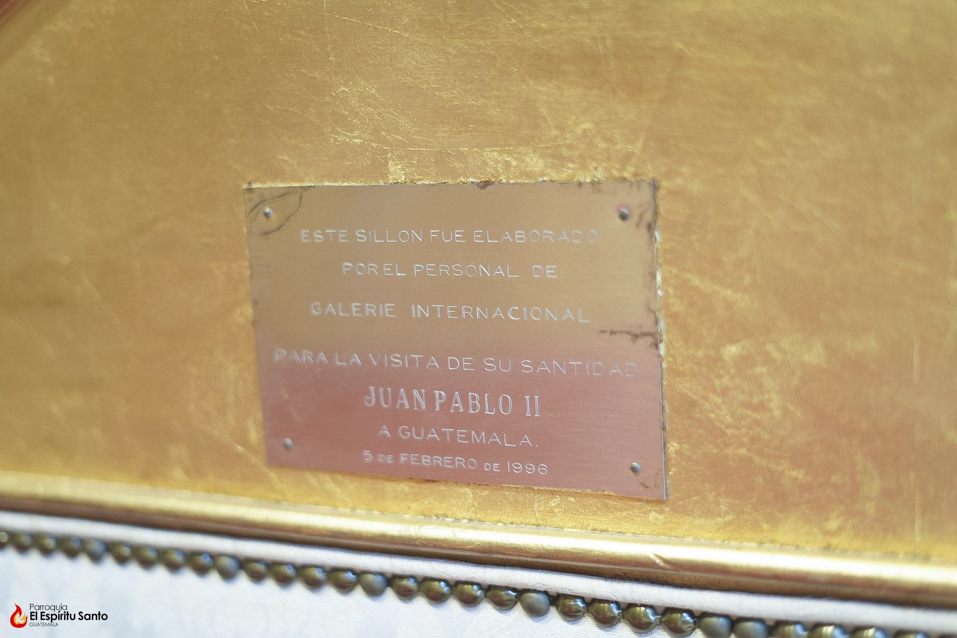 Otro detalle especial que se encuentra en la silla papal, además de los acabados de jade en la parte superior, es una pequeña placa en el respaldo, en la cual se puede leer la inscripción: «Este sillón fue elaborado por el personal de Galerie Internacional para la visita de su santidad Juan Pablo II a Guatemala. 05 de febrero de 1996».