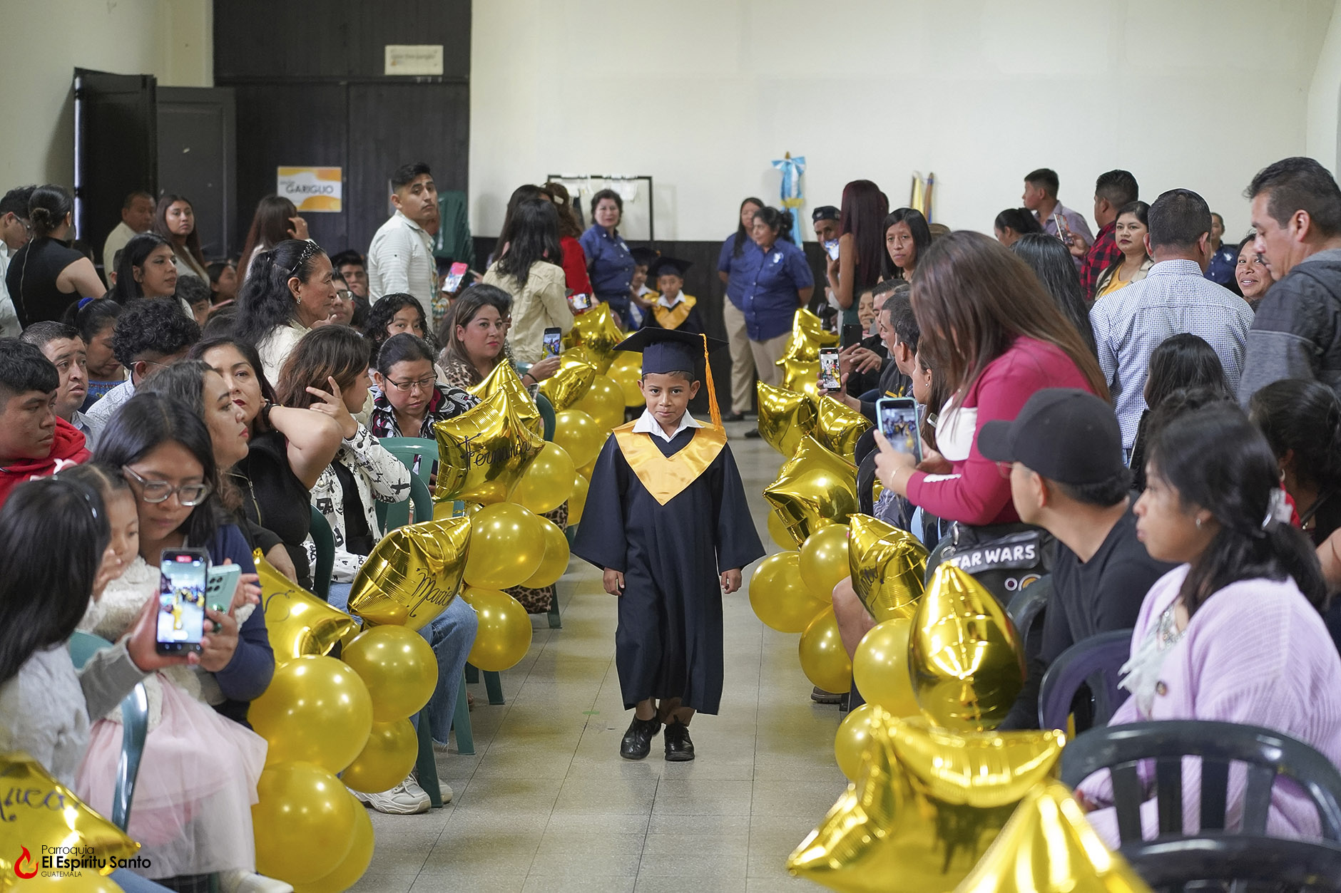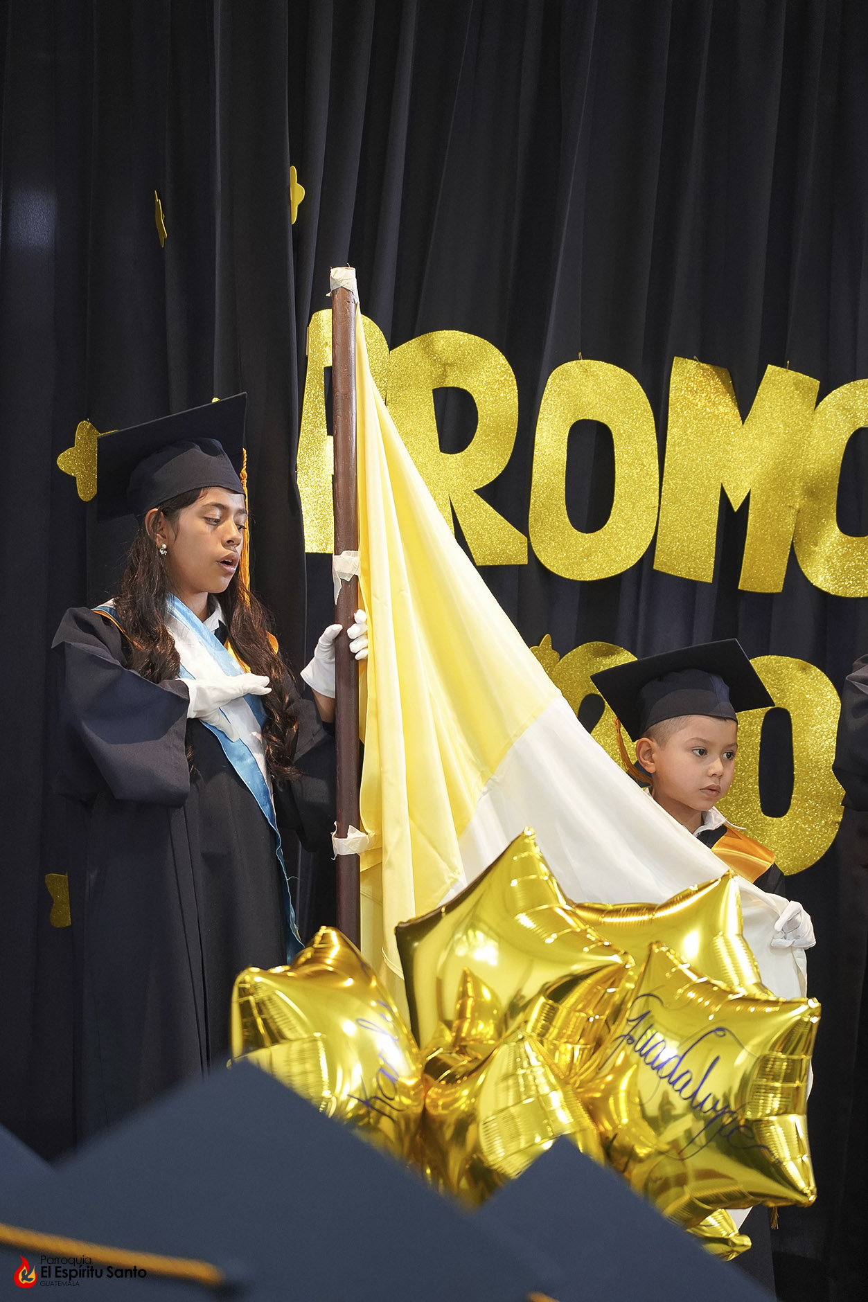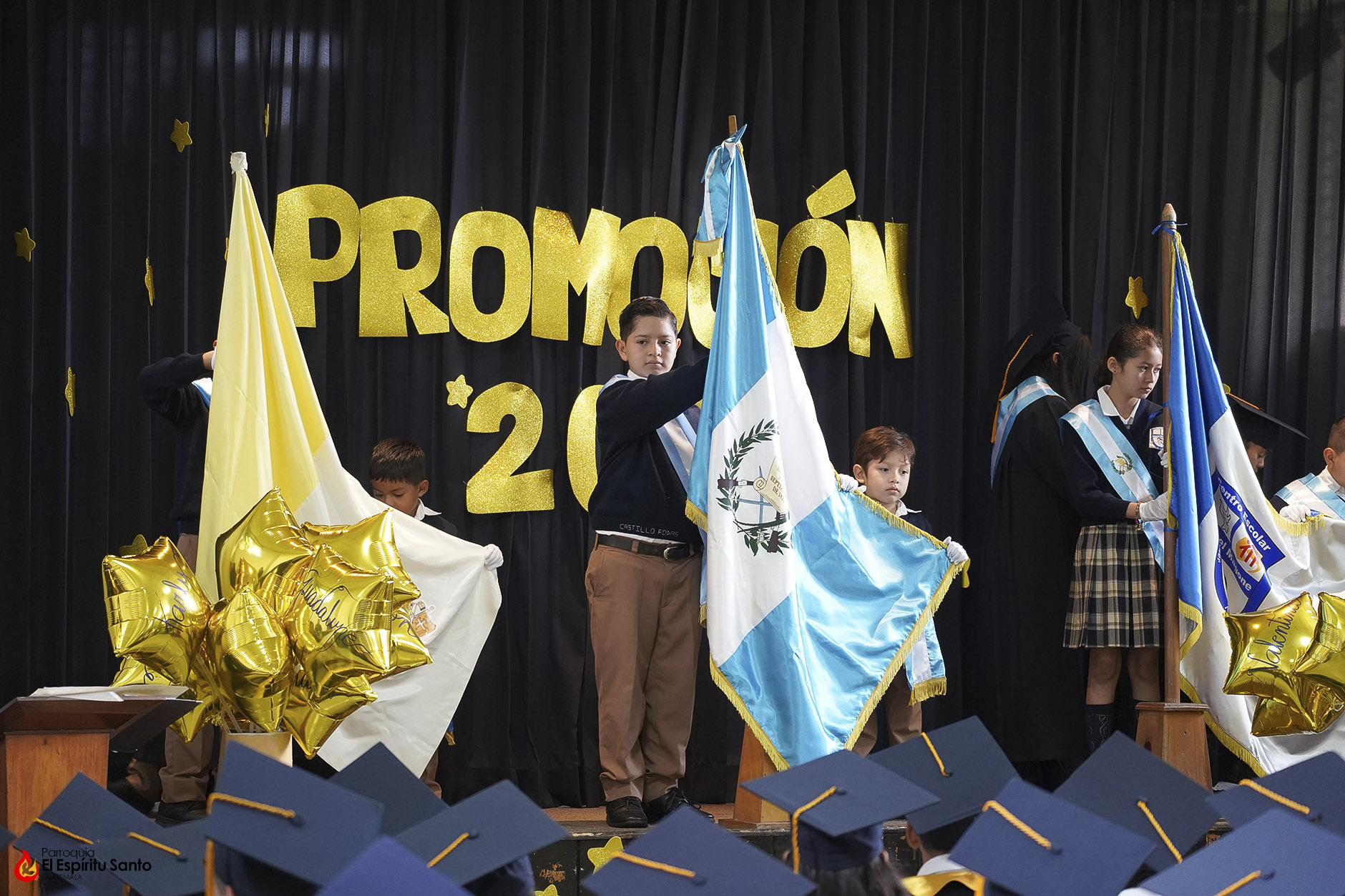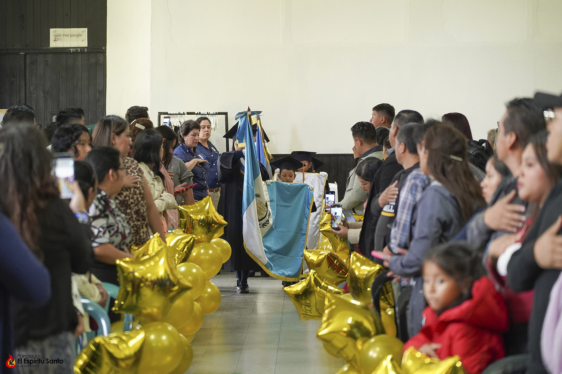 Posteriormente, los niños y sus familias se trasladaron hacia el Salón Don Bosco en donde se llevó a cabo el acto de clausura, el cual inició con el ingreso de las banderas de Guatemala, de la Iglesia y del Centro Escolar; luego se entonó el himno de Guatemala, seguido del himno de Centroamérica y el Salesiano.