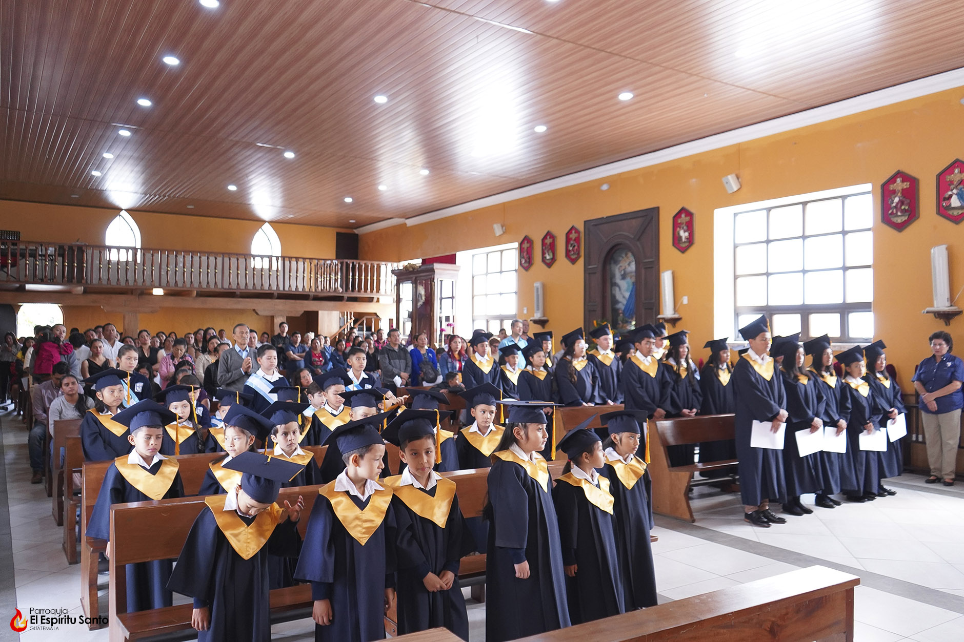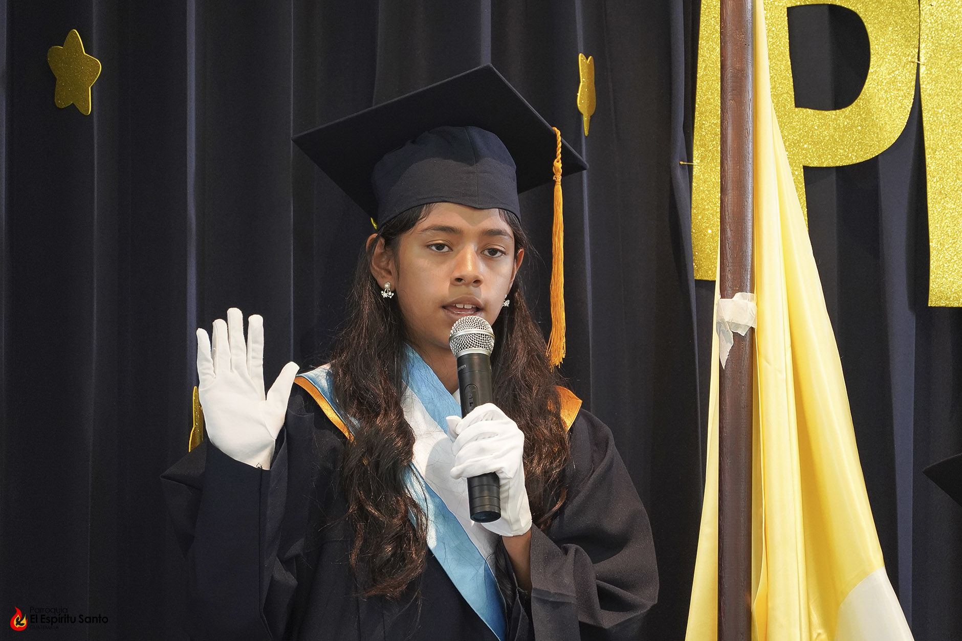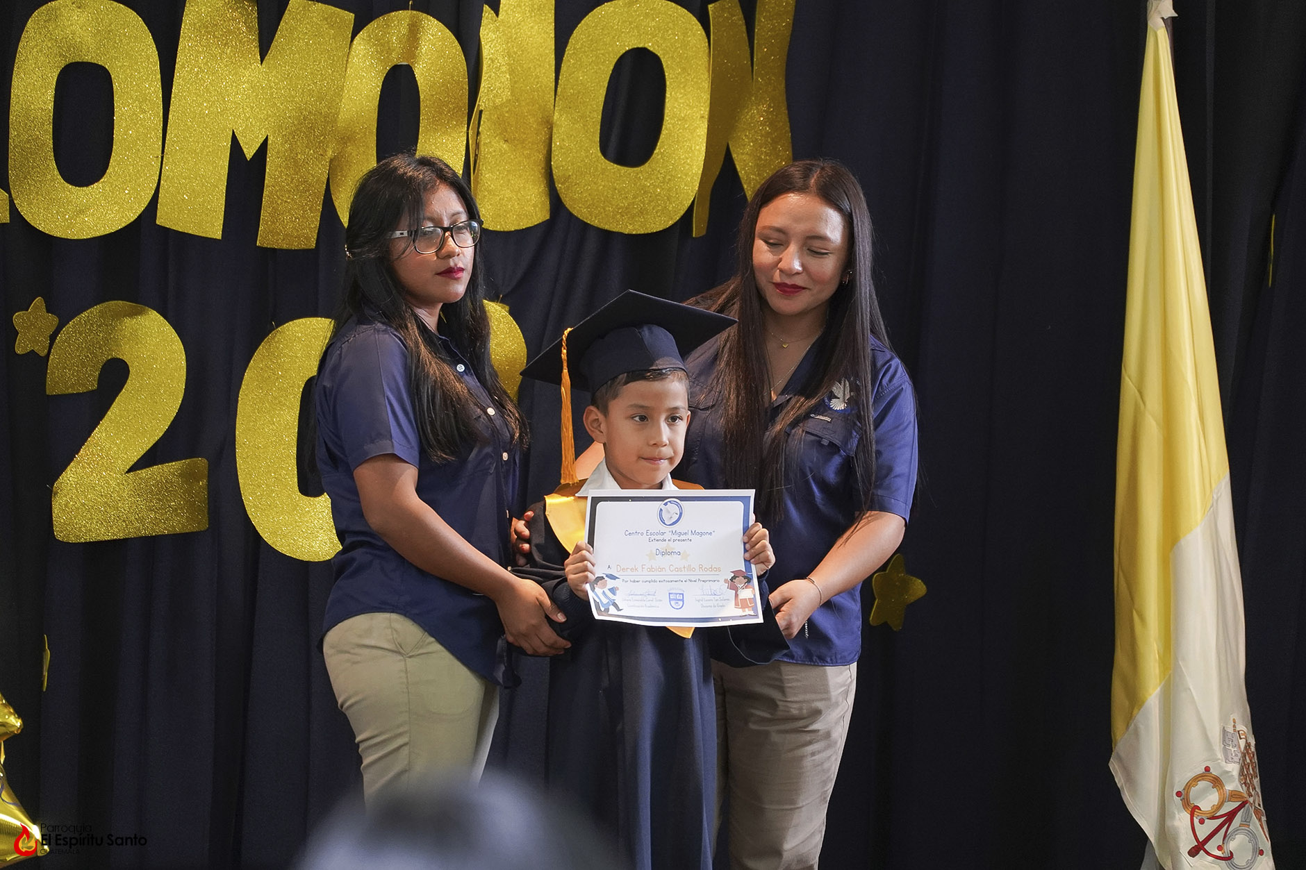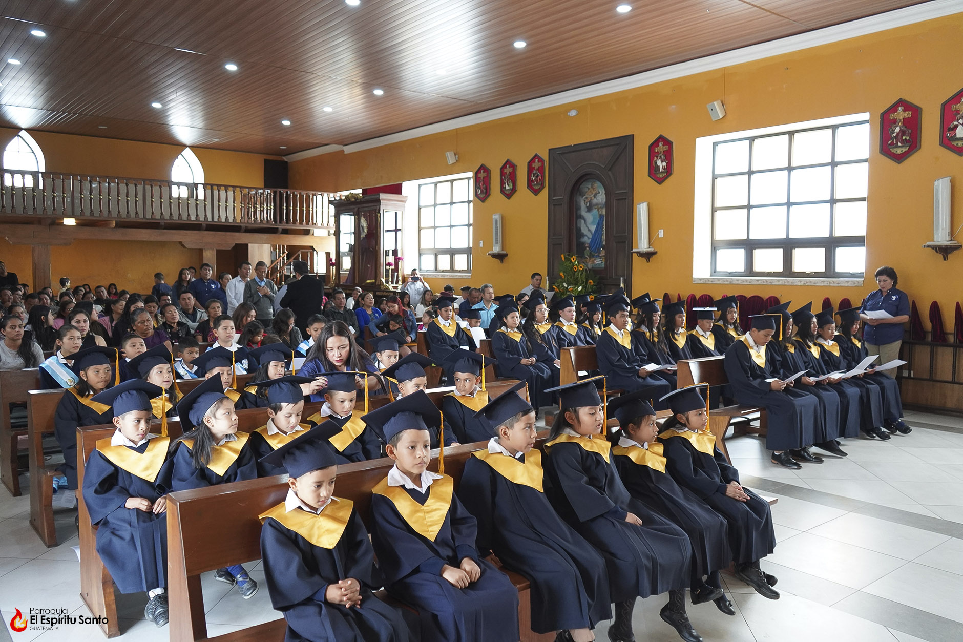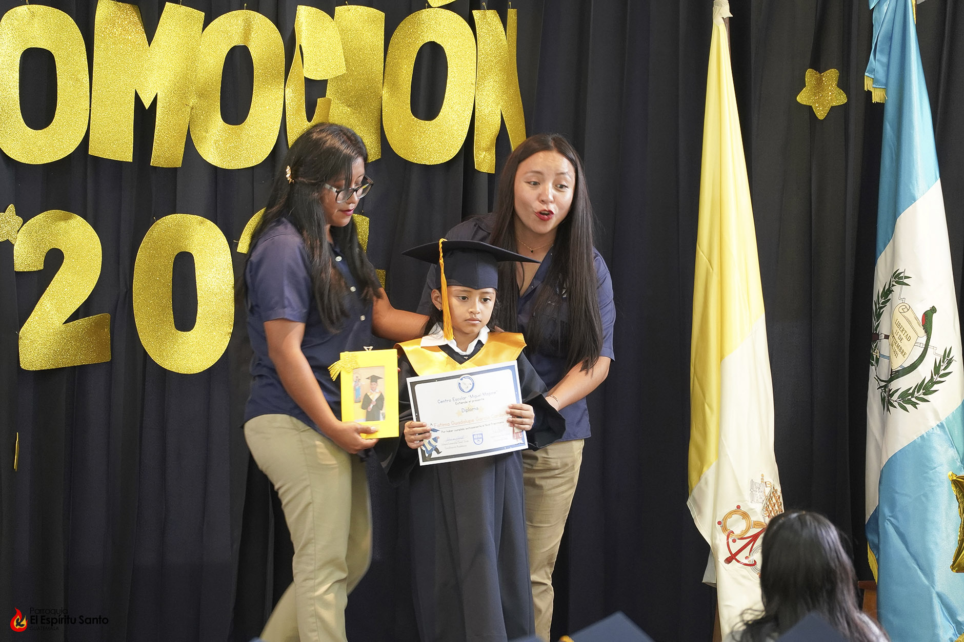 Posteriormente, los niños y sus familias se trasladaron hacia el Salón Don Bosco en donde se llevó a cabo el acto de clausura, el cual inició con el ingreso de las banderas de Guatemala, de la Iglesia y del Centro Escolar; luego se entonó el himno de Guatemala, seguido del himno de Centroamérica y el Salesiano.