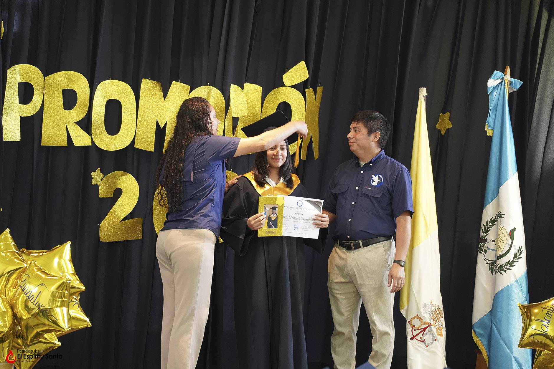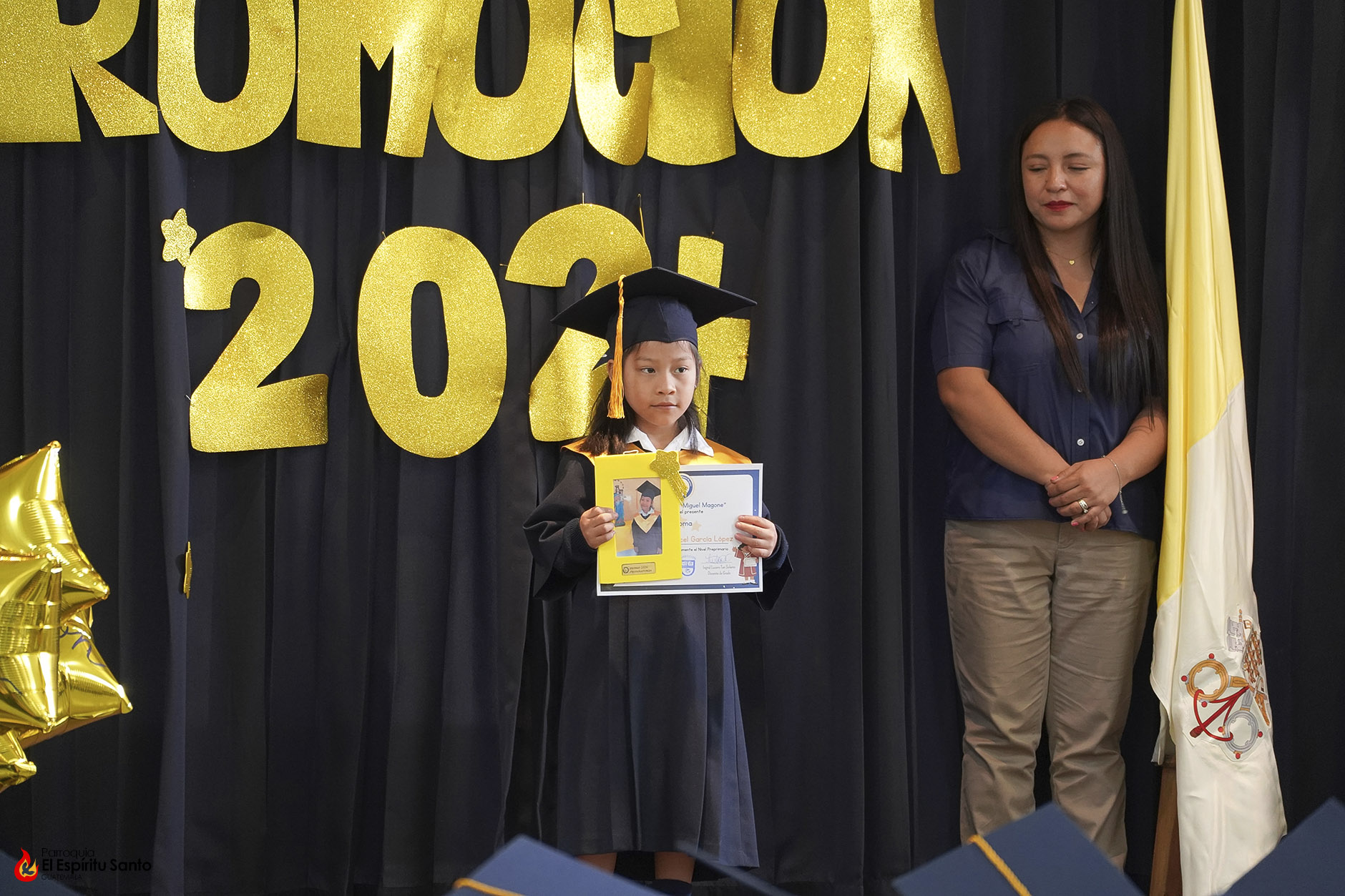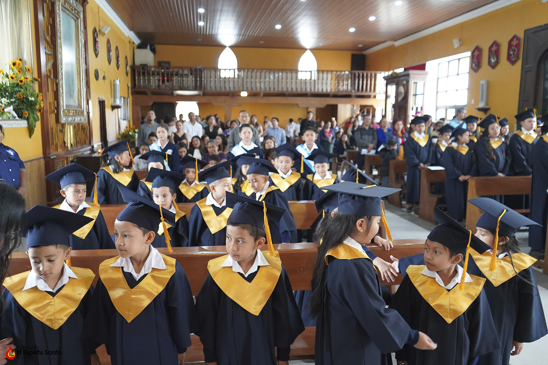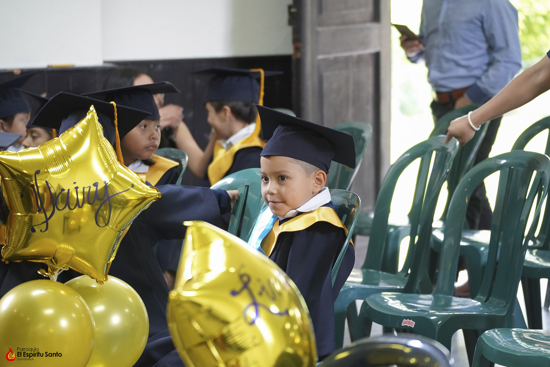 Posteriormente, los niños y sus familias se trasladaron hacia el Salón Don Bosco en donde se llevó a cabo el acto de clausura, el cual inició con el ingreso de las banderas de Guatemala, de la Iglesia y del Centro Escolar; luego se entonó el himno de Guatemala, seguido del himno de Centroamérica y el Salesiano.