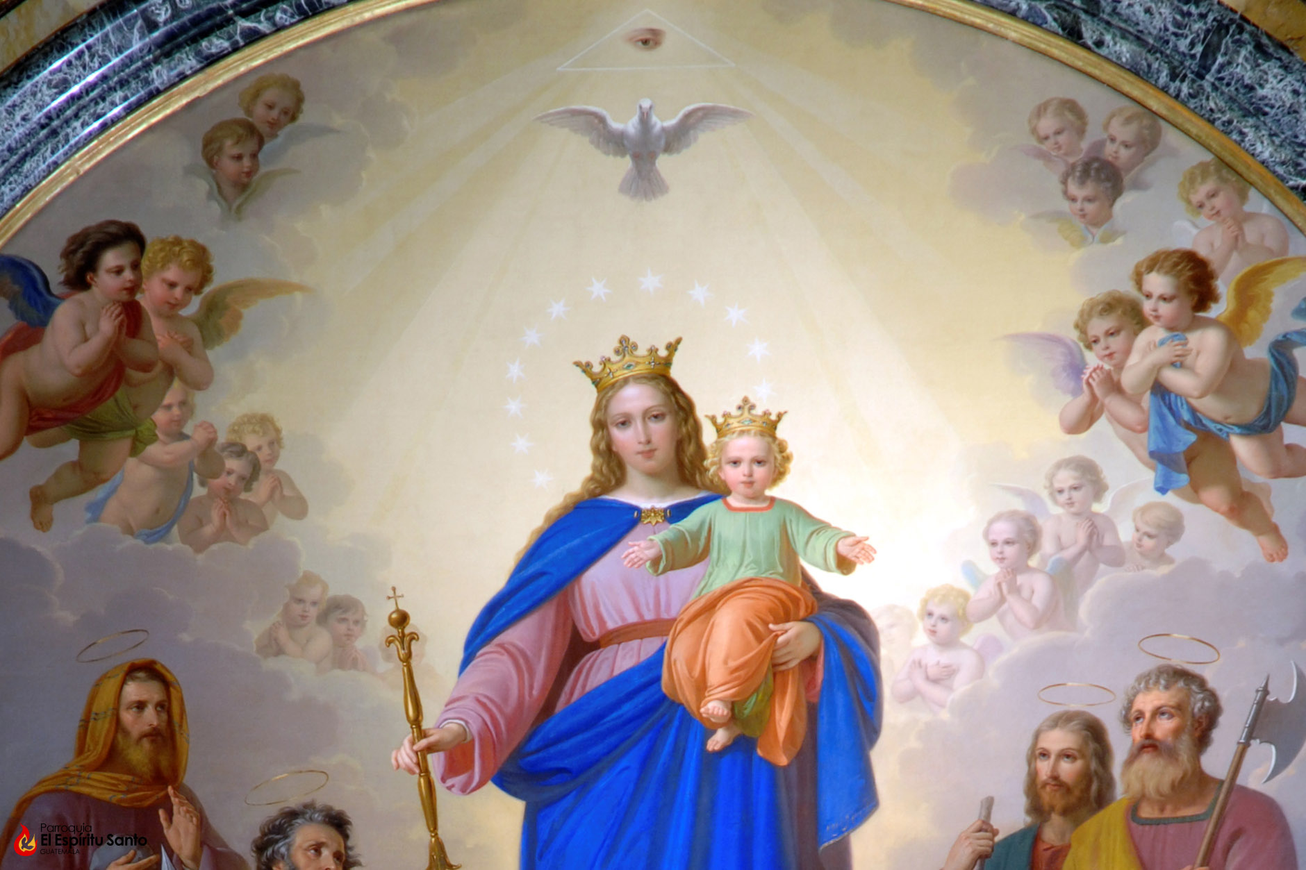 Sobre la Virgen se posa el Espíritu Santo, en símbolo de que ella es la elegida para ser el primer Sagrario; la que fue concebida sin mancha original; la Auxiliadora de todos los cristianos.