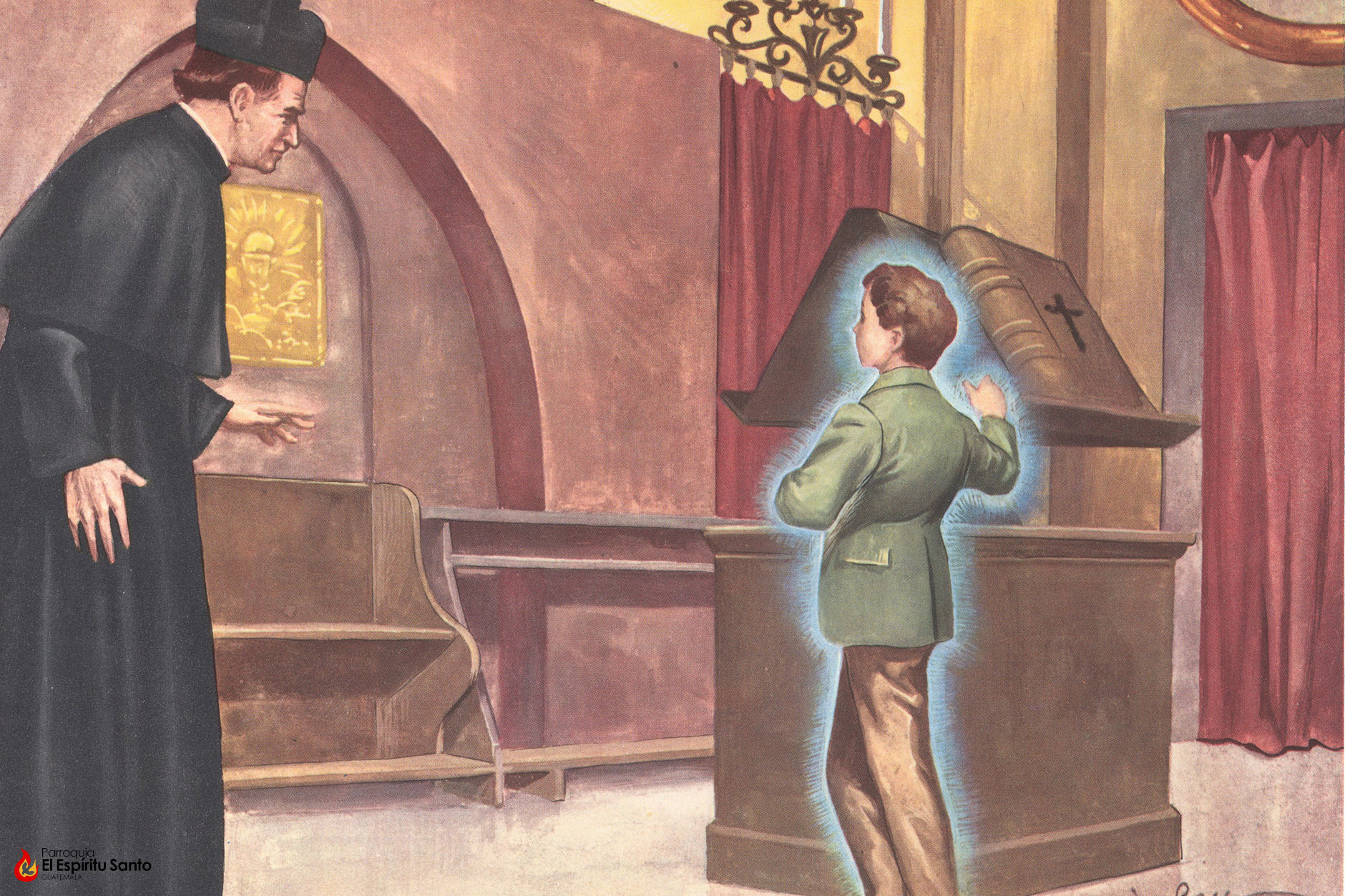 Acaeció, pues, que cierto día no apareció en el desayuno ni en clase, ni siquiera a la hora de la comida, sin que nadie pudiese decir dónde se encontraba; tampoco estaba en el estudio ni en la cama. Se informó lo que pasaba al director de la casa, y se le ocurrió a éste que estaría en la iglesia, como en otras ocasiones había acontecido. Efectivamente; va a la iglesia, se dirige al coro y lo halla allí, inmóvil como una estatua. Tenía un pie sobre otro y apoyada una mano sobre el atril del antifonario, mientras que la otra la tenía junto a su pecho. Su rostro estaba dirigido hacia el sagrario y fijo en él. Le llama, y no responde. Le sacude, y entonces se vuelve para mirarle, y exclama: