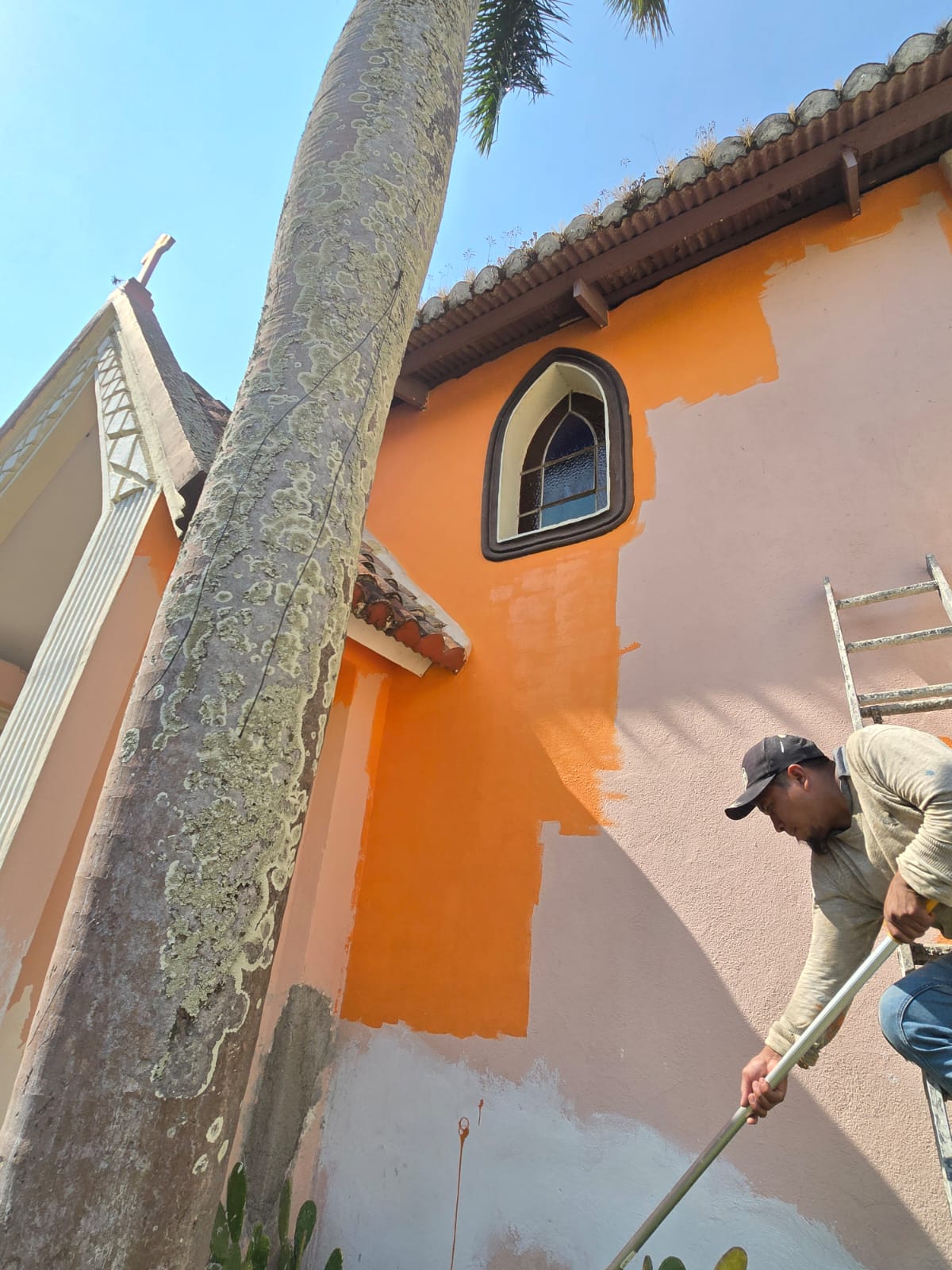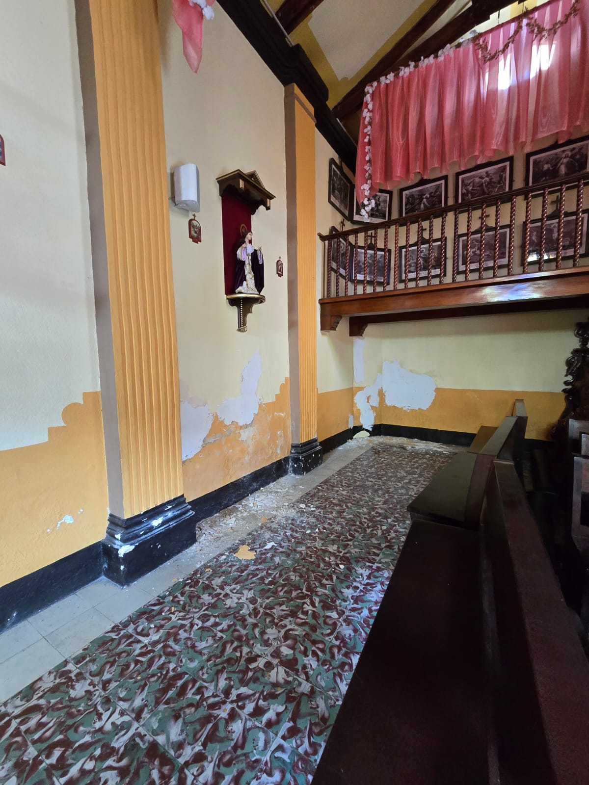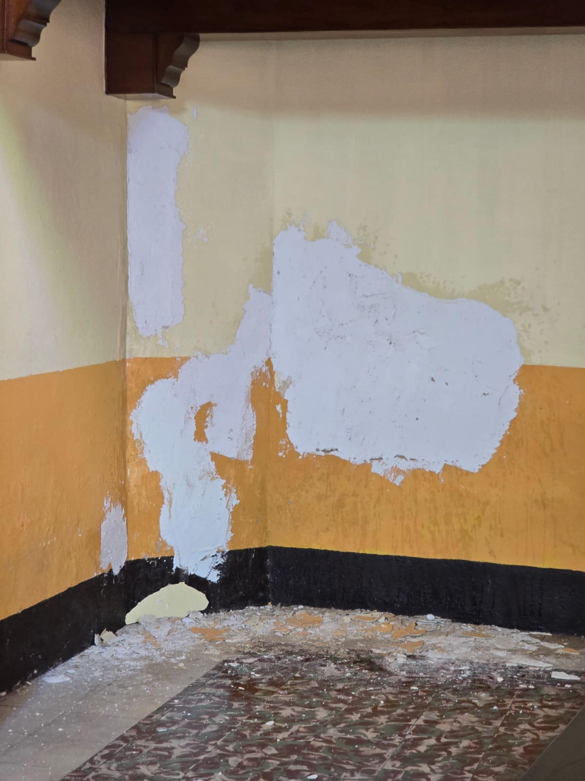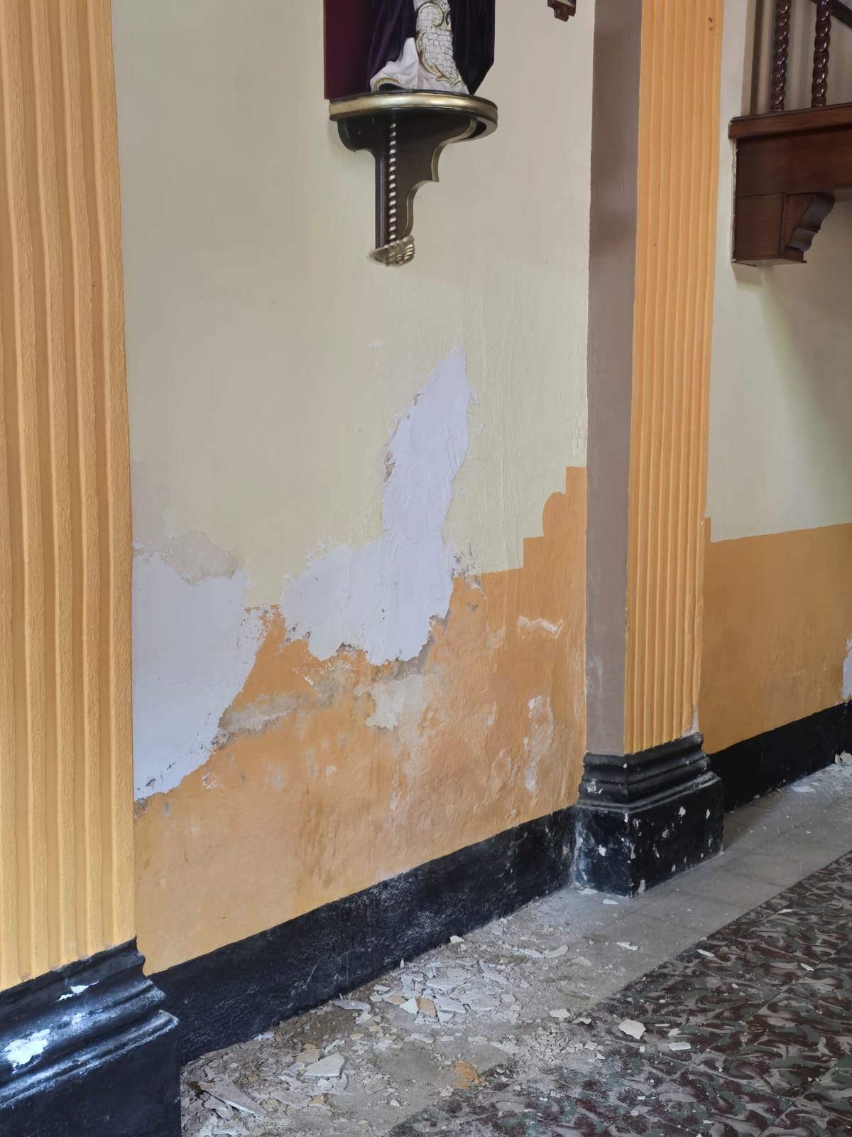 Las paredes, tanto interiores como exteriores, han mostrado daños ocasionados por la humedad acumulada en su interior debido a que las mismas son de adobe, por lo que ha sido indispensable retirar parte del repello para solventar dicho inconveniente y colocarlo nuevamente. Además de esto, se ha procedido a renovar toda la pintura exterior de la capilla.