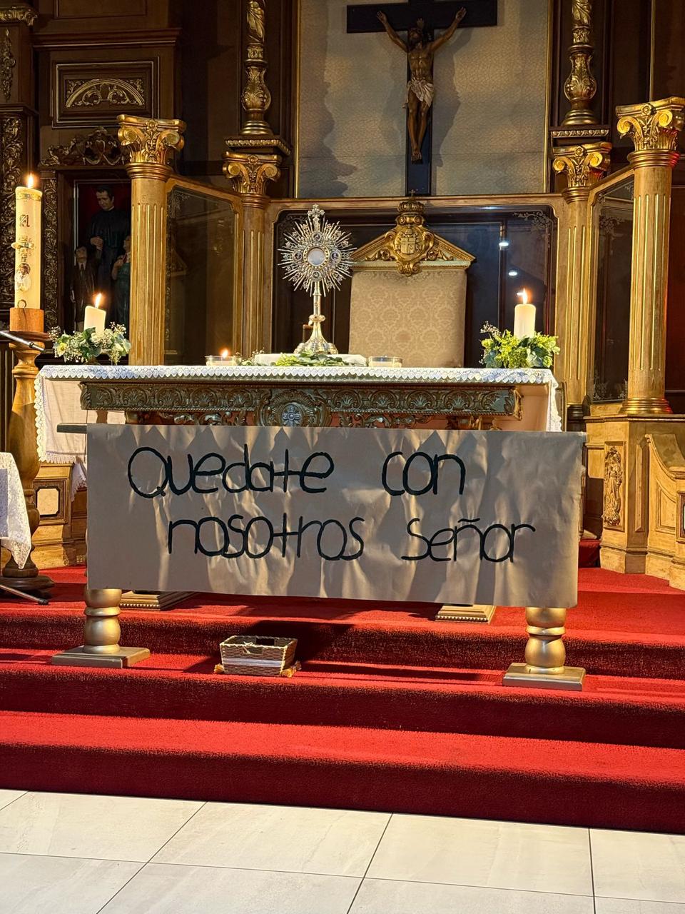 Durante este momento de Adoración rezaron el Santo Rosario ante el Santísimo Sacramento y acompañados de nuestra madre, María Auxiliadora, a quien colocaron en un bonito altar, cerca de sus devotos. Para la ocasión decoraron el altar con arreglos florales en tonos blanco y amarillo, además de un bello cartel con la frase: «Quédate con nosotros, Señor».