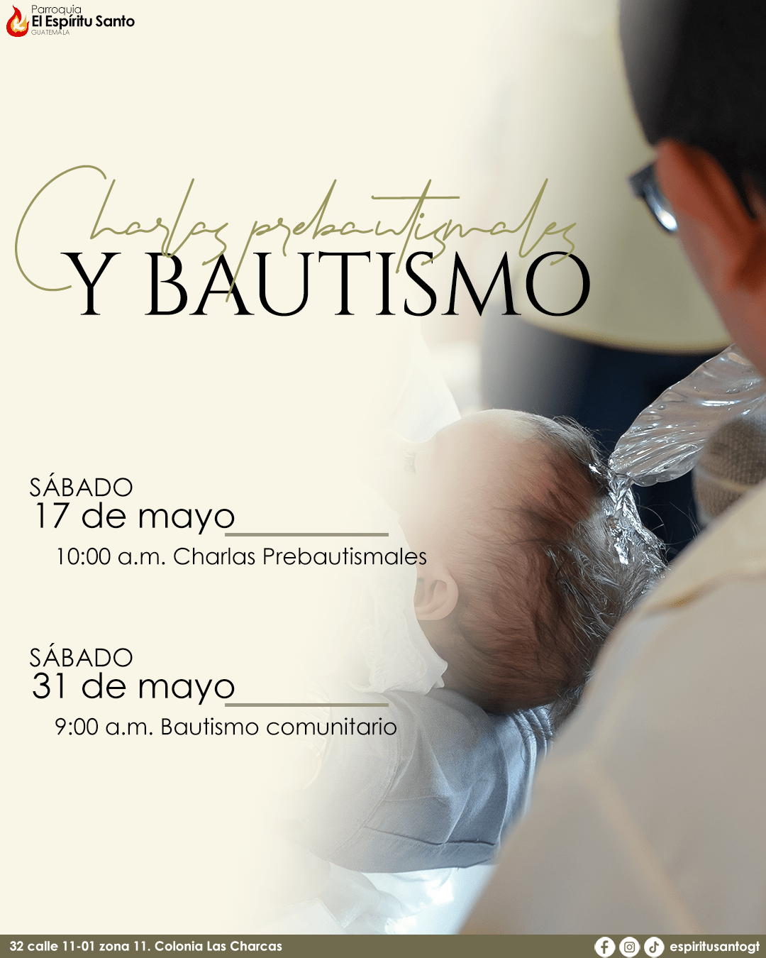 En mayo, las Charlas Prebautismales se estarán realizando el sábado, 17 de mayo, a las 10:00 a.m. en el Salón Don Bosco, mientras que el Bautismo comunitario se efectuará el sábado, 31 de mayo, a las 9:00 a.m. en el Templo Parroquial.