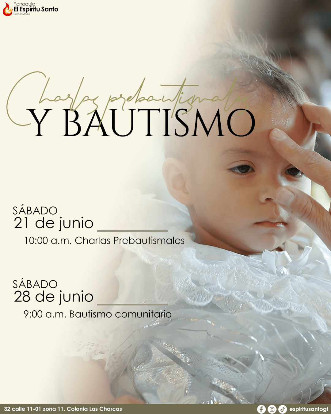 Para Junio, las Charlas Prebautismales se llevarán a cabo el sábado, 21 de junio, a las 10:00 a.m. en el interior del Salón Don Bosco y el Sacramento del Bautismo se impartirá el sábado, 28 de junio, a las 8:00 a.m. en nuestro templo parroquial.