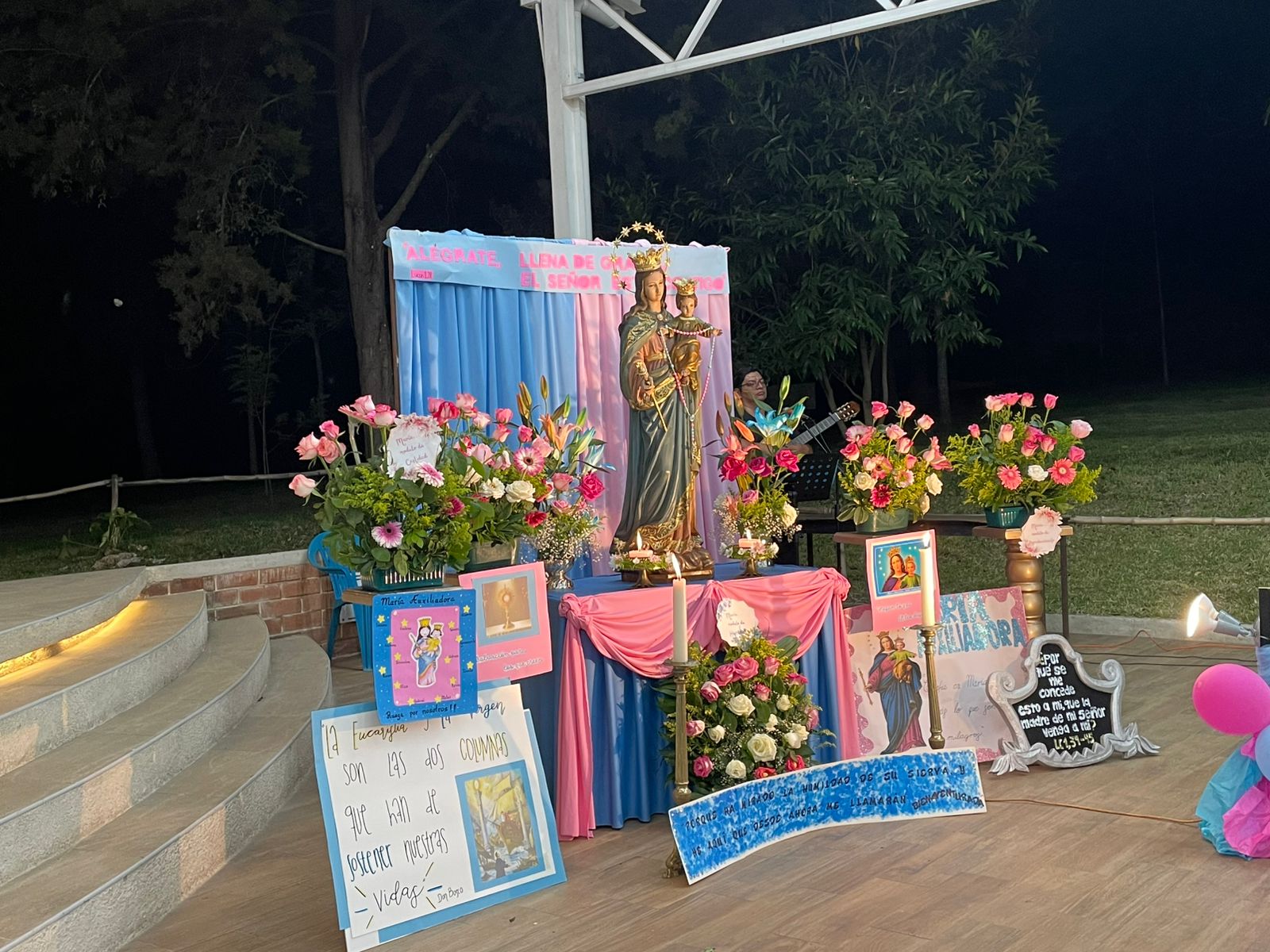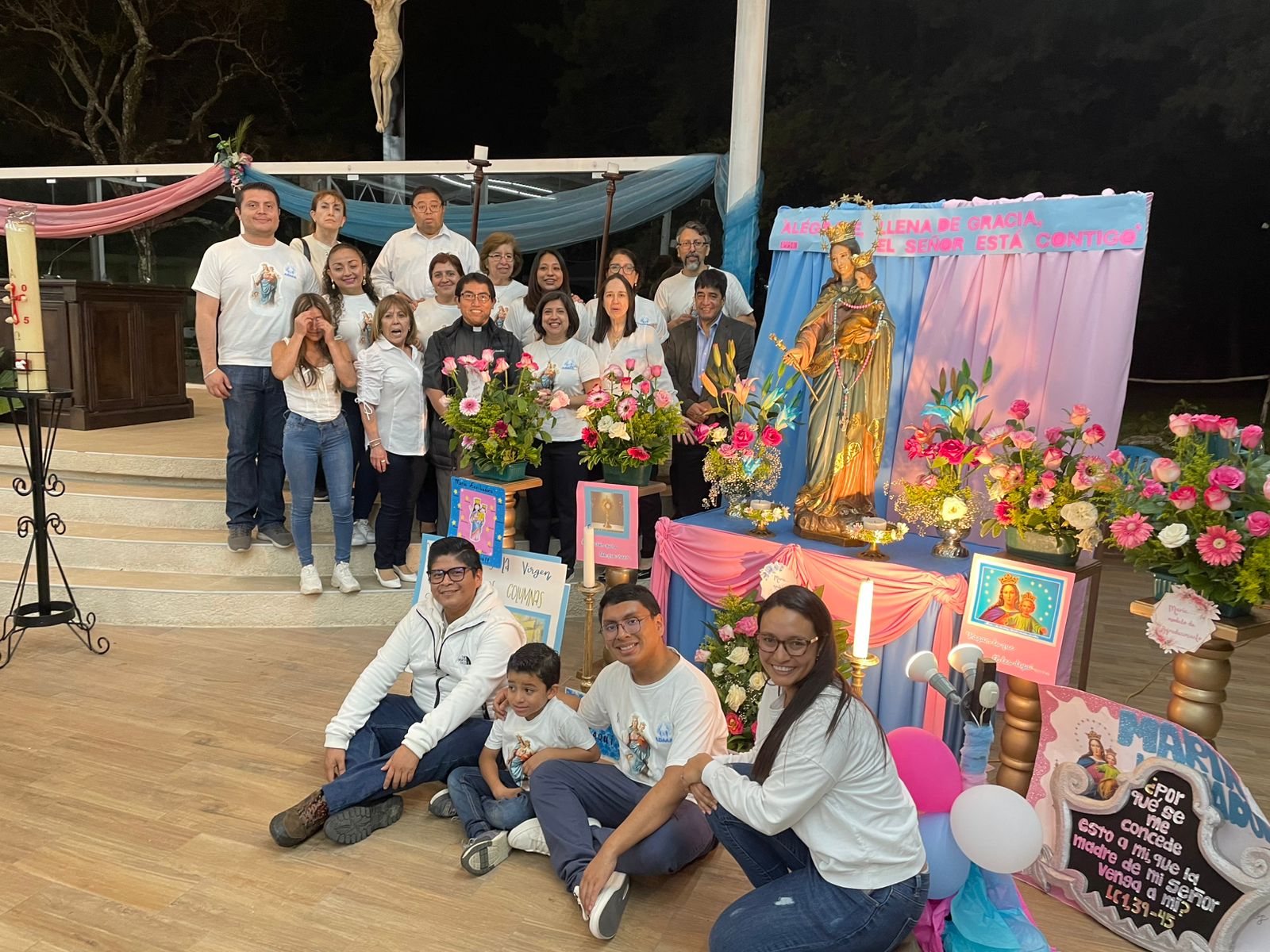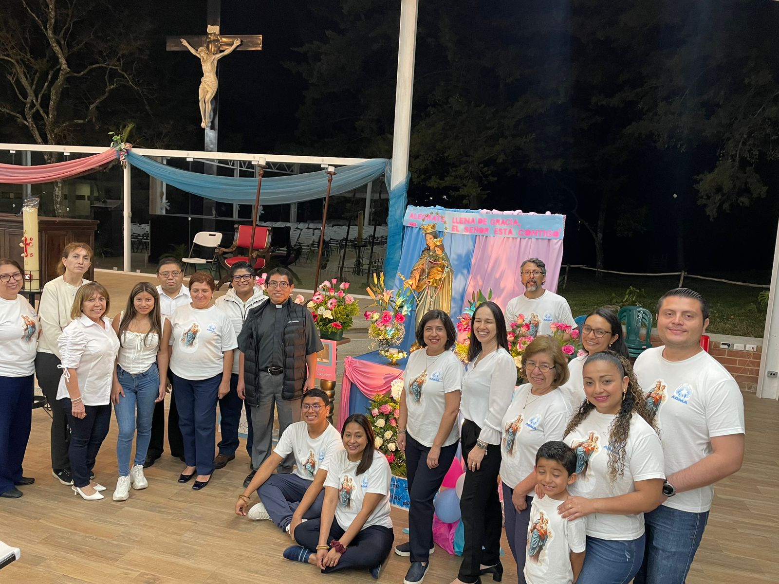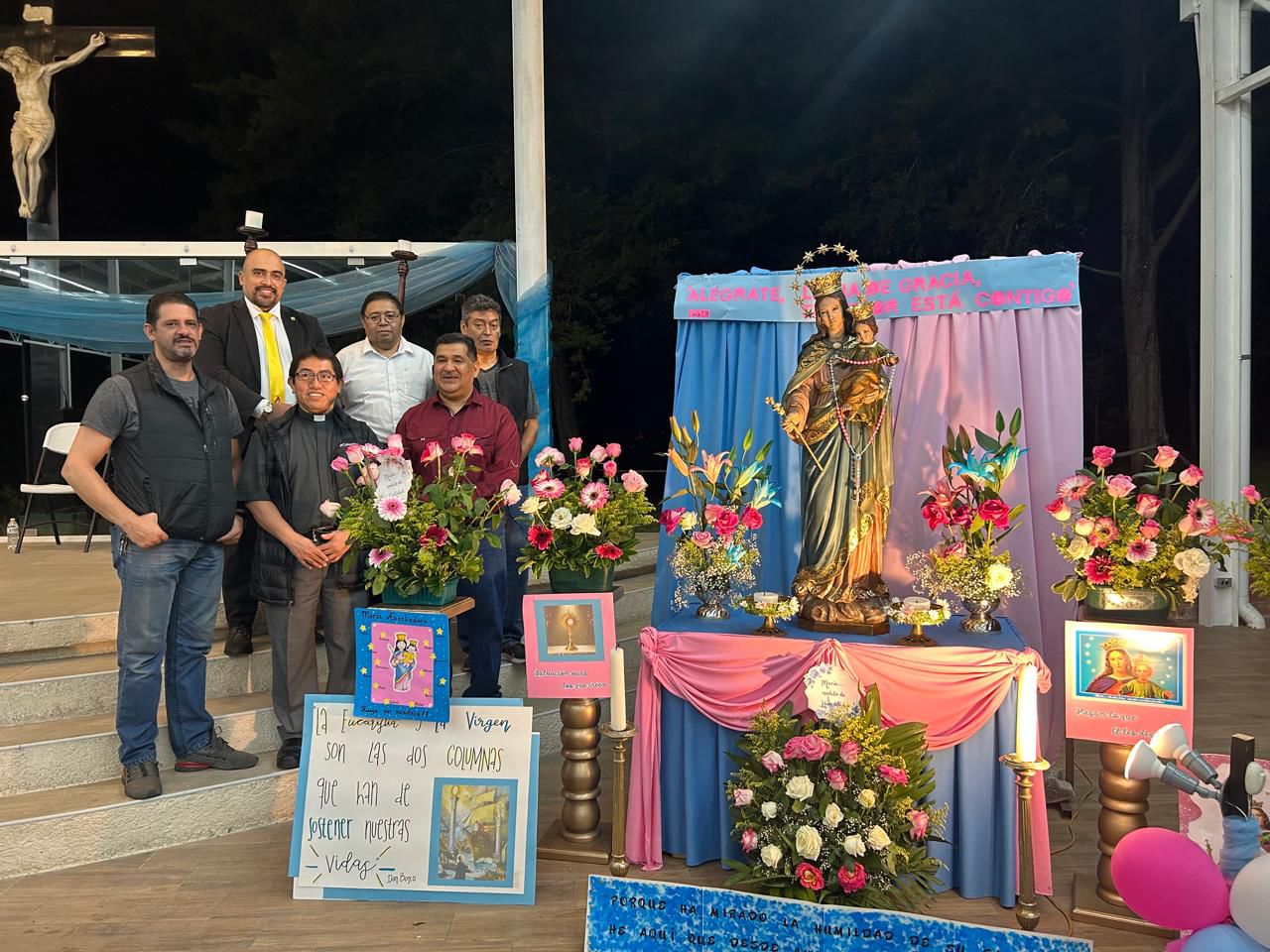 Iniciando a las 7:00 p.m. se celebró la Santa Eucaristía en el Salón Campestre en honor a la Virgen de Don Bosco, para lo cual se colocó un bonito altar con la imagen de María Auxiliadora que fue decorado con bellos arreglos florales y carteles elaborados por los diferentes grupos parroquiales quienes participaron en los días previos en el rezo de la novena. La Misa fue presidida por nuestro párroco, padre Carlos Macz, SDB.