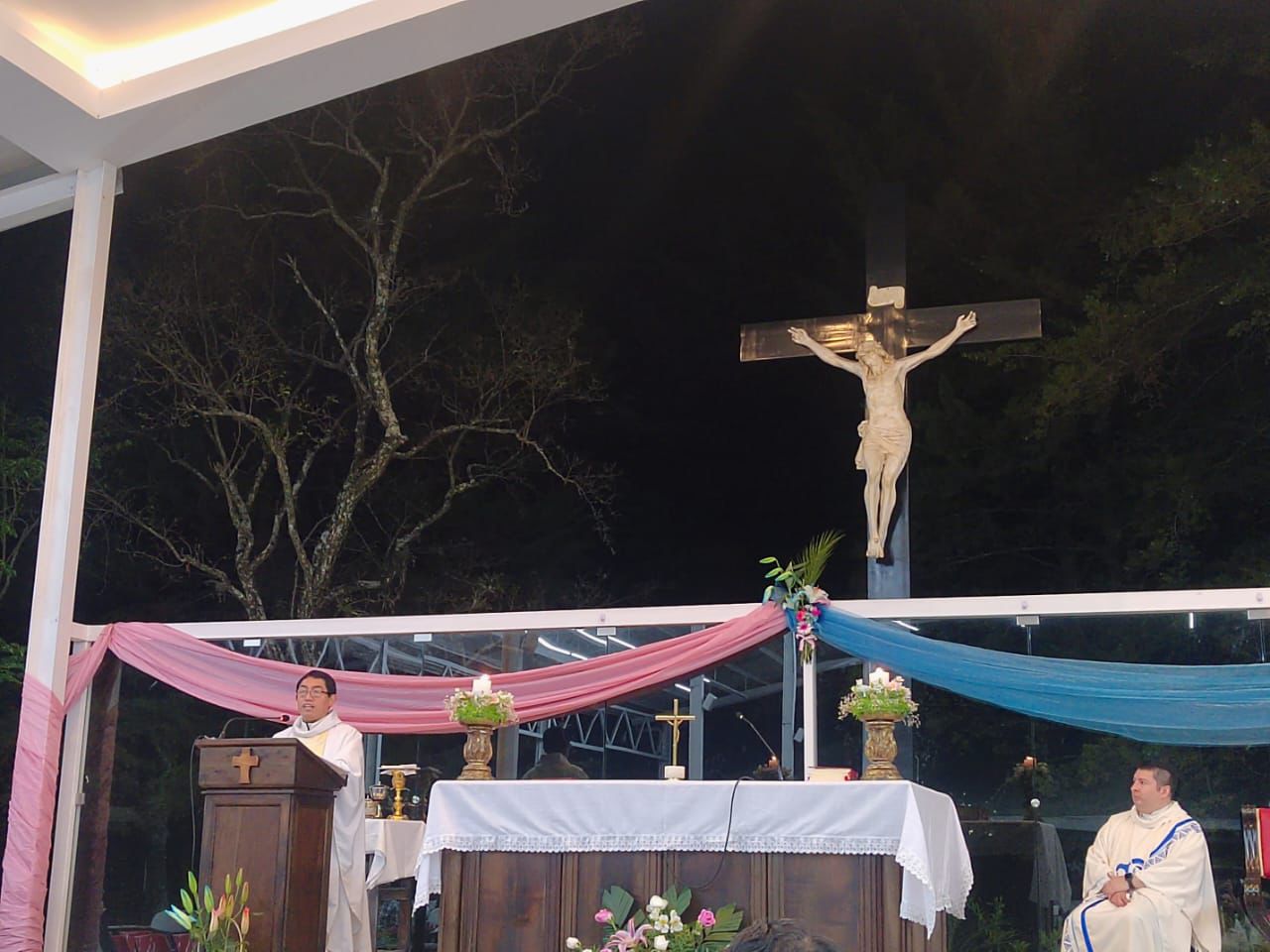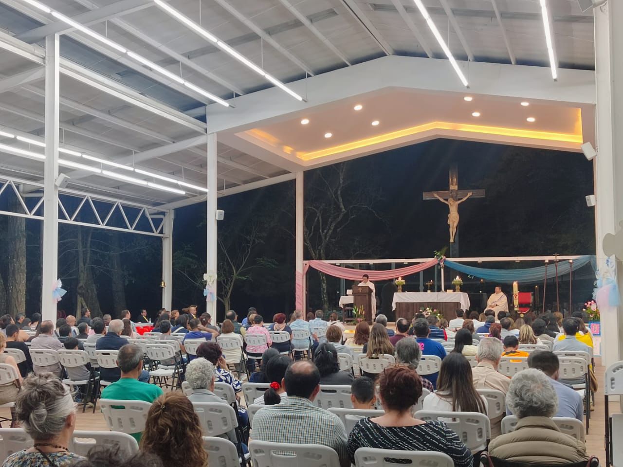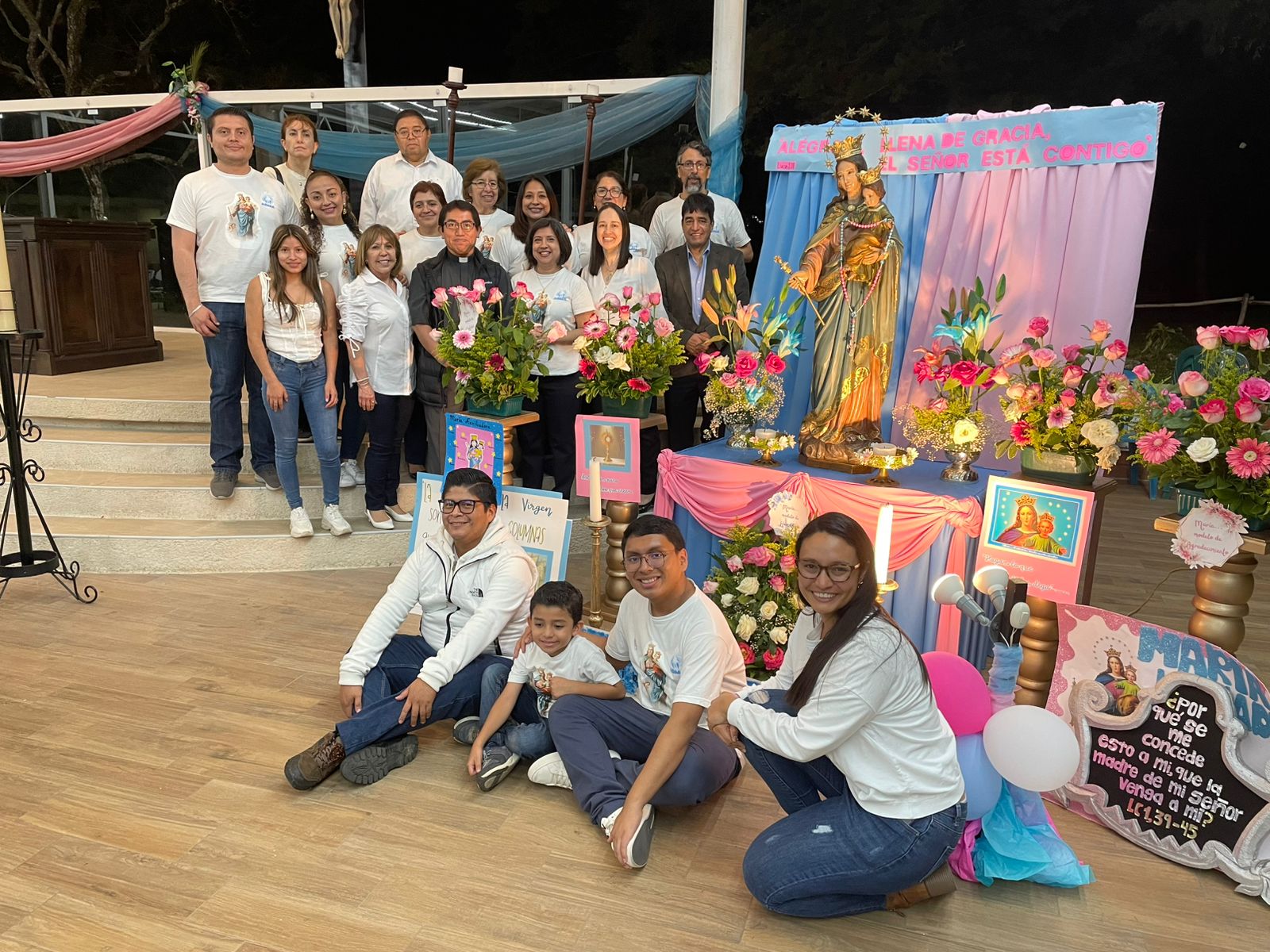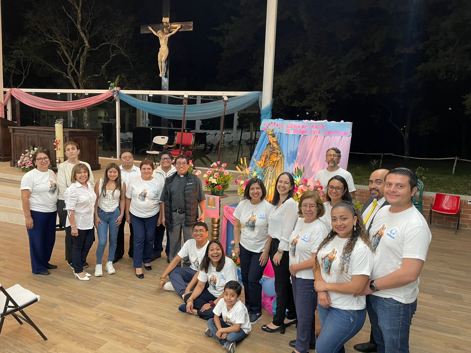 Iniciando a las 7:00 p.m. se celebró la Santa Eucaristía en el Salón Campestre en honor a la Virgen de Don Bosco, para lo cual se colocó un bonito altar con la imagen de María Auxiliadora que fue decorado con bellos arreglos florales y carteles elaborados por los diferentes grupos parroquiales quienes participaron en los días previos en el rezo de la novena. La Misa fue presidida por nuestro párroco, padre Carlos Macz, SDB.