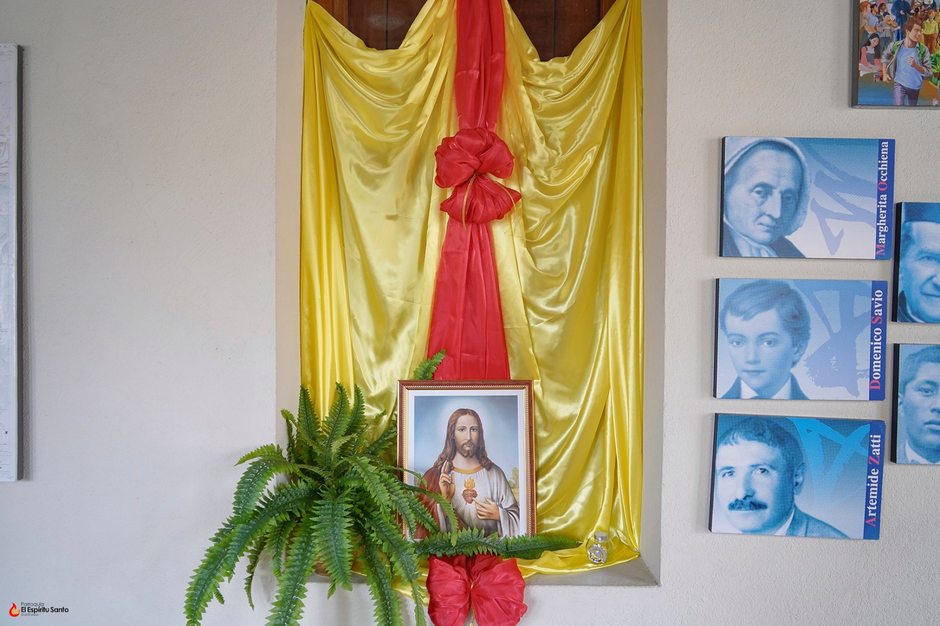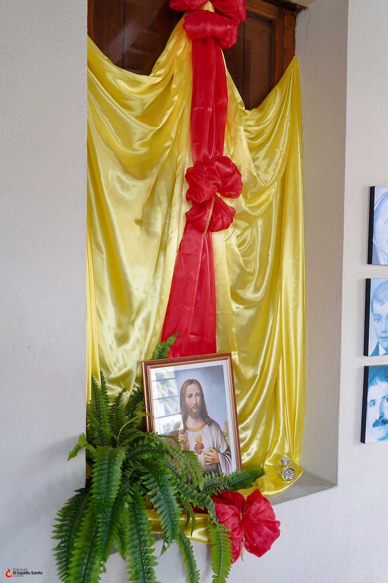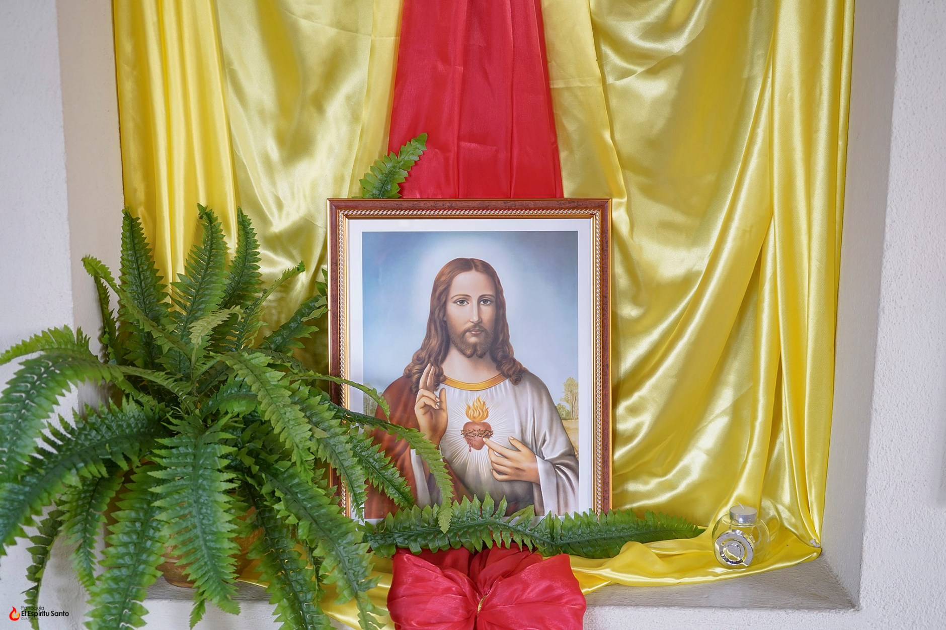 La decoración que enmarca esta entronización resalta por su sobriedad y simbolismo. Un fondo de tela satinada en color amarillo brillante, símbolo de luz y gloria, sirve de base para una banda central de intenso rojo, que evoca el amor ardiente del Corazón de Cristo. Dos moños en el mismo tono rojo acentúan visualmente el arreglo, aportando elegancia y solemnidad. A los pies del cuadro, un helecho natural añade frescura y vida a la escena, mientras una flor roja y una vela encendida completan el altar improvisado, invitando al recogimiento y a la oración.