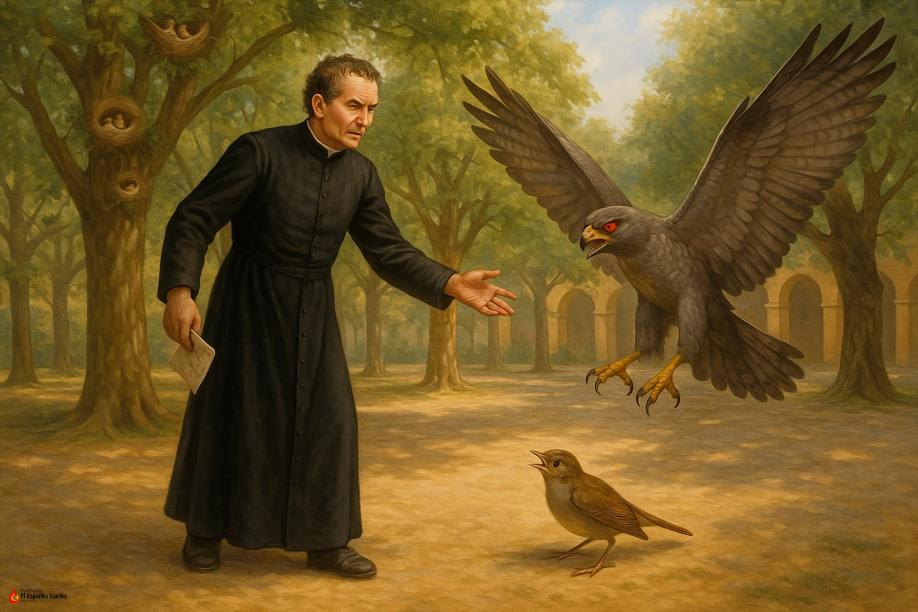 Después volvió a aparecer el terrible gavilán con feroz mirada y ojos llenos de sangre. Yo lo regañé por haber sido tan cruel con aquel animalito y traté de lanzarle una pedrada. El huyó lleno de miedo, pero antes de alejarse lanzó hacia mí un papel en el que estaba escrito el nombre de diez alumnos que no quisieron hacer bien los Retiros Espirituales.