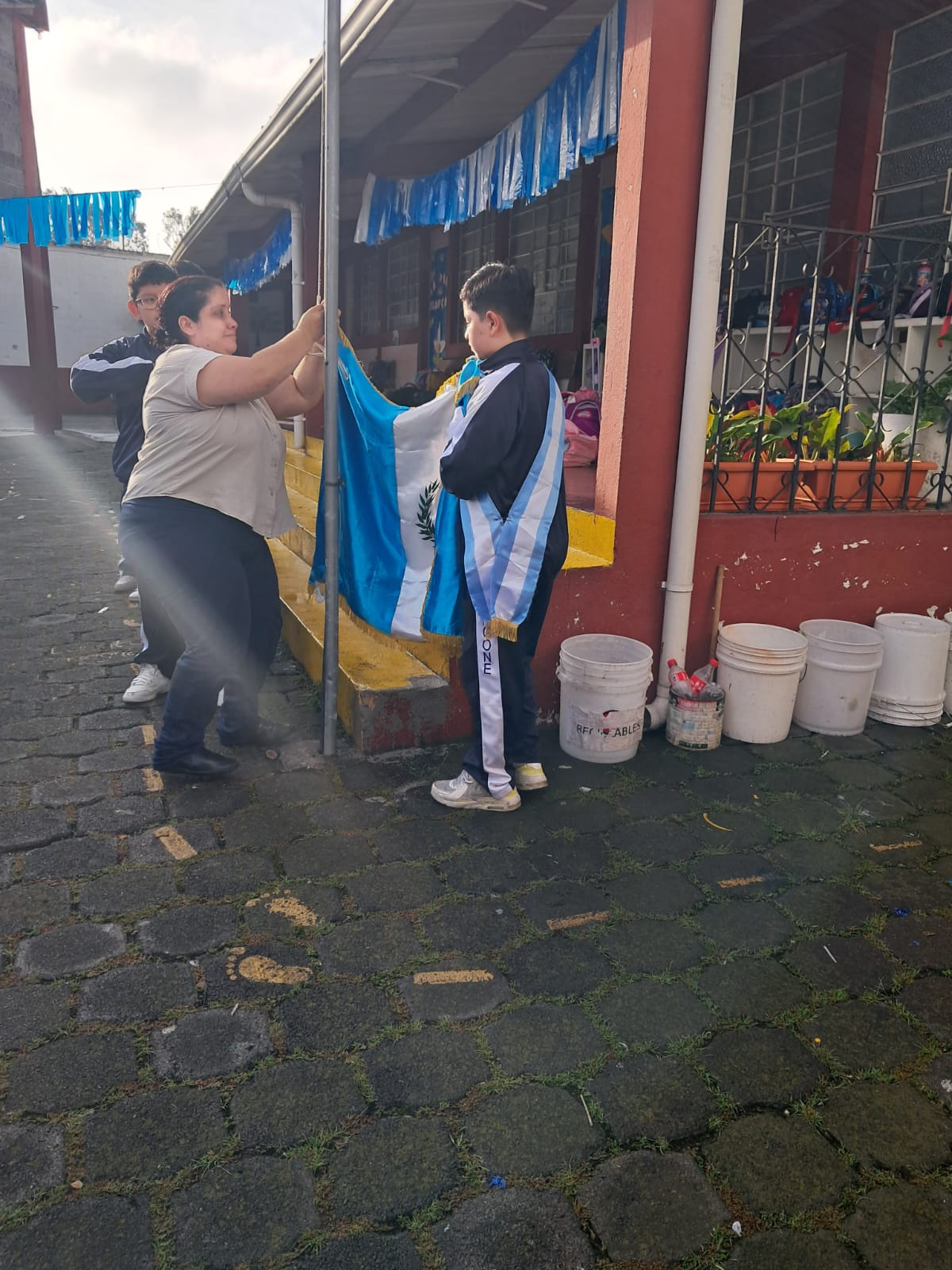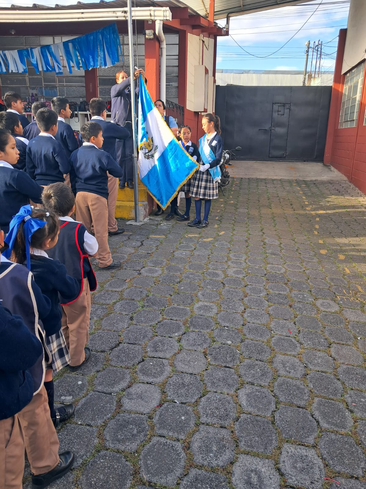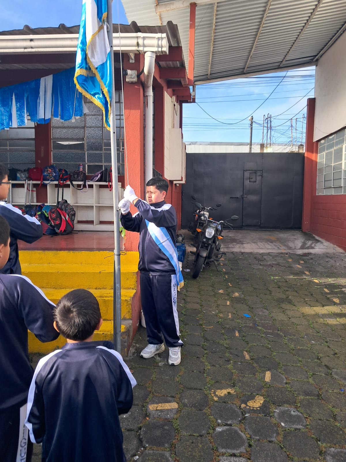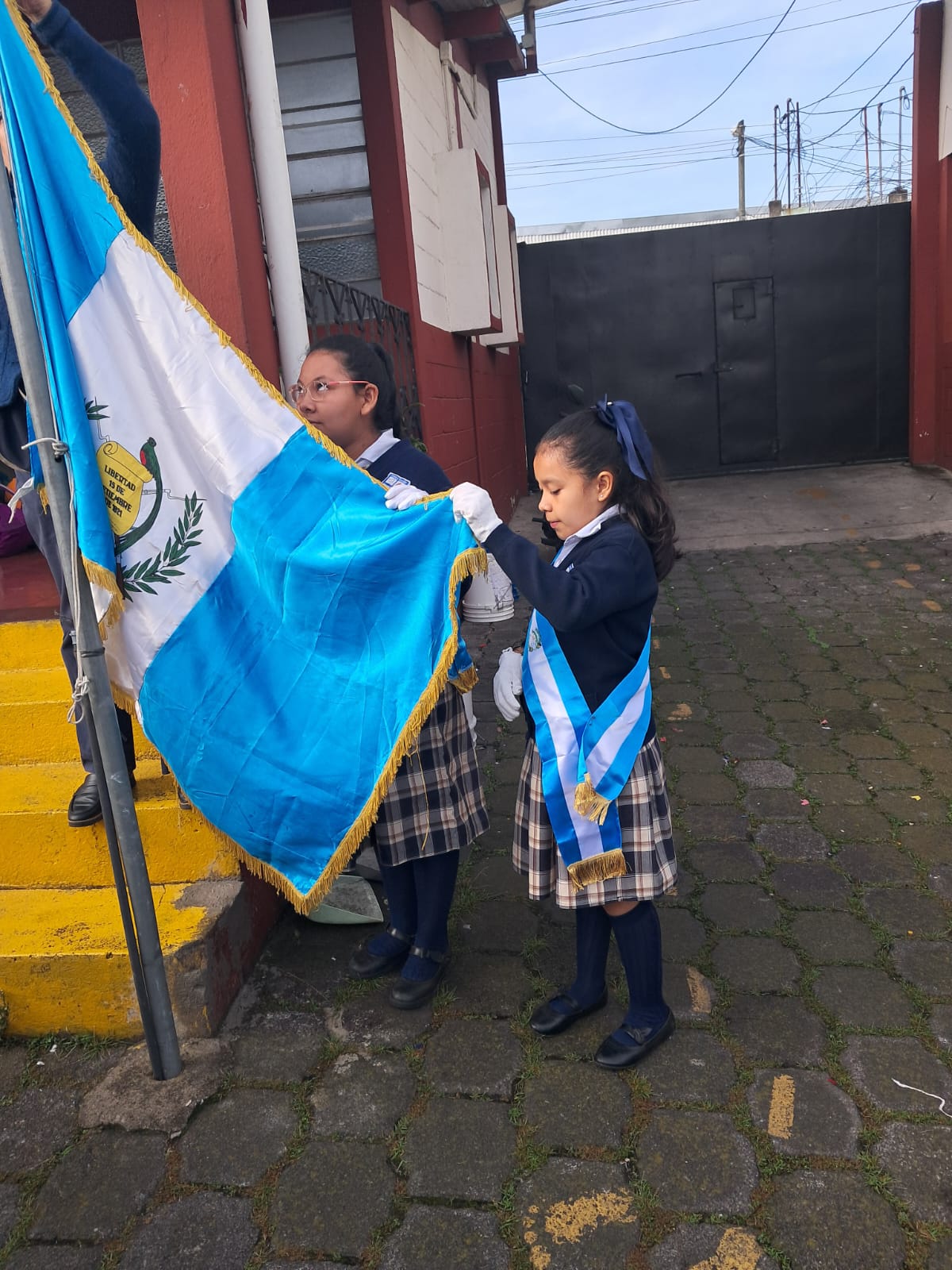 La jornada comenzó con la izada del pabellón nacional, un honor que recayó en los alumnos destacados de sexto primaria. Posteriormente, todos los presentes entonaron con entusiasmo el Himno Nacional de Guatemala, llenando el ambiente de orgullo y respeto hacia los símbolos patrios.