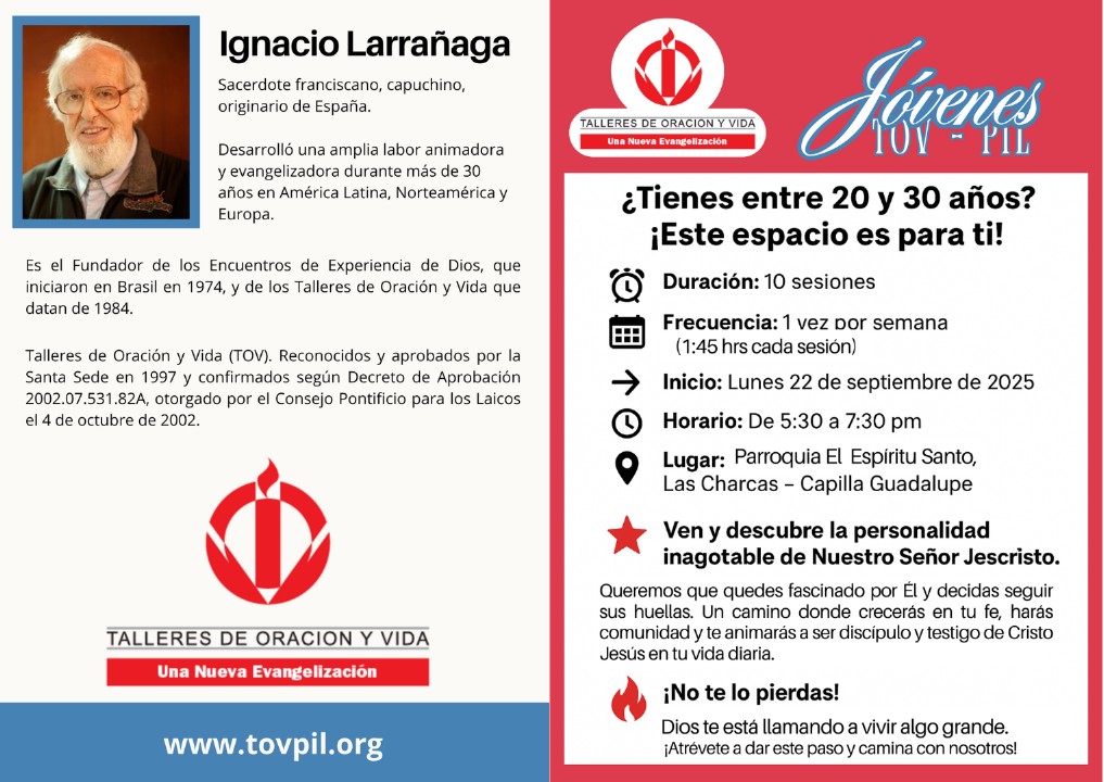 Nuestra parroquia abrirá sus puertas a los jóvenes de entre 20 y 30 años con una nueva edición de los Talleres de Oración y Vida (TOV), una iniciativa fundada por el sacerdote franciscano capuchino Ignacio Larrañaga, reconocido por su amplia labor evangelizadora en América Latina y Europa.