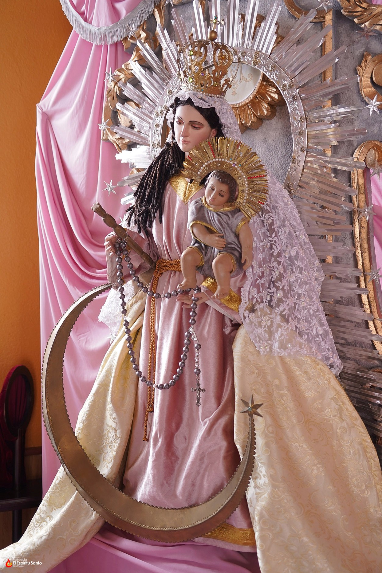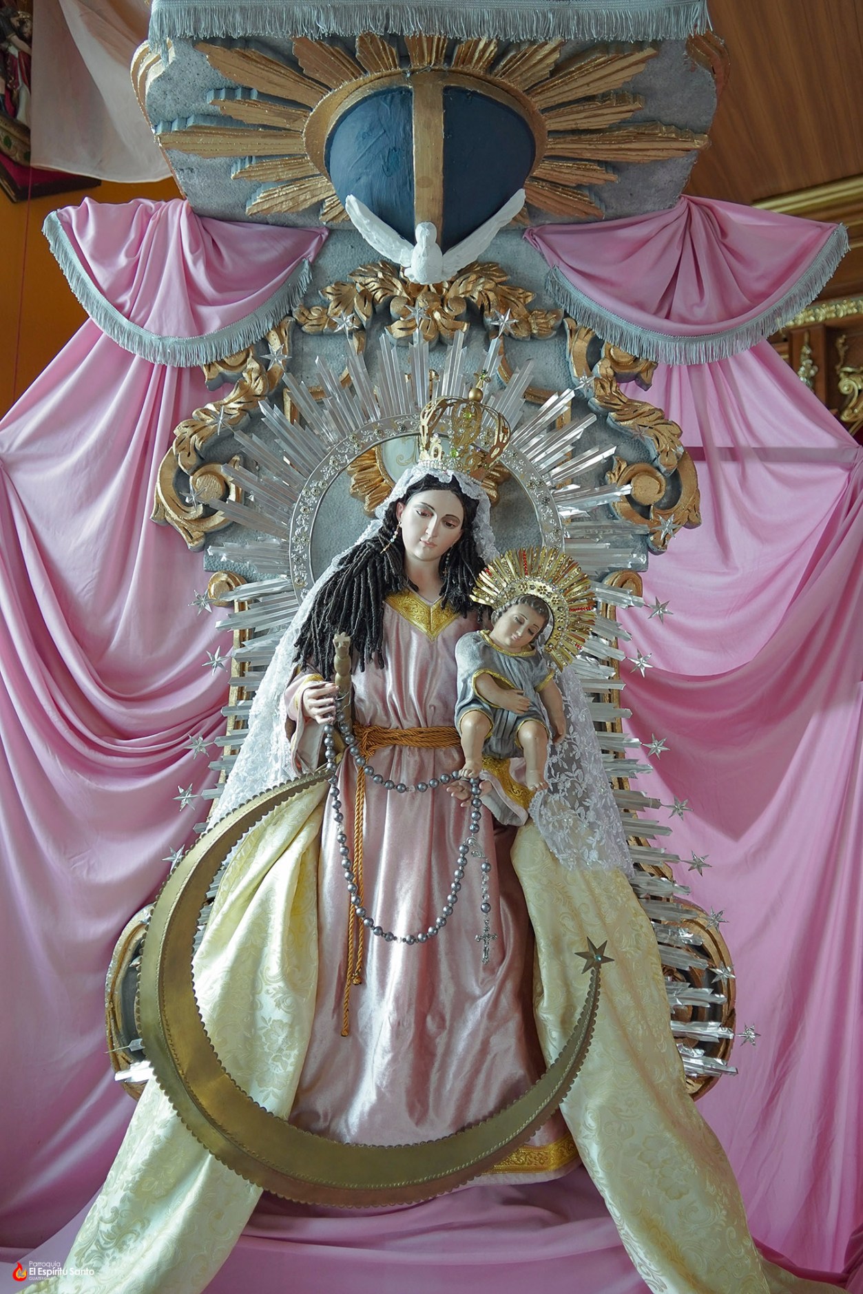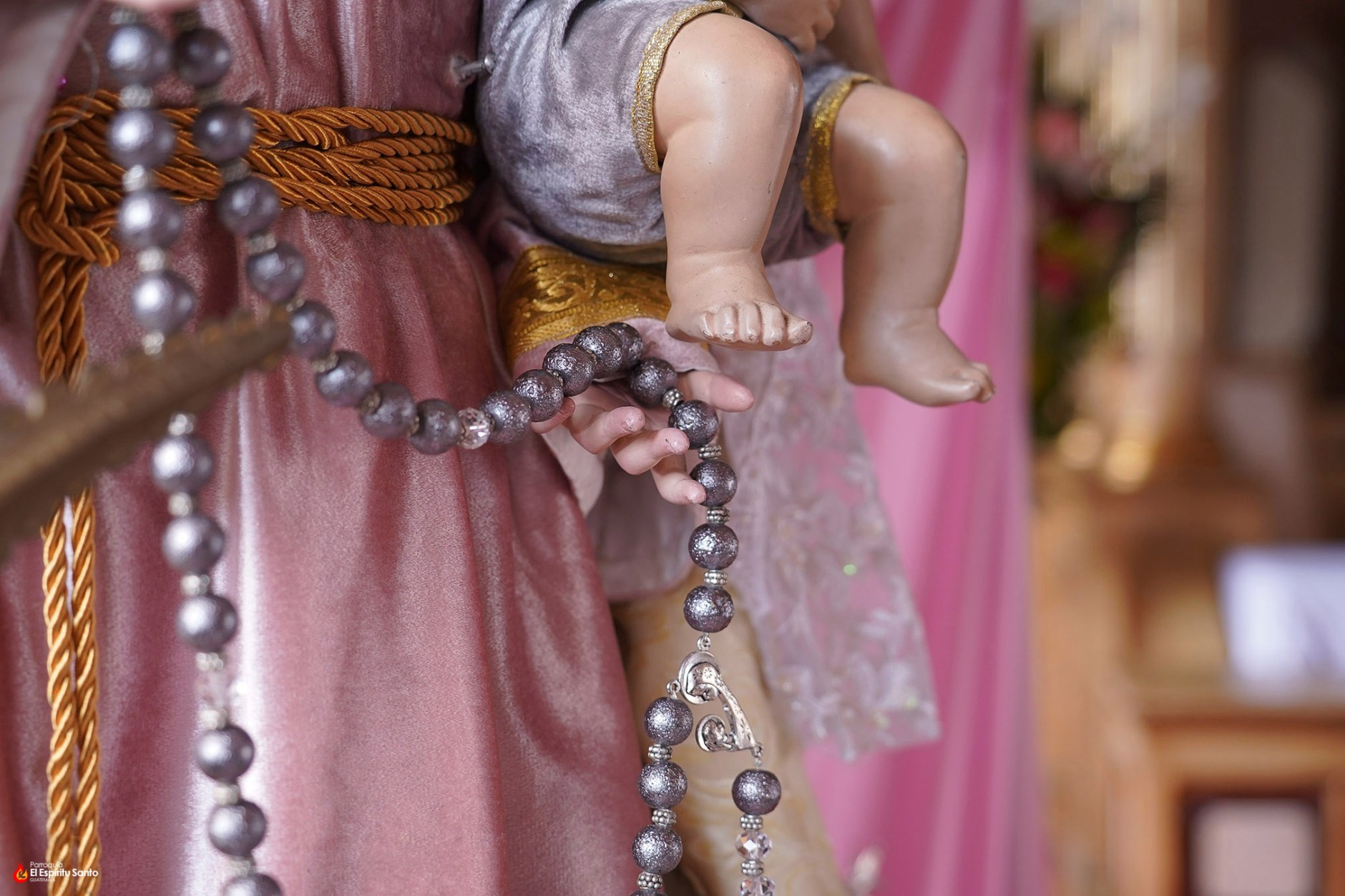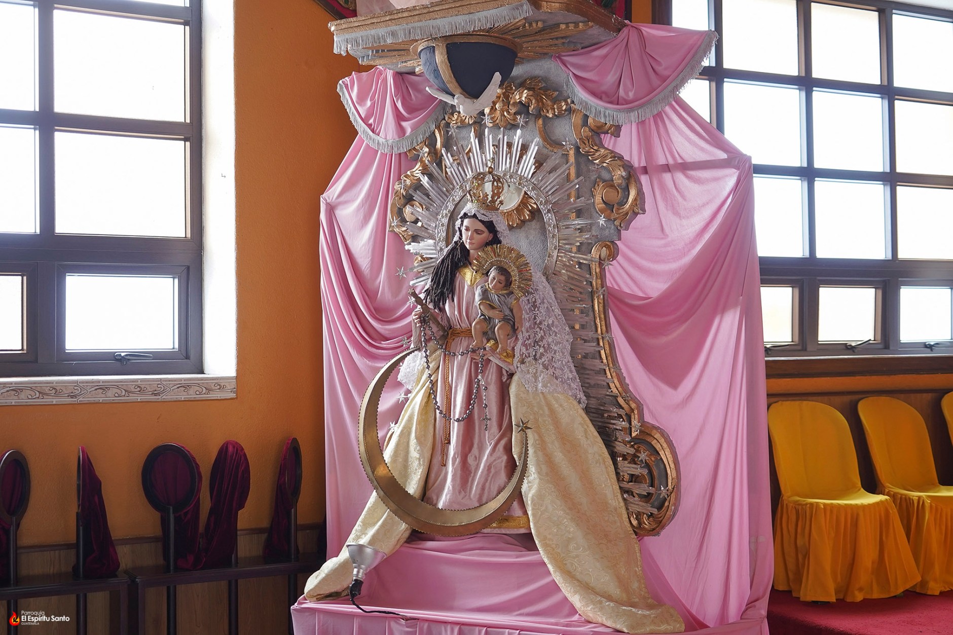 En un costado del presbiterio destaca la imagen de Nuestra Señora del Rosario, que ha sido situada en un altar especial, adornada con finas cortinas en tonos rosados y dorados. La Virgen aparece revestida con un elegante vestido rosado y un manto marfil, portando al Niño Jesús en sus brazos y sosteniendo un rosario, signo de oración y esperanza. A sus pies, la media luna con estrella recuerda su realeza y la victoria de María sobre el mal.