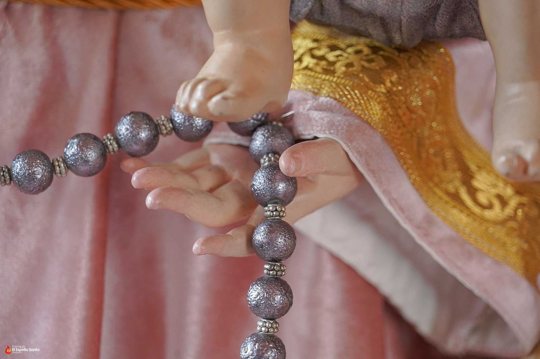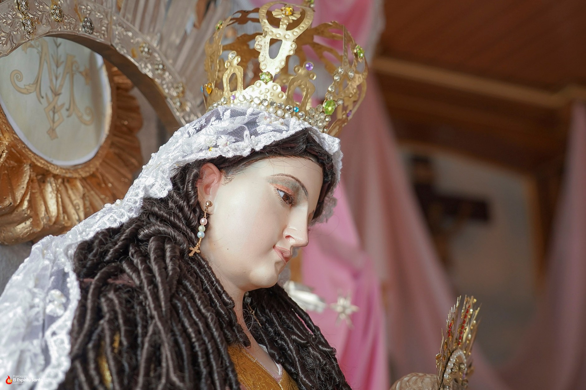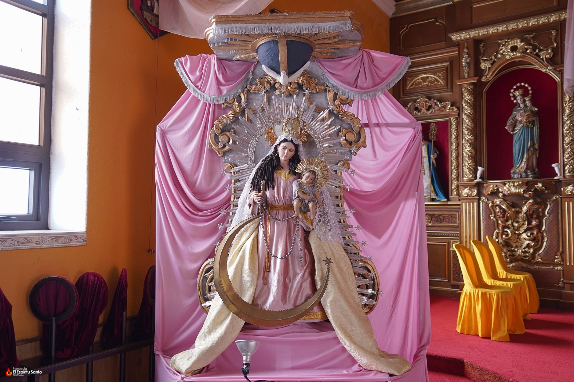 En un costado del presbiterio destaca la imagen de Nuestra Señora del Rosario, que ha sido situada en un altar especial, adornada con finas cortinas en tonos rosados y dorados. La Virgen aparece revestida con un elegante vestido rosado y un manto marfil, portando al Niño Jesús en sus brazos y sosteniendo un rosario, signo de oración y esperanza. A sus pies, la media luna con estrella recuerda su realeza y la victoria de María sobre el mal.