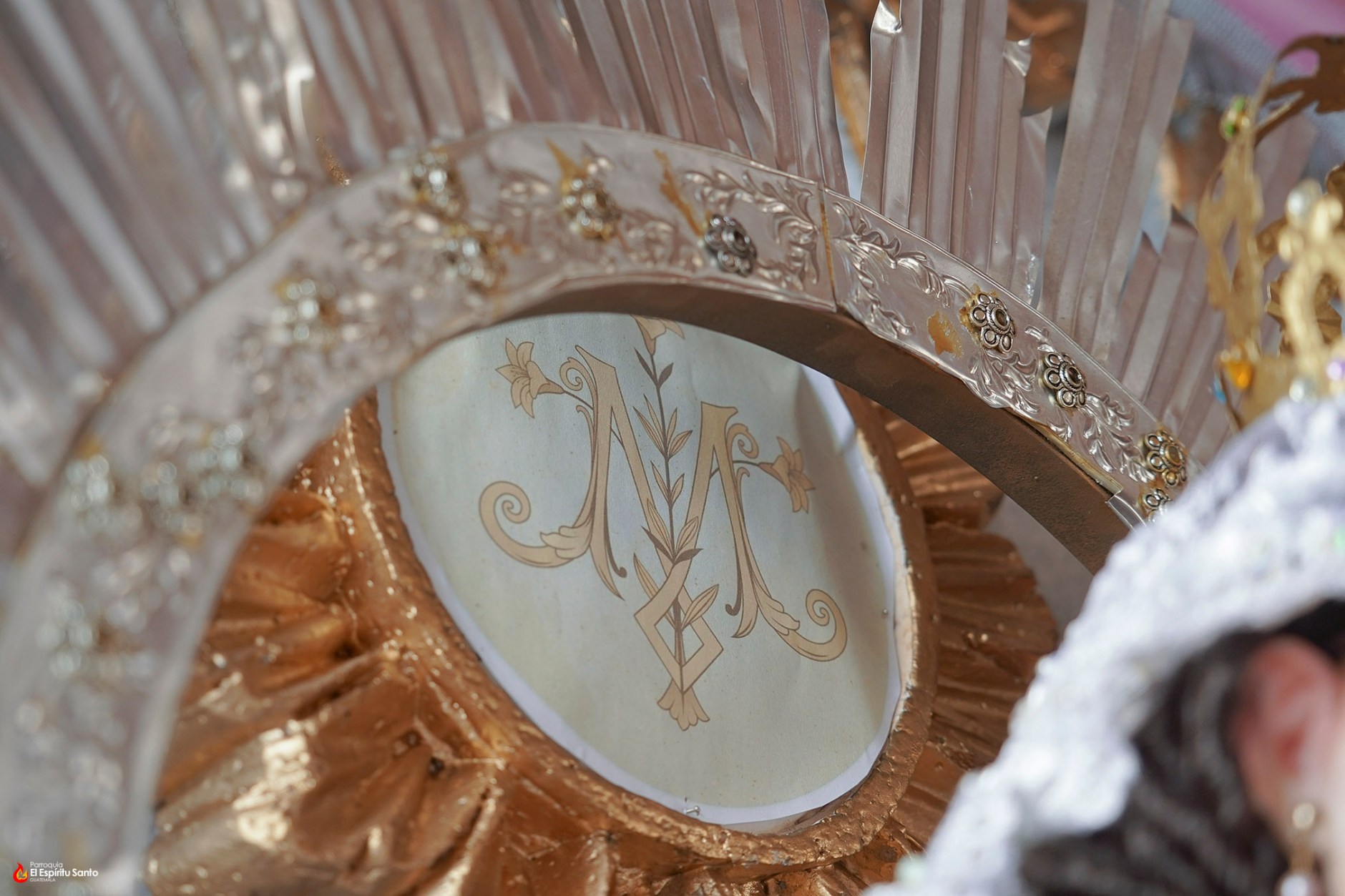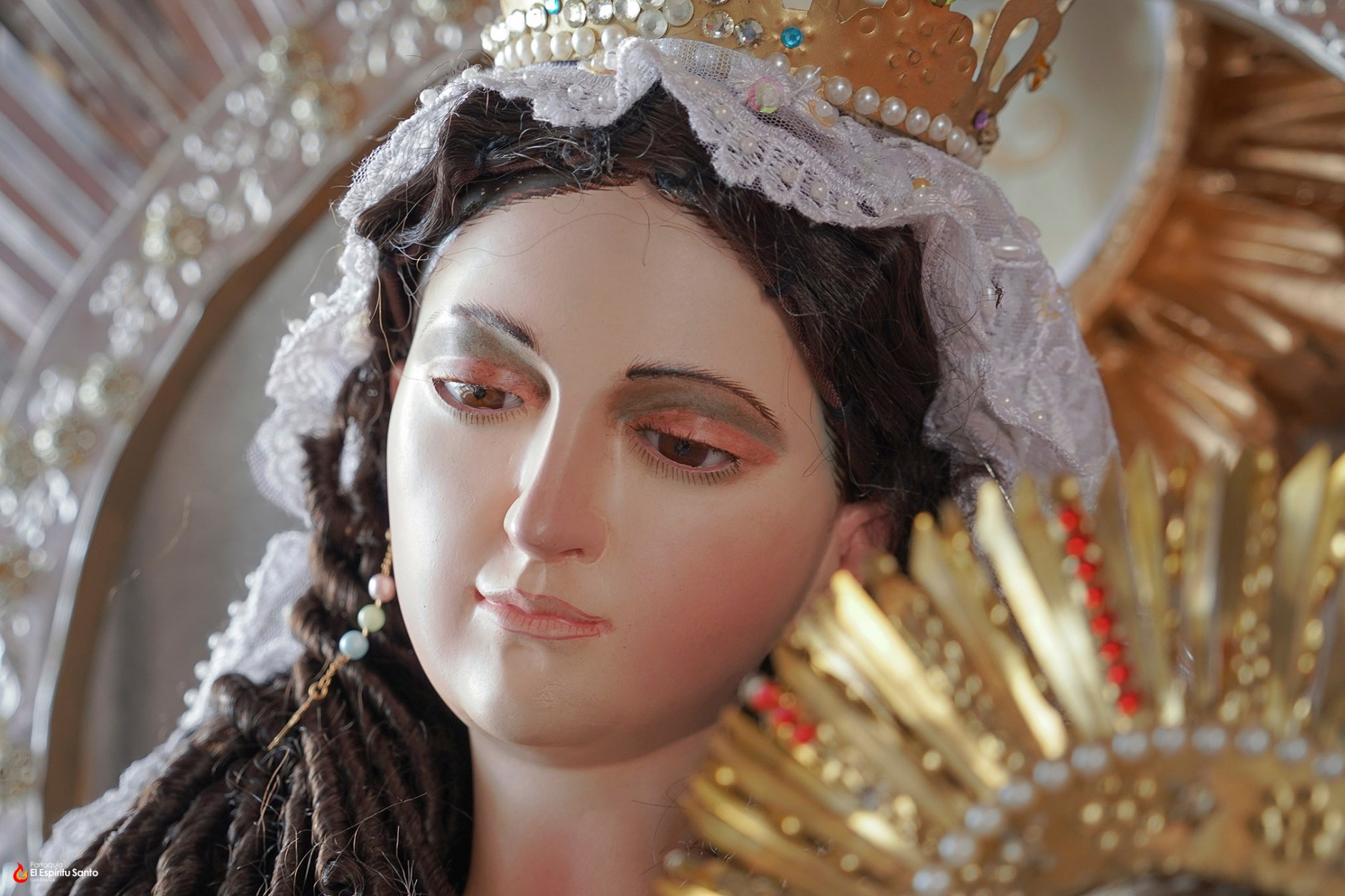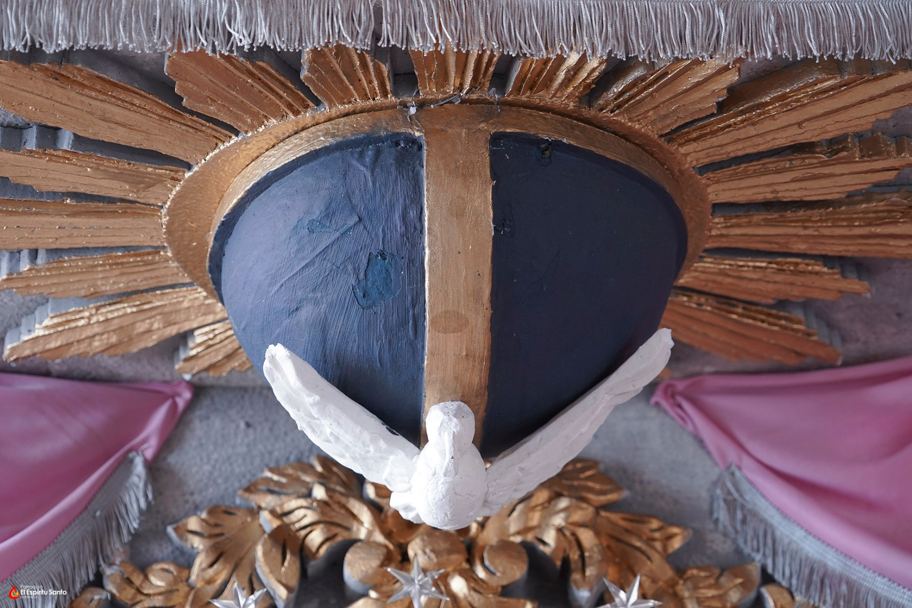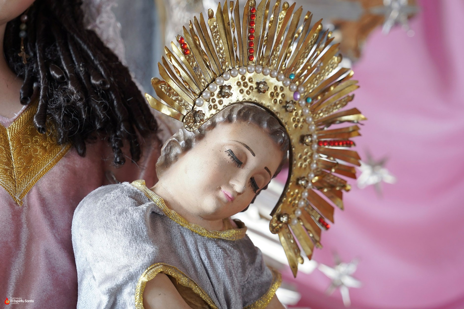 En un costado del presbiterio destaca la imagen de Nuestra Señora del Rosario, que ha sido situada en un altar especial, adornada con finas cortinas en tonos rosados y dorados. La Virgen aparece revestida con un elegante vestido rosado y un manto marfil, portando al Niño Jesús en sus brazos y sosteniendo un rosario, signo de oración y esperanza. A sus pies, la media luna con estrella recuerda su realeza y la victoria de María sobre el mal.