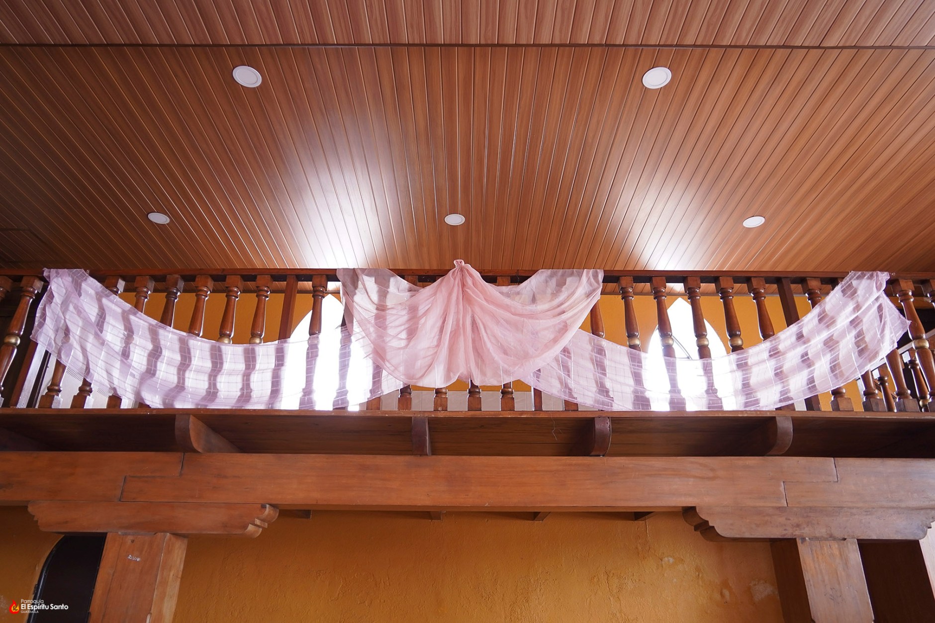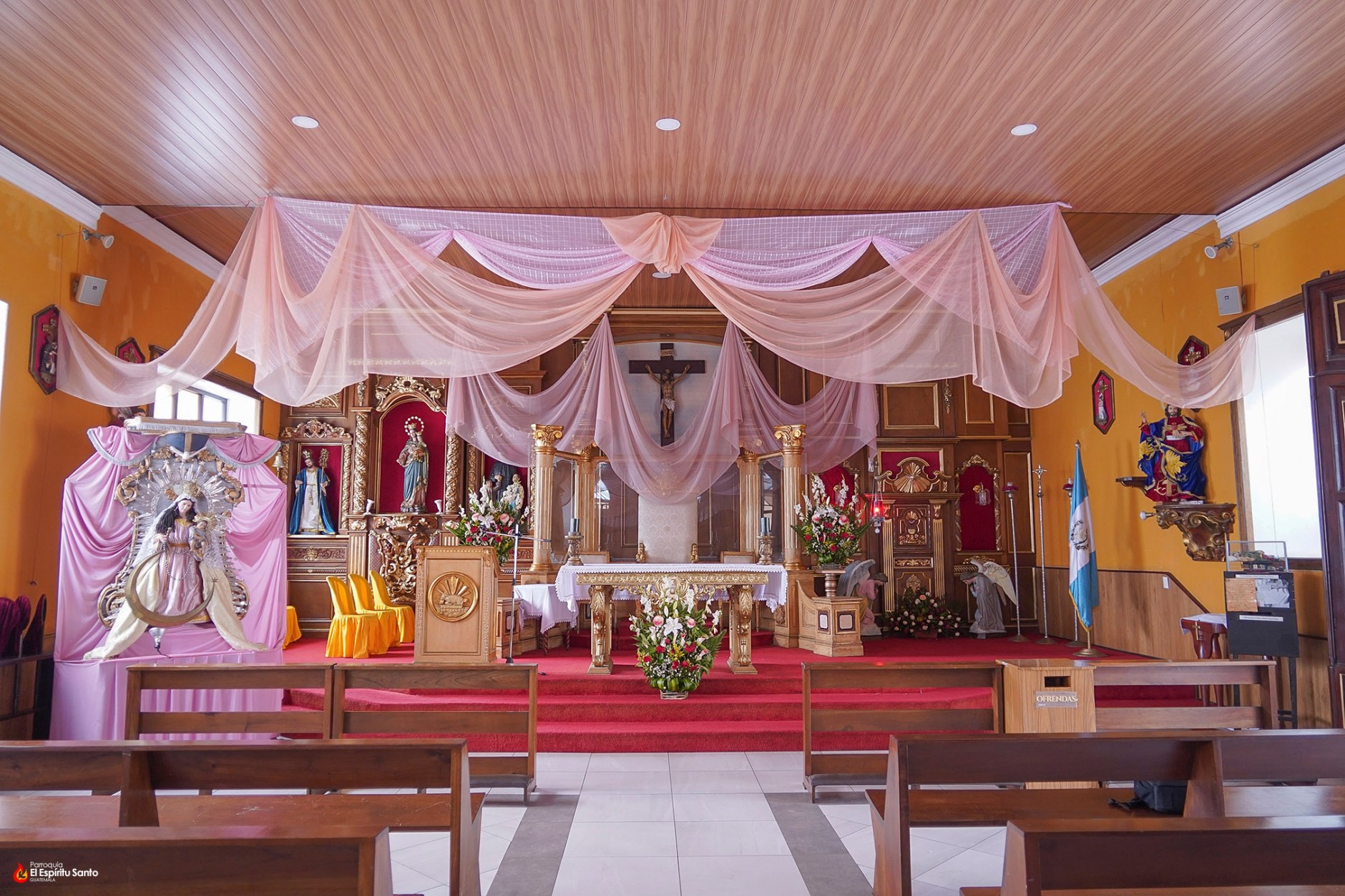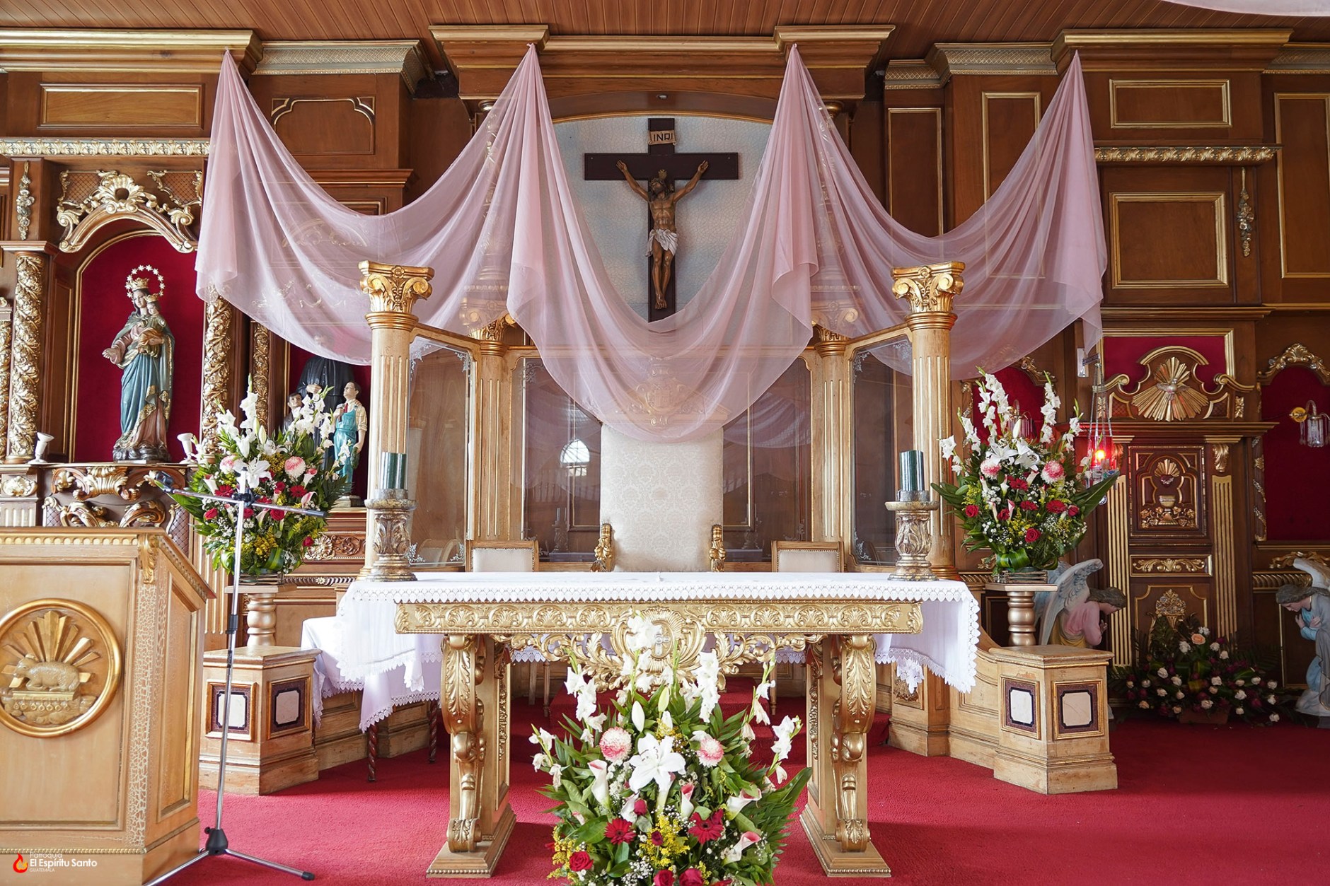 El altar mayor también luce bellamente decorado con cortinas de tul en color rosado, que enmarcan el crucifijo central y las imágenes laterales. El conjunto, acompañado por arreglos florales y luces suaves, crea un ambiente de recogimiento y alegría, invitando a los fieles a vivir intensamente este mes dedicado a la Madre de Dios.