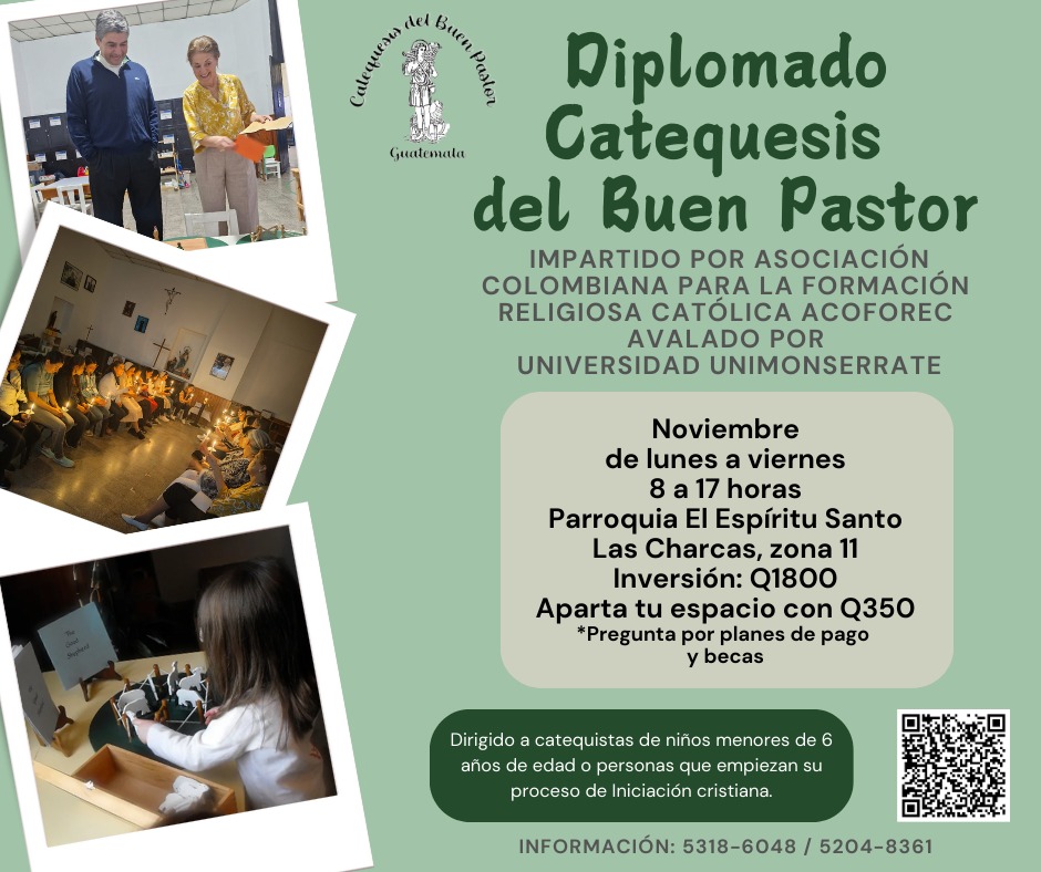 Durante el mes de noviembre, de lunes a viernes de 8:00 a 17:00 horas, se llevará a cabo el Diplomado Catequesis del Buen Pastor, impartido por la Asociación Colombiana para la Formación Religiosa Católica (ACOFOREC) y avalado por la Universidad Unimonserrate.