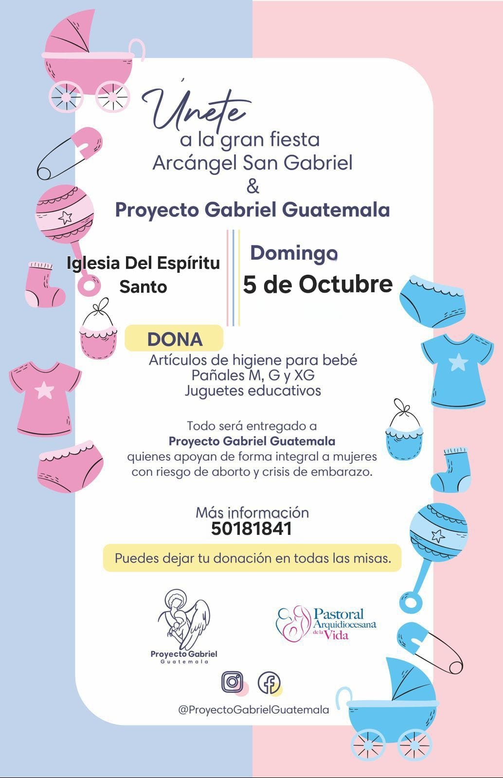 Durante esta jornada se invita a toda la comunidad a donar artículos de higiene para bebé, pañales en tallas M, G y XG, así como juguetes educativos, los cuales serán entregados al Proyecto Gabriel Guatemala. Esta iniciativa brinda apoyo integral a mujeres que enfrentan riesgo de aborto o atraviesan una crisis de embarazo, acompañándolas en sus necesidades físicas, emocionales y espirituales.