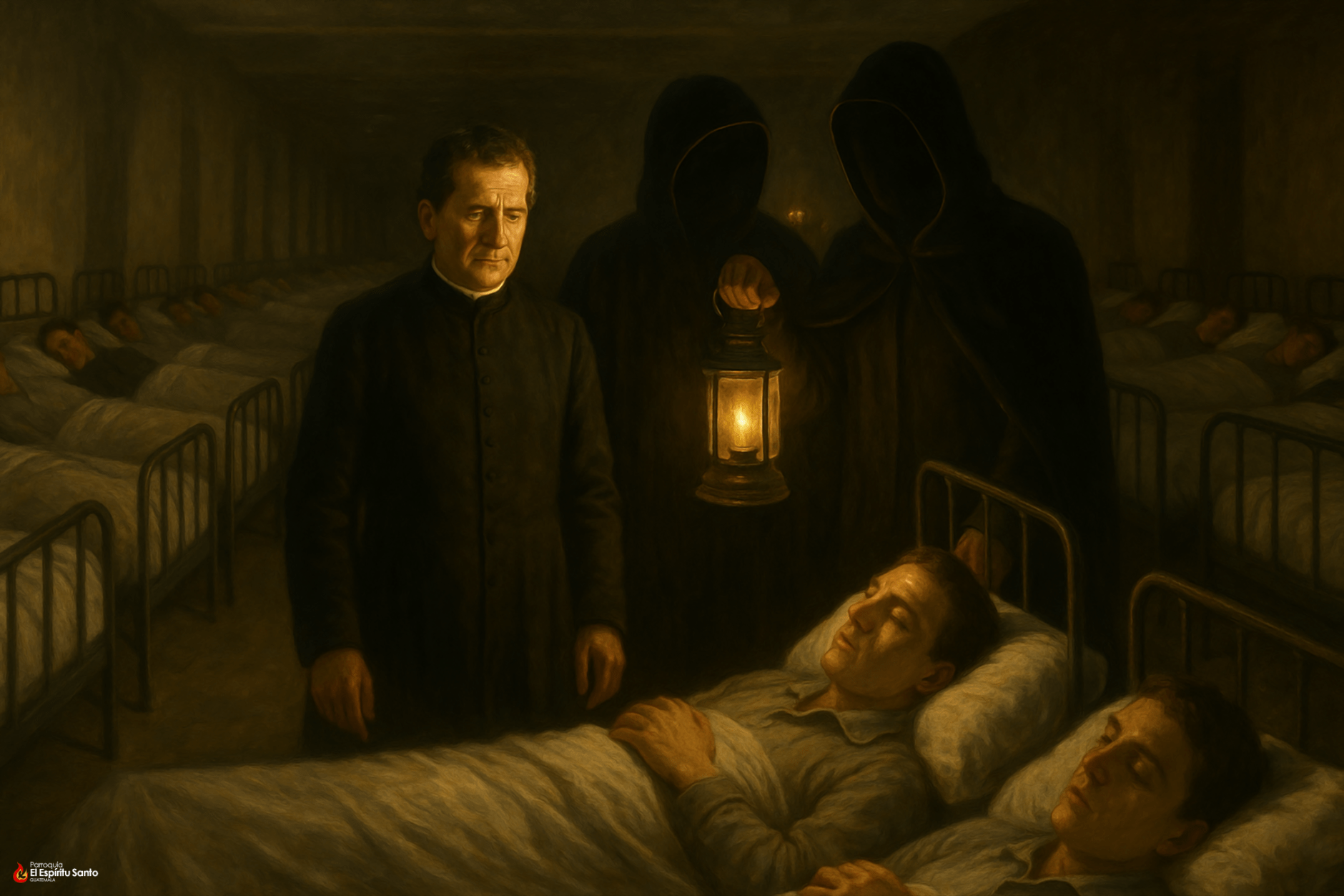 Soñé que un personaje misterioso me llevaba a pasear por los dormitorios y que con una lámpara que llevaba en sus manos iba iluminando la frente de los alumnos que dormían y daba a conocer el estado en que tenían su alma. Unos tenían la frente totaklmente blanca. (El alma en gracia y sin pecado). Otros tenían la frente surcada por algunas rayas negras (pecados veniales), y algunos tenían la frente negra como una noche oscura (están en pecados mortales).